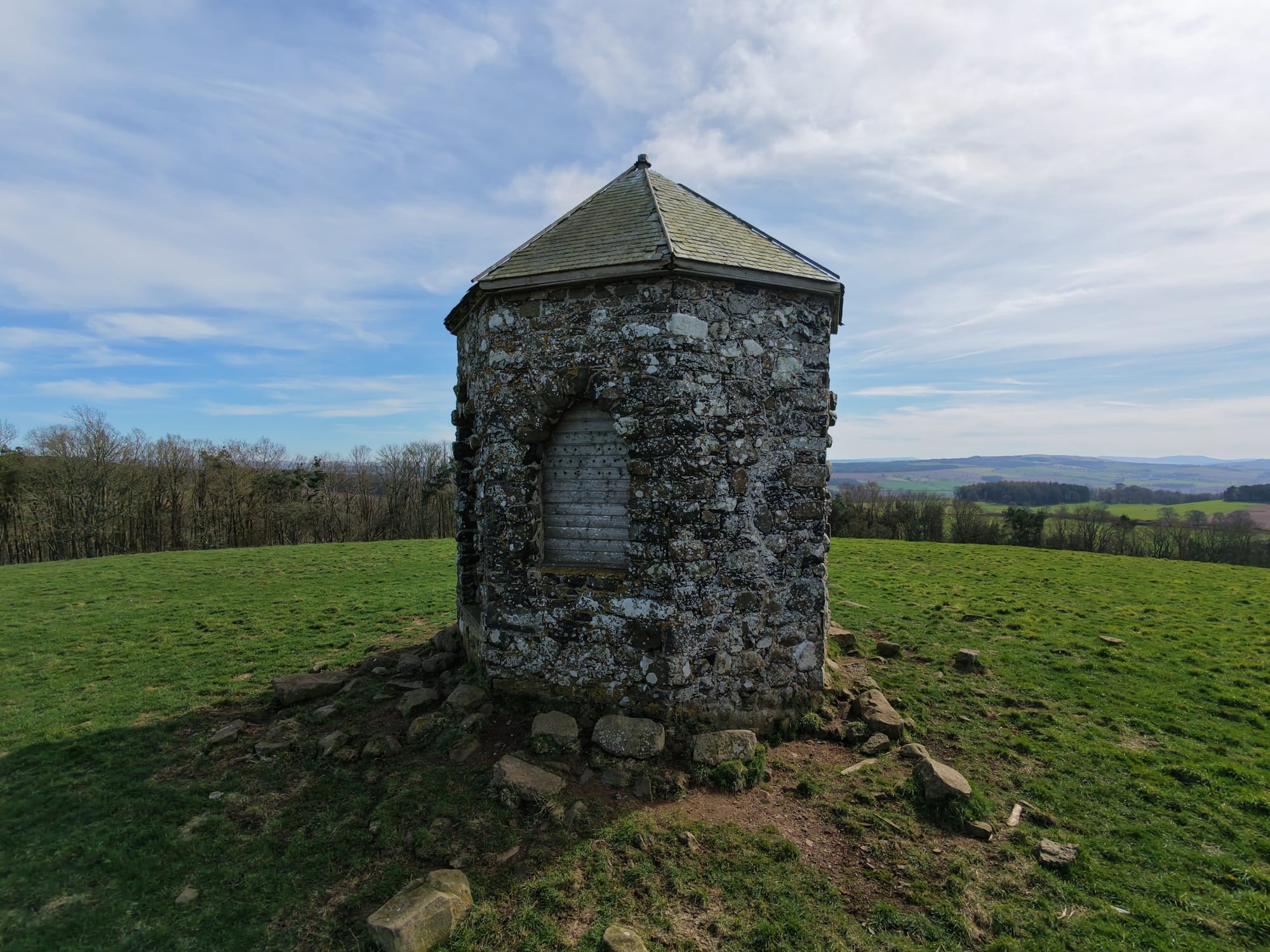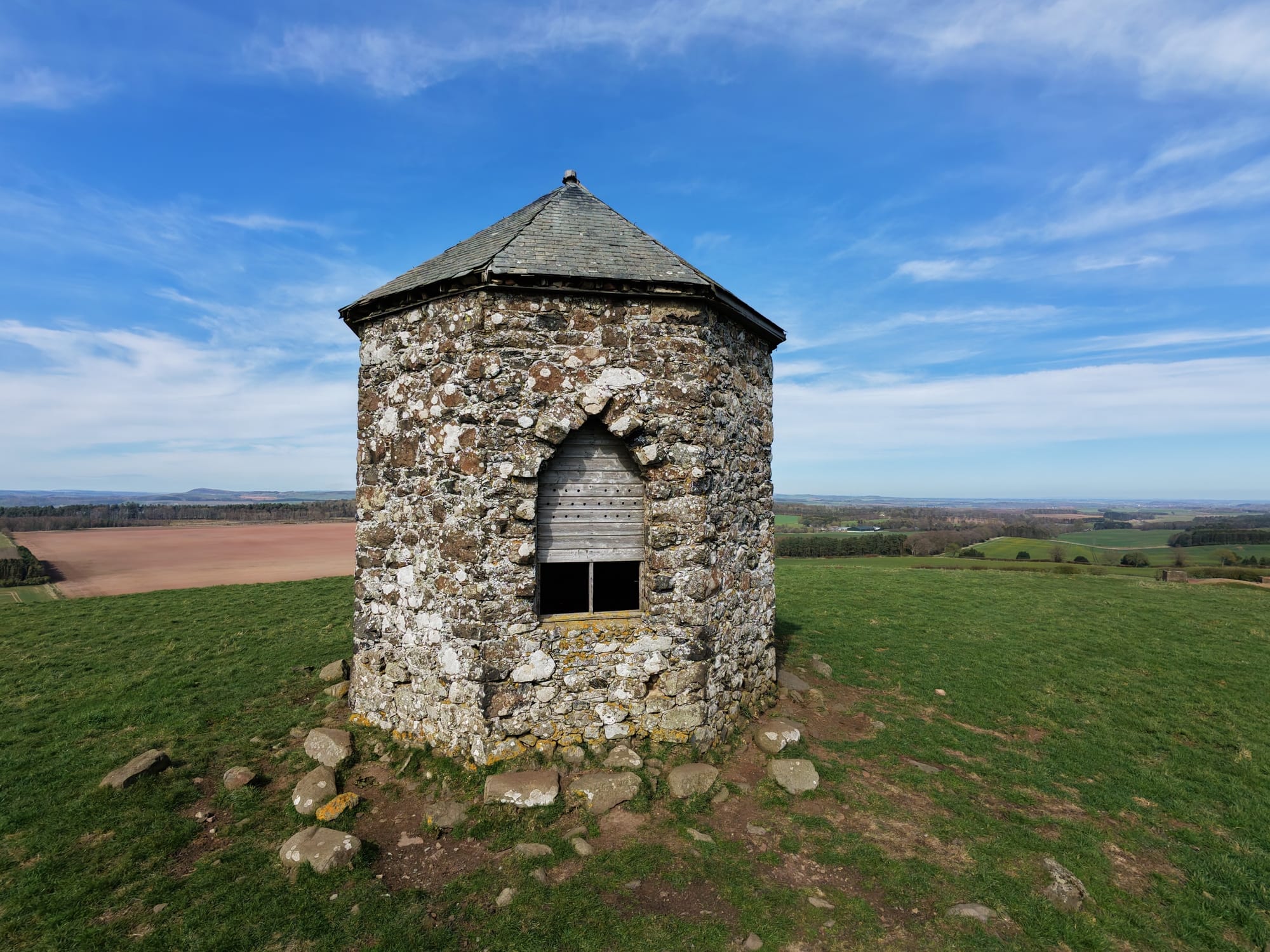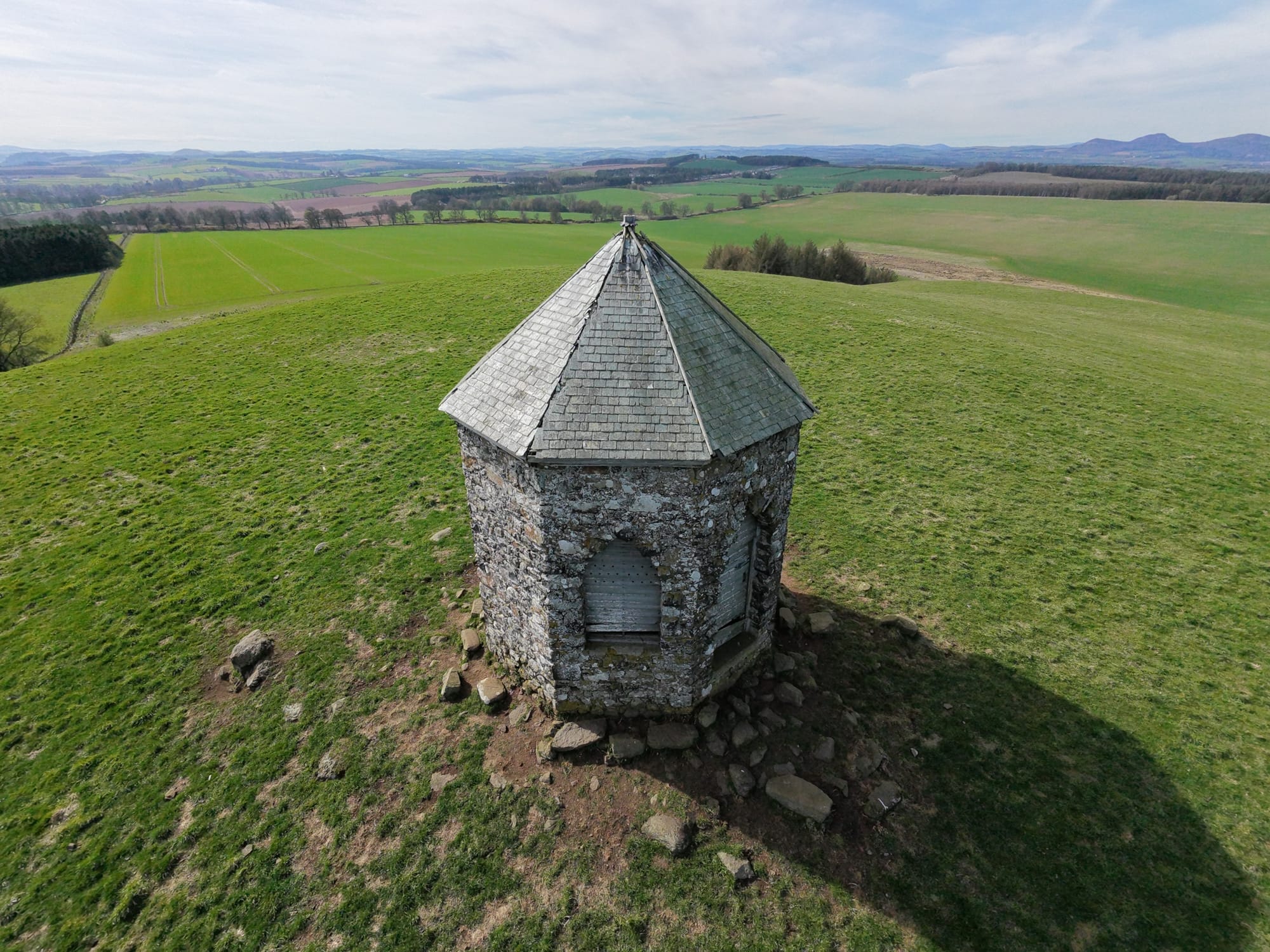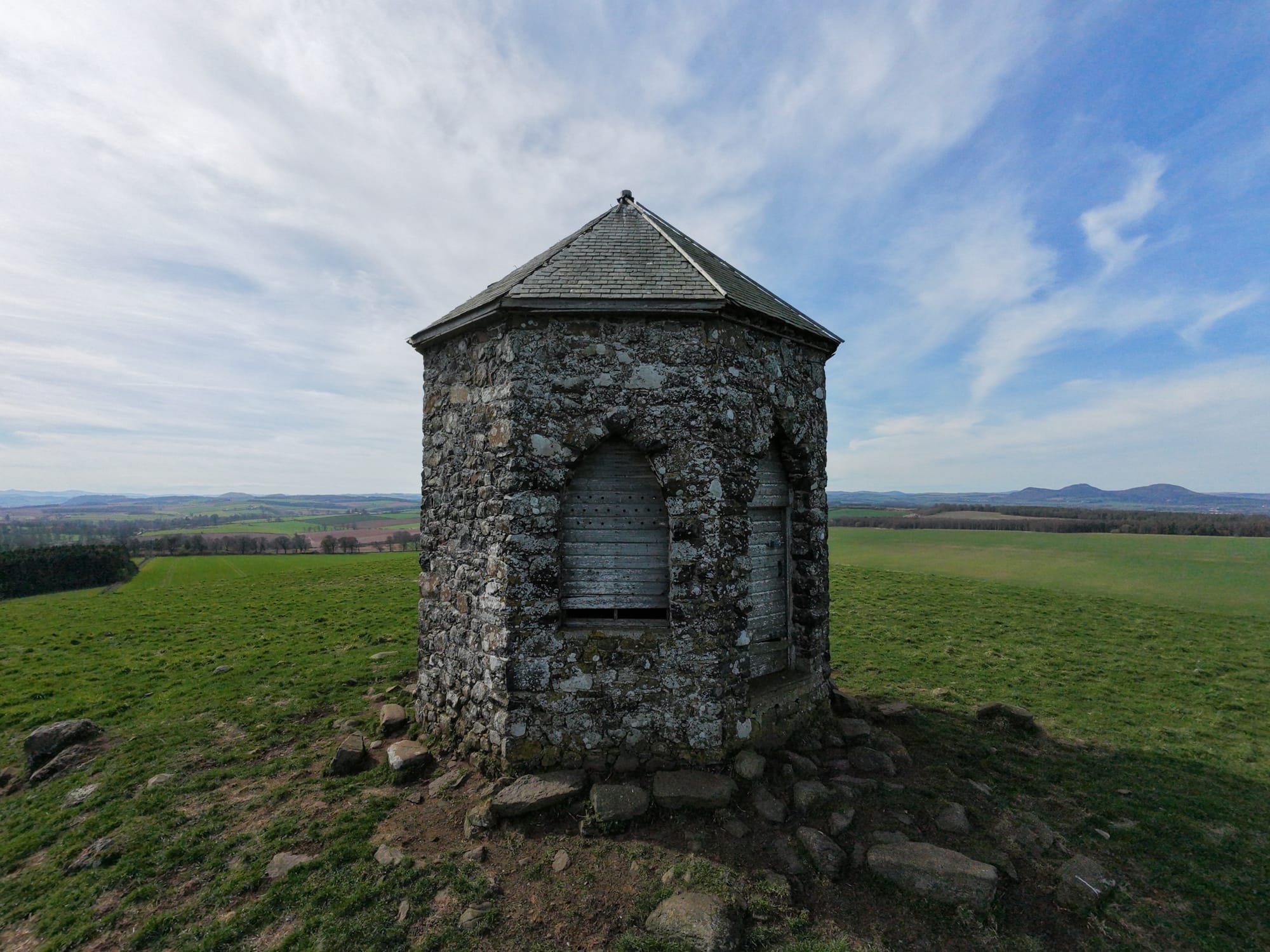 The Baron's Folly is an octagonal tower built on Down Law, which he used for watching over his estate, admiring views (including the Waterloo Monument), and potentially entertaining visitors. This striking octagonal structure features elegant Gothic-style pointed windows on three sides, all crowned by a classic Welsh slate roof. Though the folly has fallen into disrepair, it still stands tall as a striking landmark across the Borders landscape.