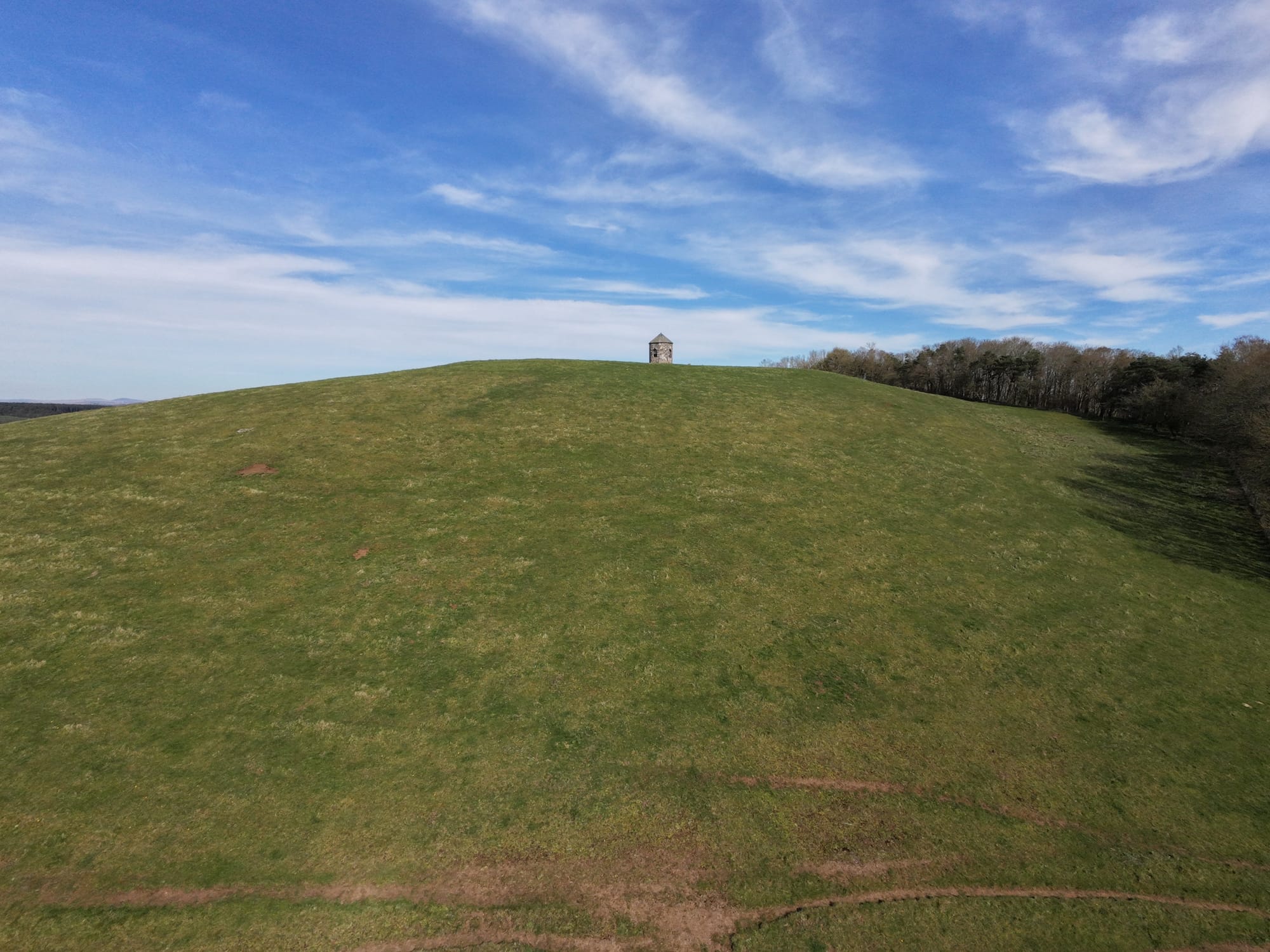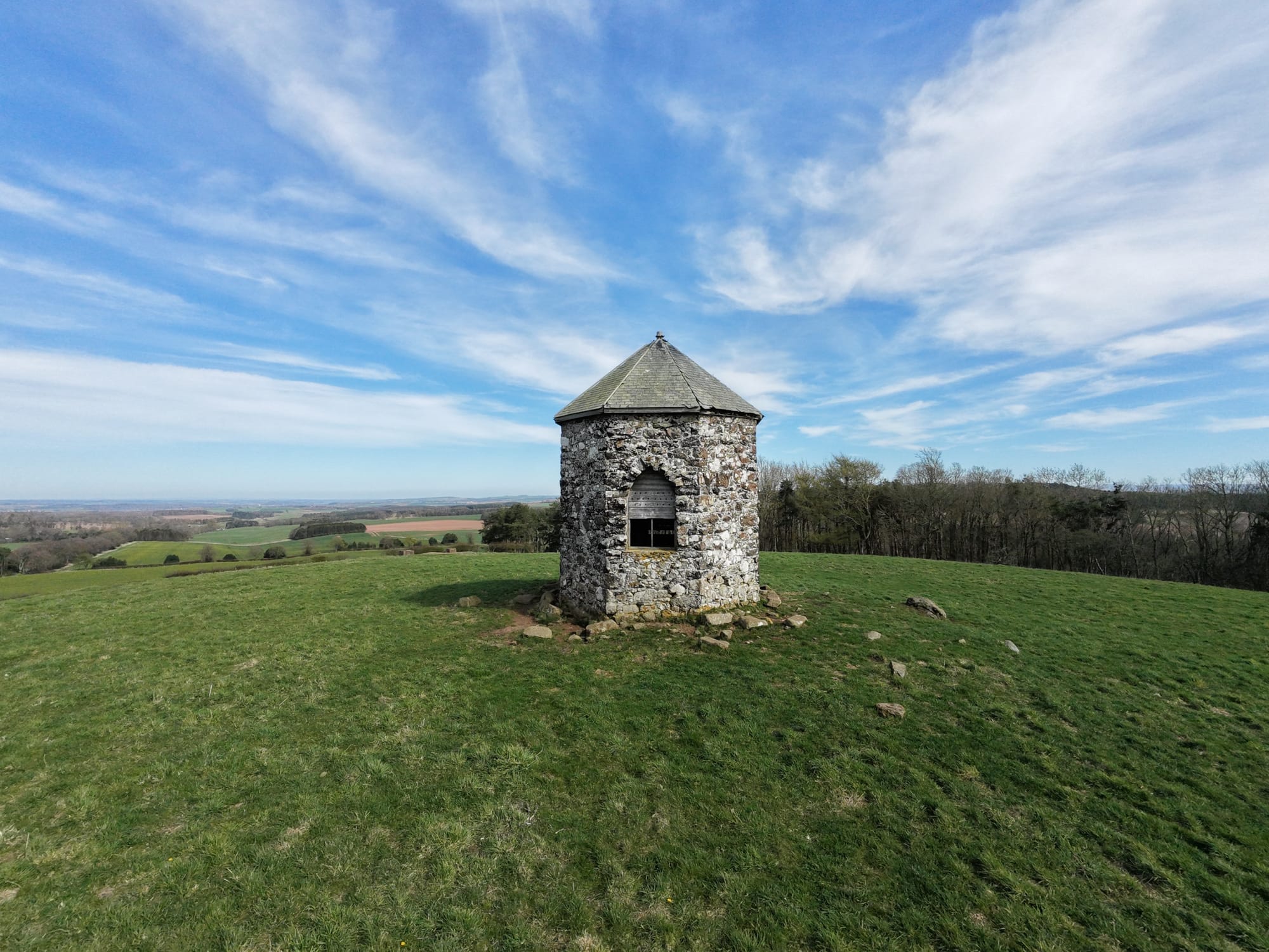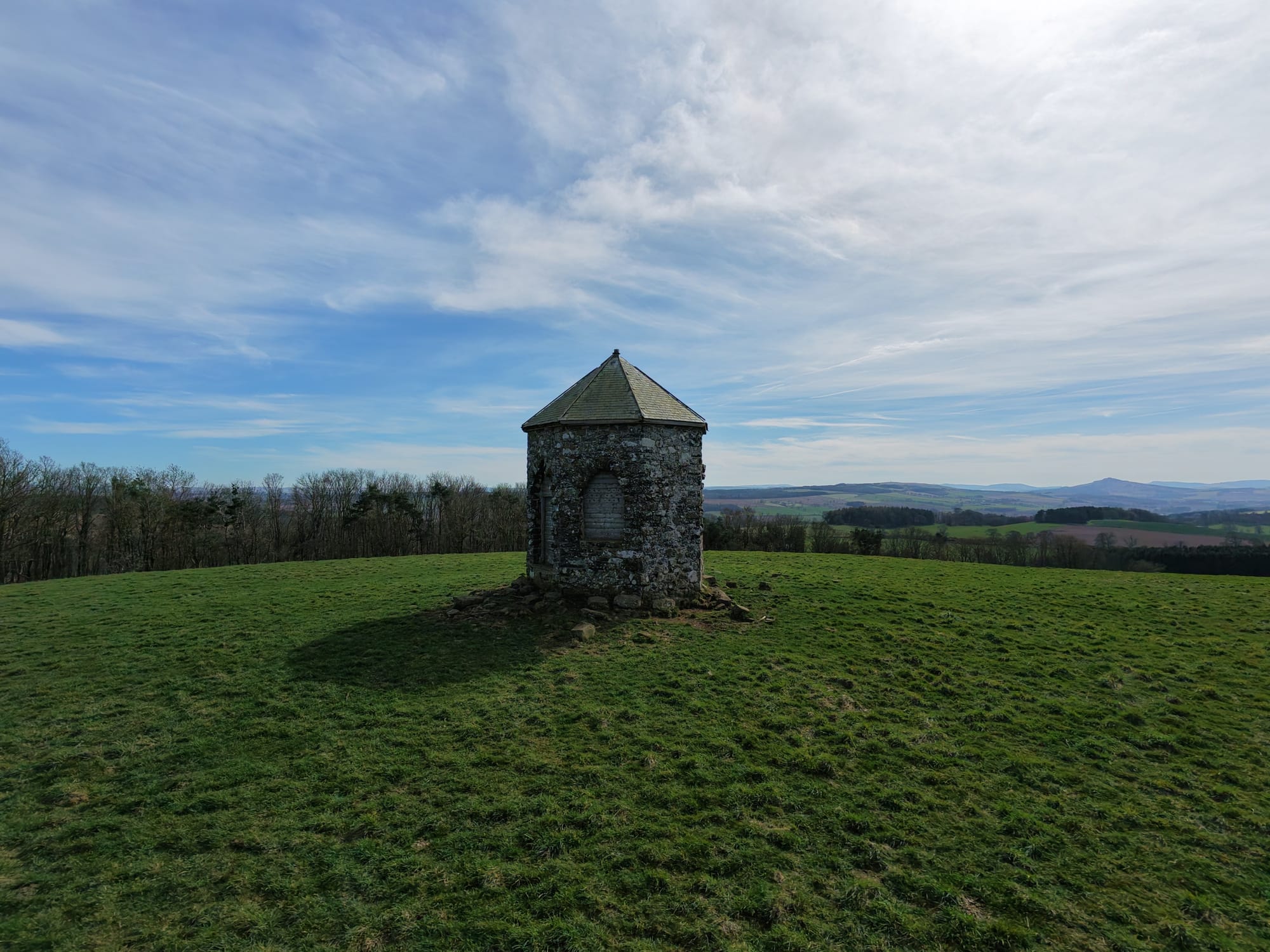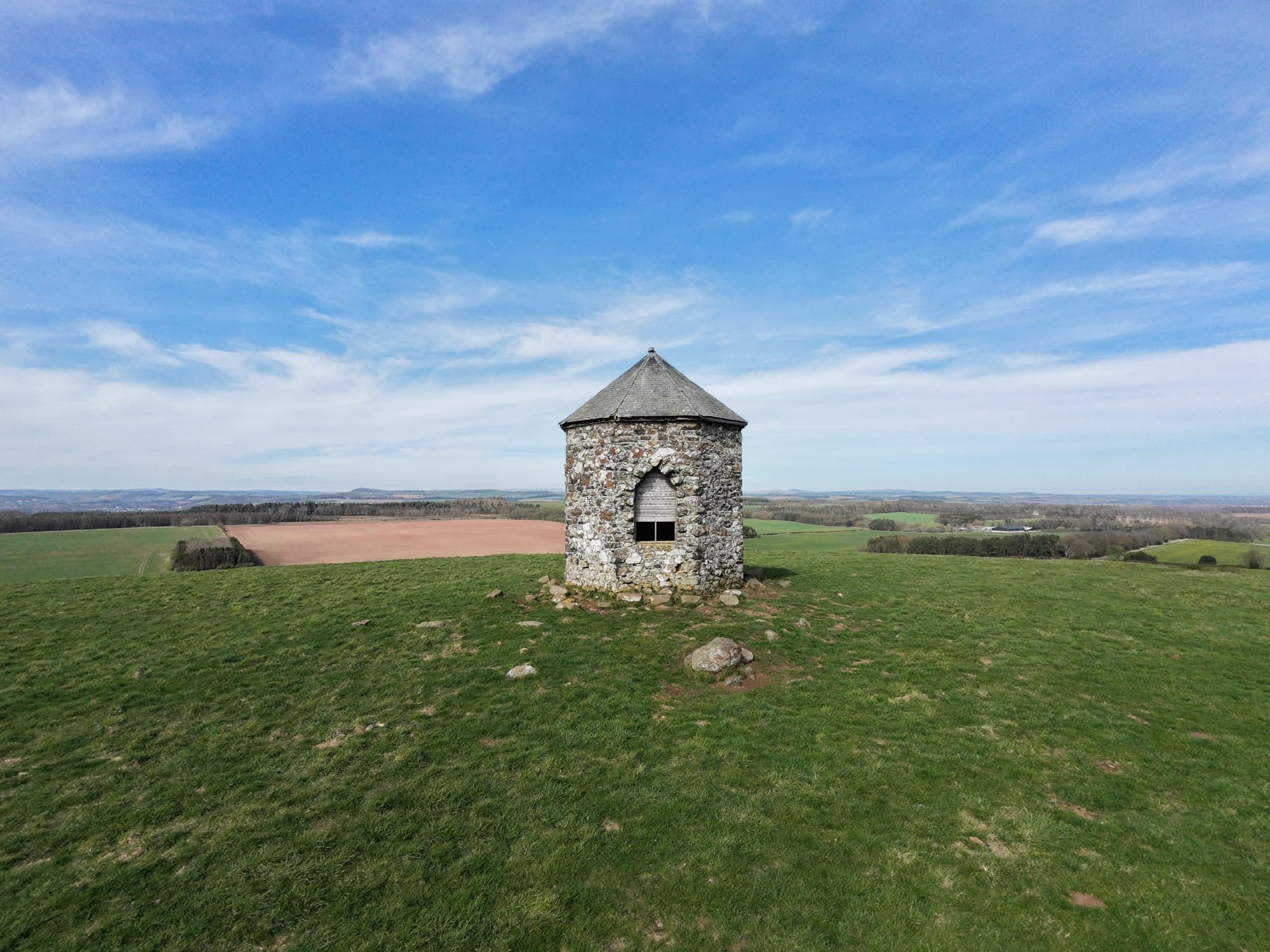 The Baron's Folly is an octagonal tower built on Down Law, which he used for watching over his estate, admiring views (including the Waterloo Monument), and potentially entertaining visitors. This striking octagonal structure features elegant Gothic-style pointed windows on three sides, all crowned by a classic Welsh slate roof. Though the folly has fallen into disrepair, it still stands tall as a striking landmark across the Borders landscape.