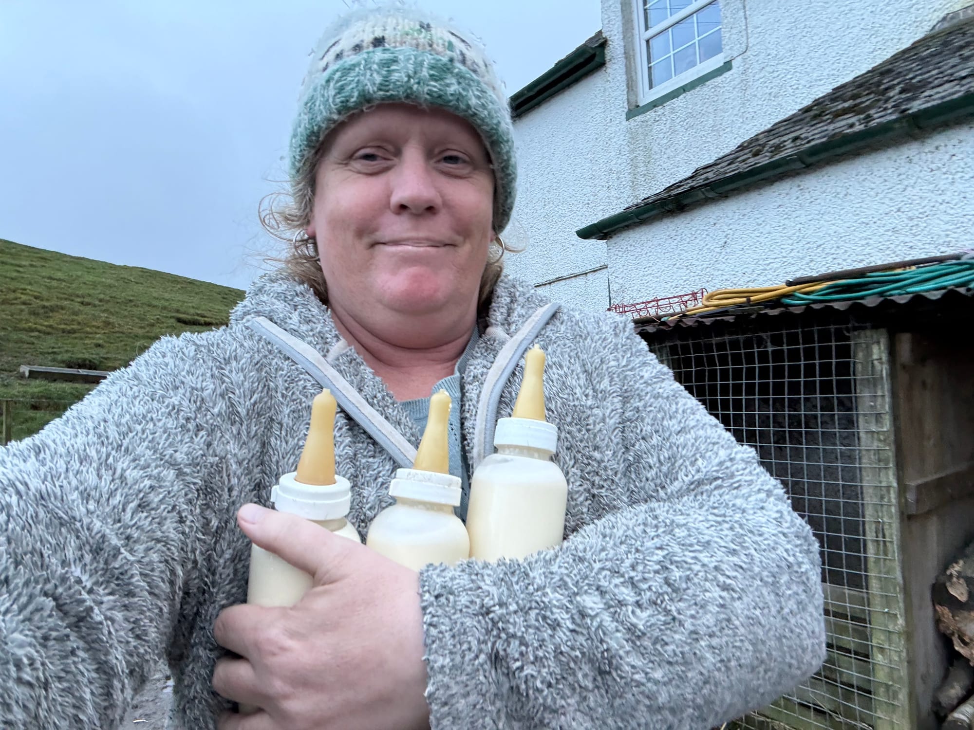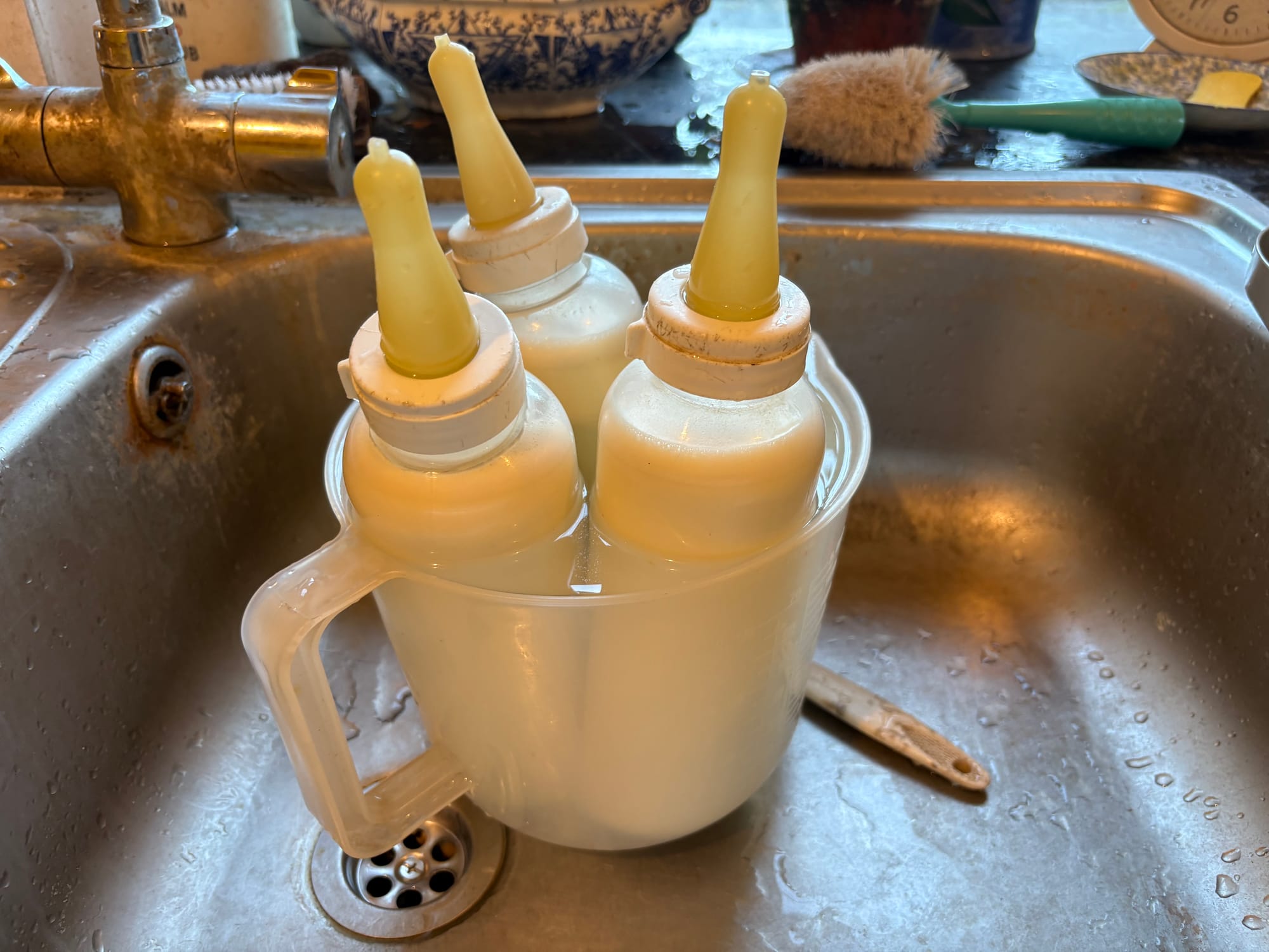 Three bottles of warm milk are ready for our hungry cade lambs.