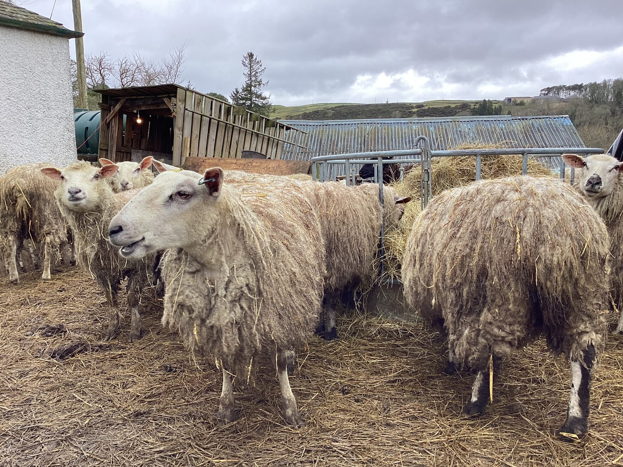 I visited the grass keep to check on the flock. When we got close, the sheep seemed restless, which made me think they might have had some unexpected visitors. One side of the field has a walkway with a great view of the Eildons. The grass is especially green where the sheep were fed last year. After about ten minutes, the sheep settled down and recognised us.