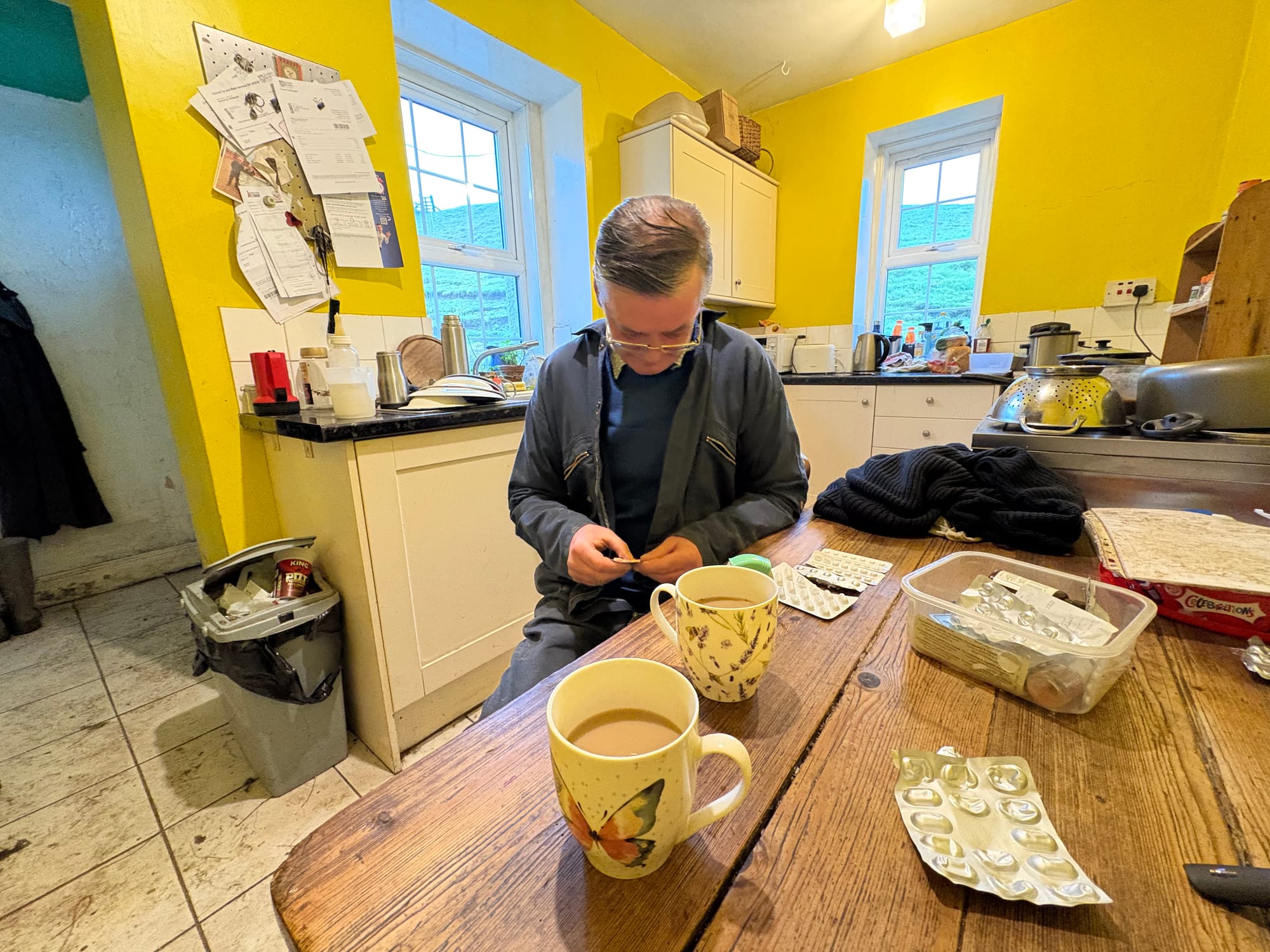 We begin our day by taking medication. Both of us have health issues, but Charlie’s are more serious.