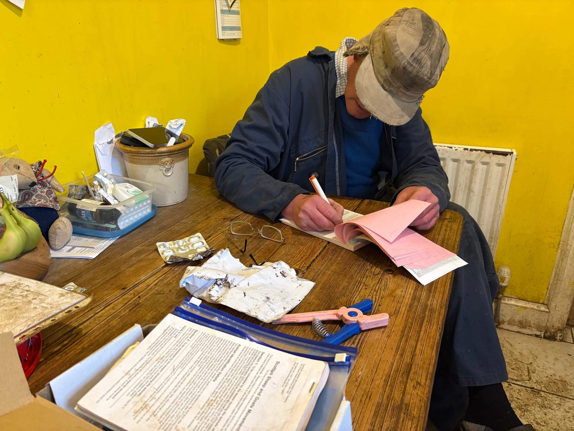 Charlie records the sheep’s ear tag numbers in the movement book, copying them from the back of an old envelope.