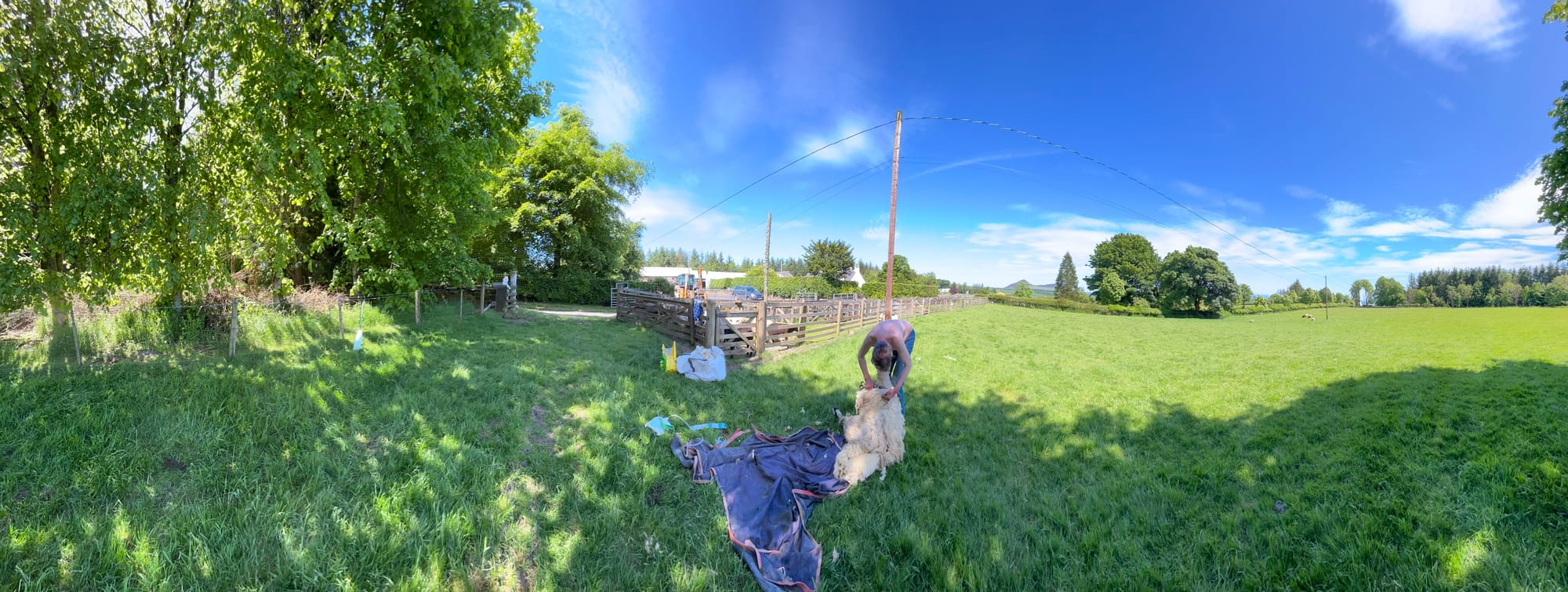Only half the flock showed up to feed. Most of the lambs were suspicious, which was ironic since we needed to worm them for fluke. I filmed a lot of the shearing in portrait mode, but this Linux video editor won't resize or render it for the website. On the way to Denholm, we passed a horse box and watched a farmer baling silage.