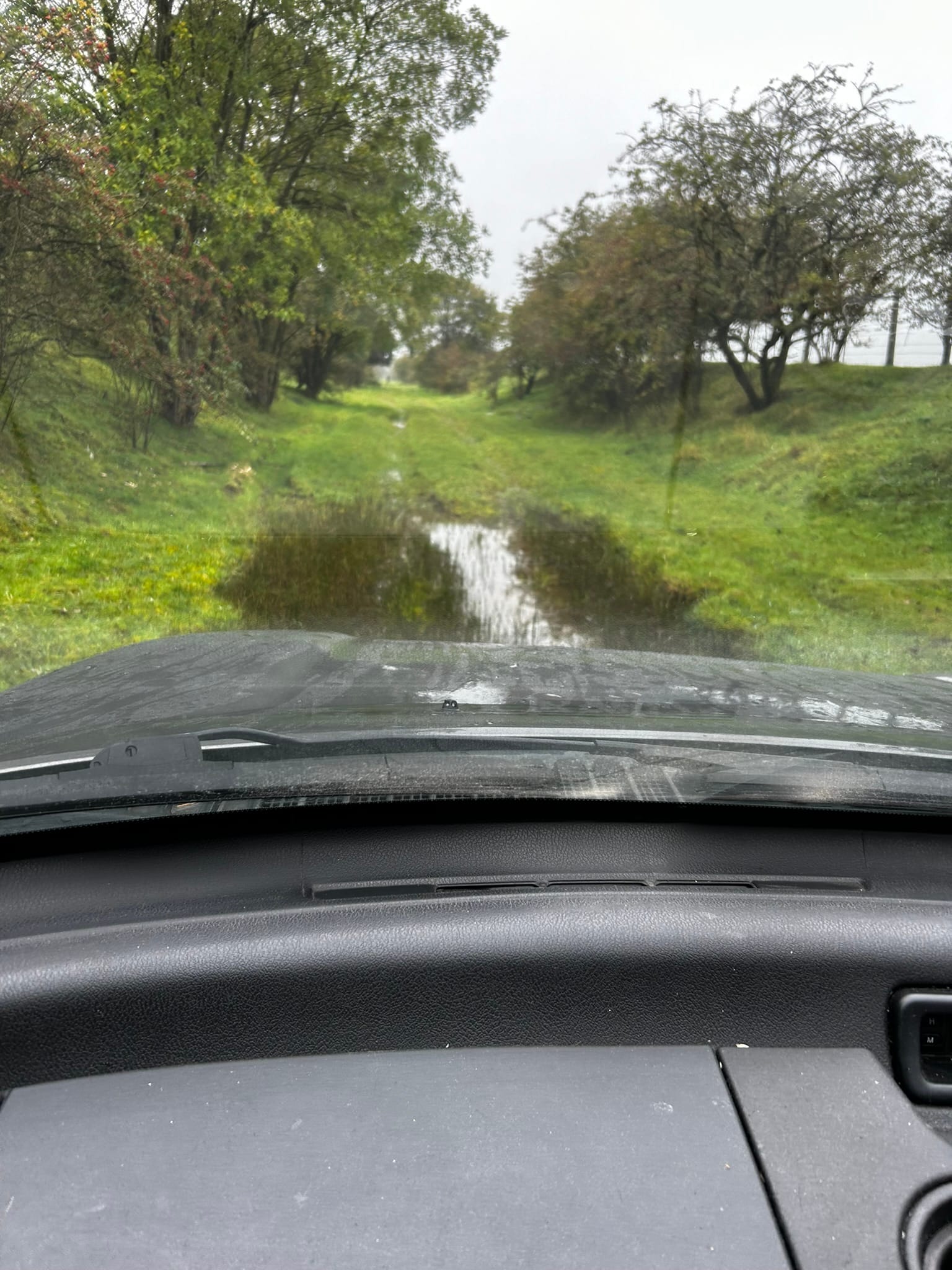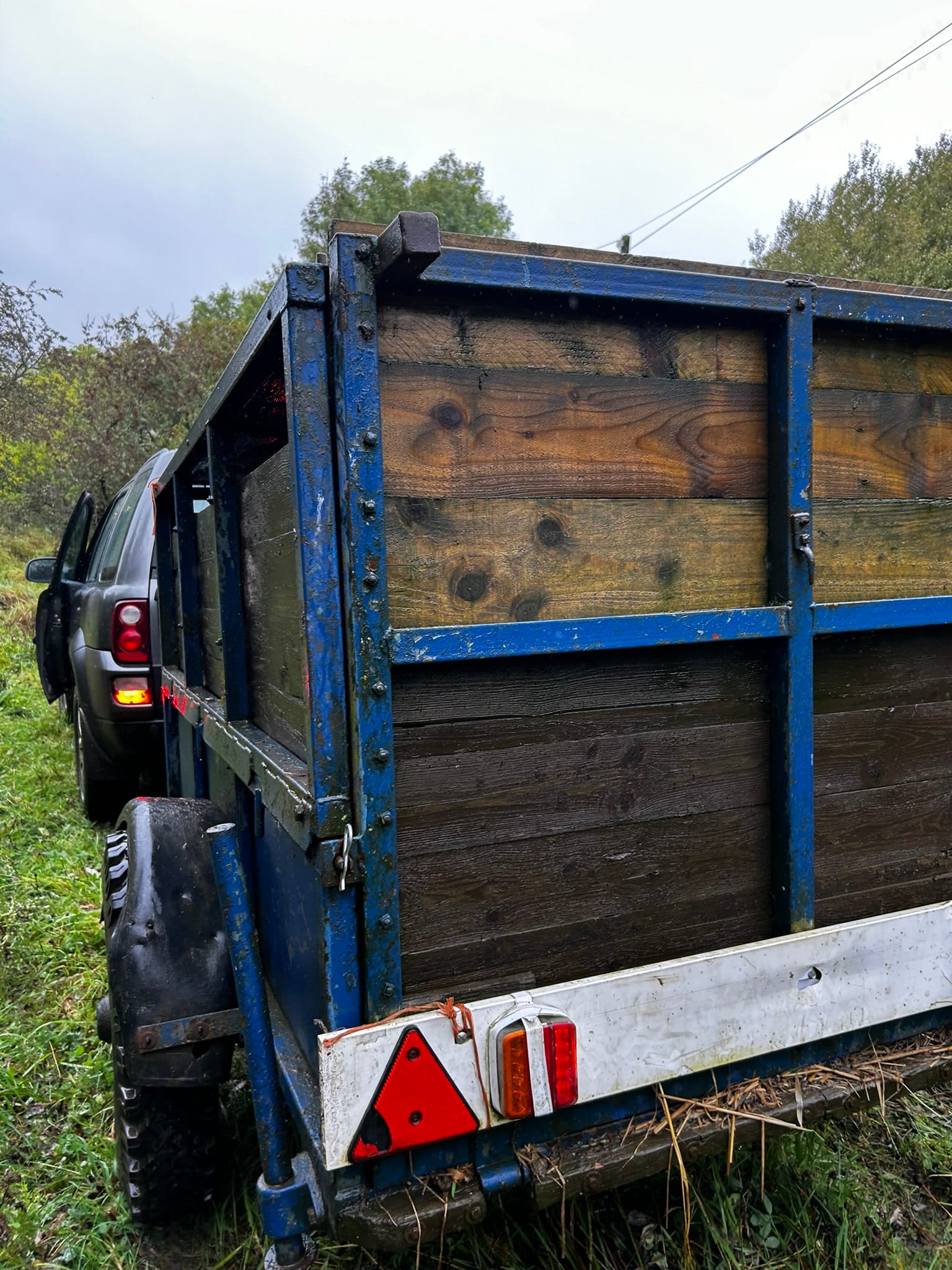 We had no trouble leaving the field with our loaded trailer until we hit an incline after a sharp right turn. The 4x4’s road tyres, not meant for off-road, spun and steamed as Charlie tried to steer through the wet, tall grass. Just eight feet from the gate, the 4x4 lost traction, but Hamish kindly gave us a tow.