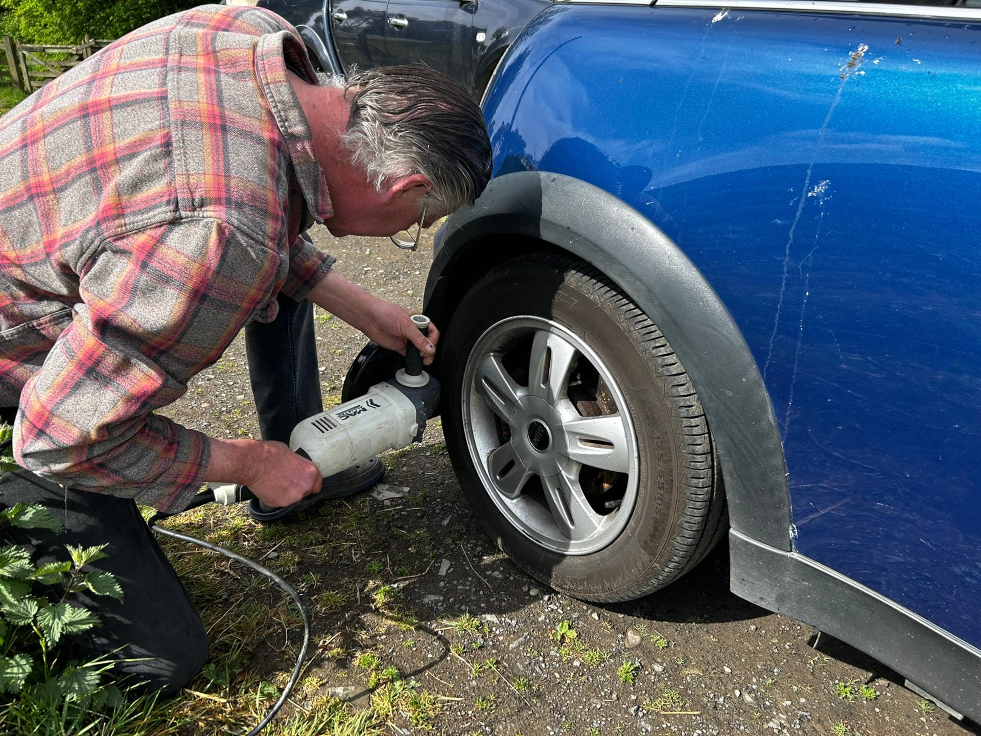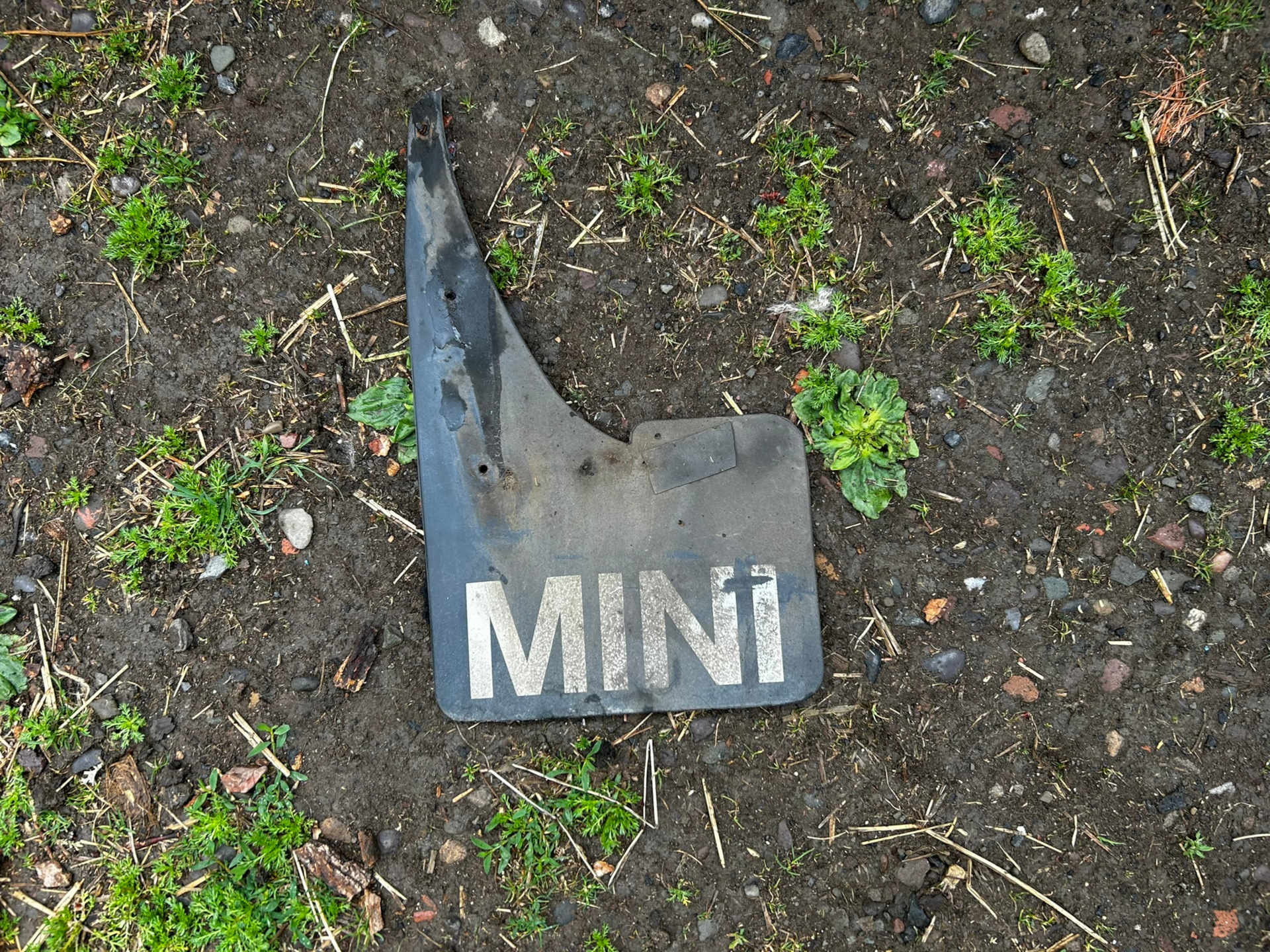 This morning, we removed the mud flaps and spotlights from our Mini Cooper.