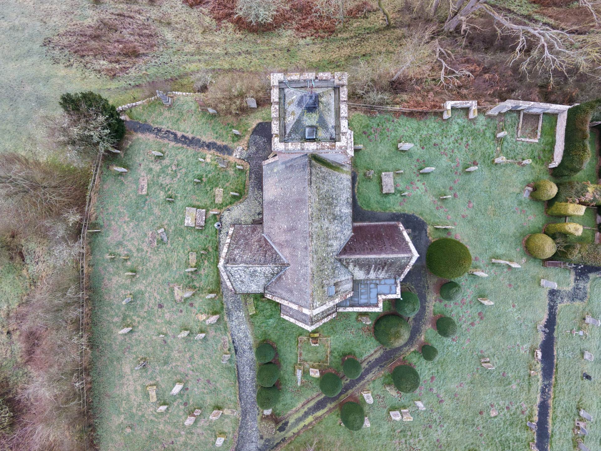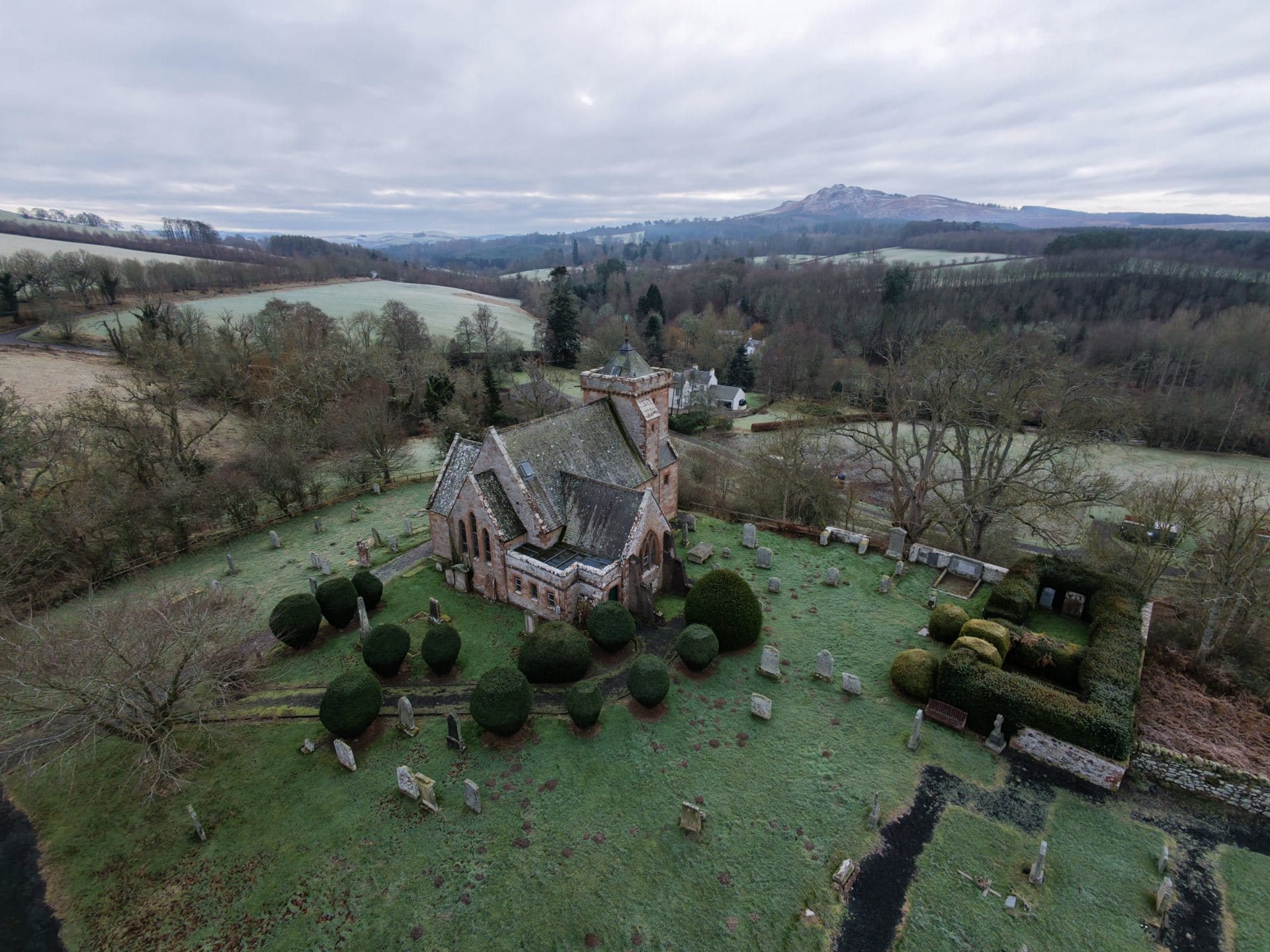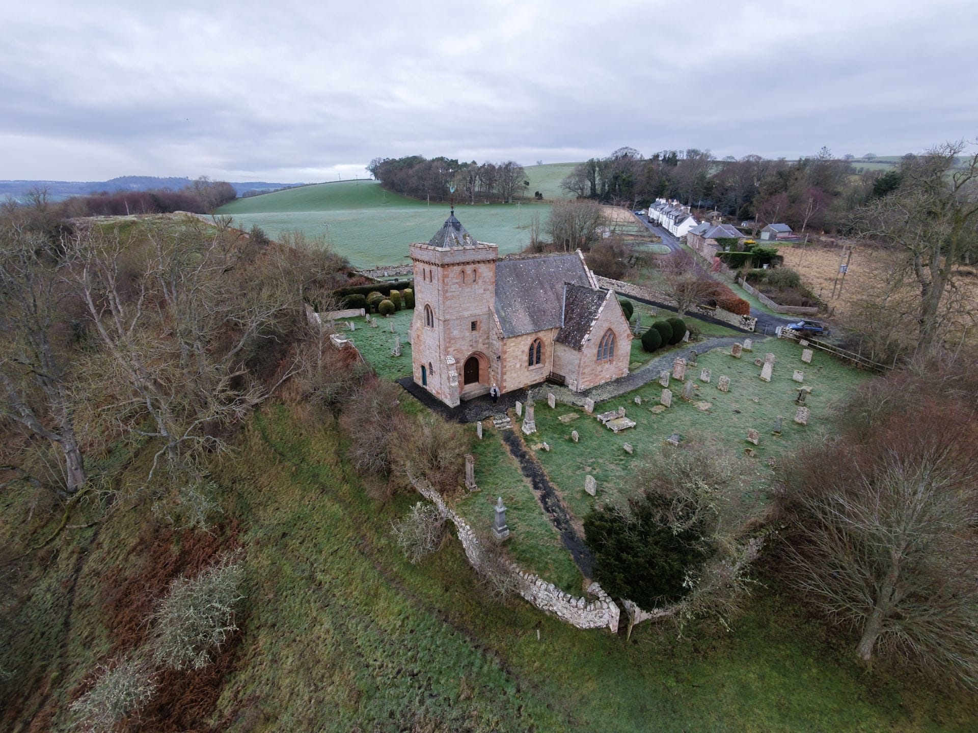 The church underwent external remodelling in 1803 and internal renovations by Thomas Greenshields Leadbetter in 1914, when additional sections were added to form a cruciform plan. The stained glass features work by Douglas Strachan. The church is located on the southern edge of the village, with the manse situated approximately 100 meters to the south-west.