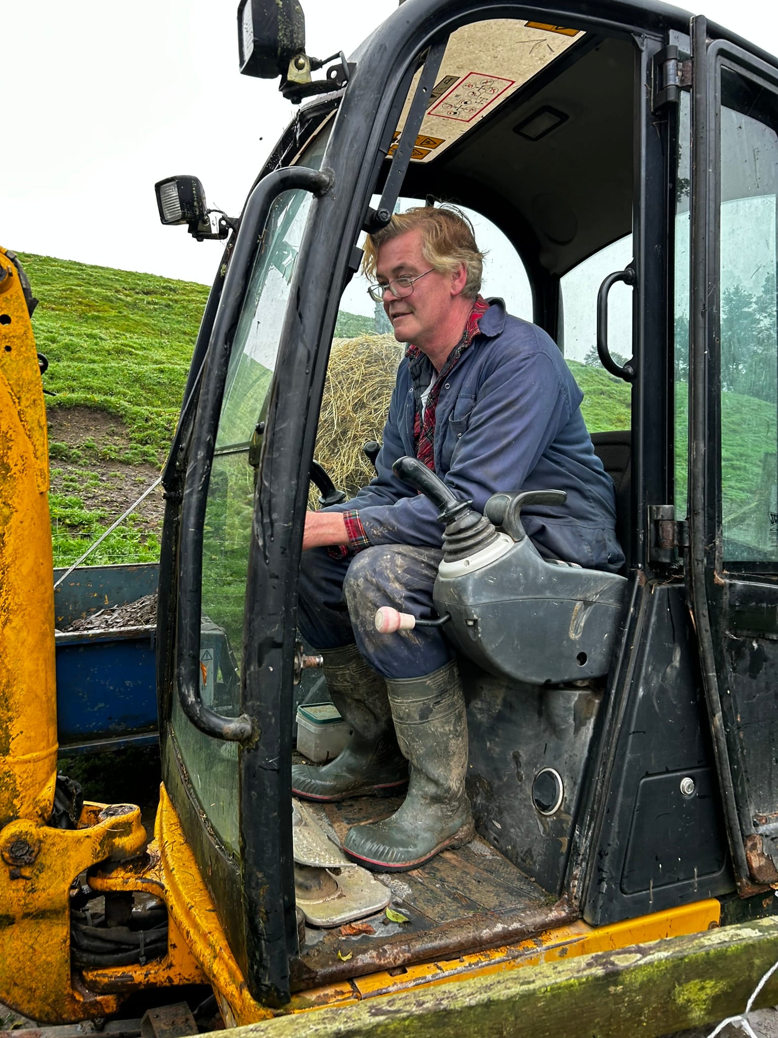 Charlie got the JCB to clear the farmhouse driveway, which was covered in mud from the yearly landslide. Then a frog jumped out of the mud, and Charlie gently moved him to the garden pond.