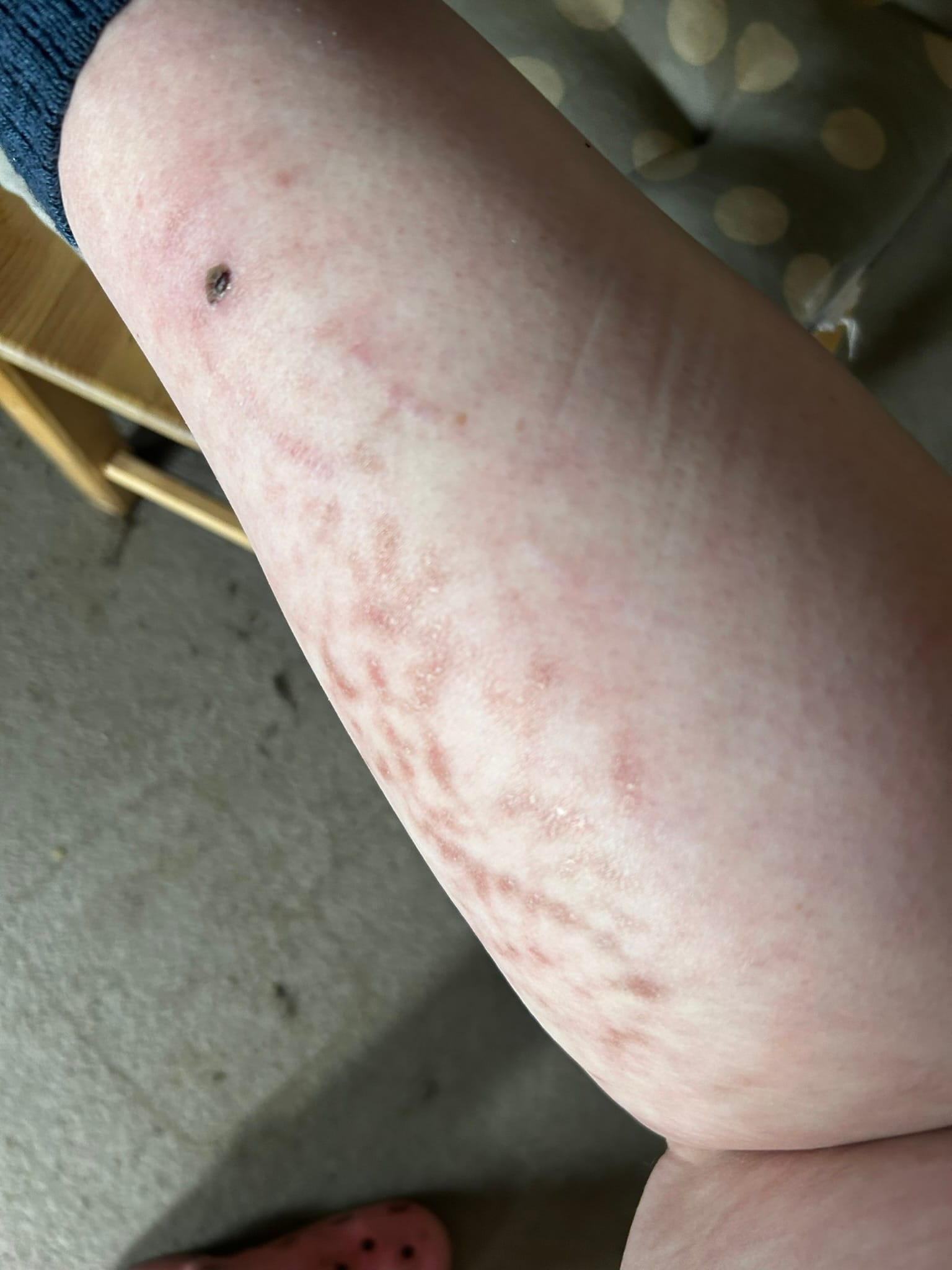 When the rain stopped in the early evening, I decided to trim the last of the dock leaves in the paddock, finishing the job a day earlier than planned. I was exhausted by the time I came down from the hill. Charlie helped me put down the strimmer and brushed off my clothes before I changed, trying to get rid of the grass pollen that was making me sneeze. I had been strimming for over two hours, and my body wouldn’t stop shaking. This time, I made sure to cover up because I’m allergic to grass pollen, which can cause my skin to swell and look like cellulitis.