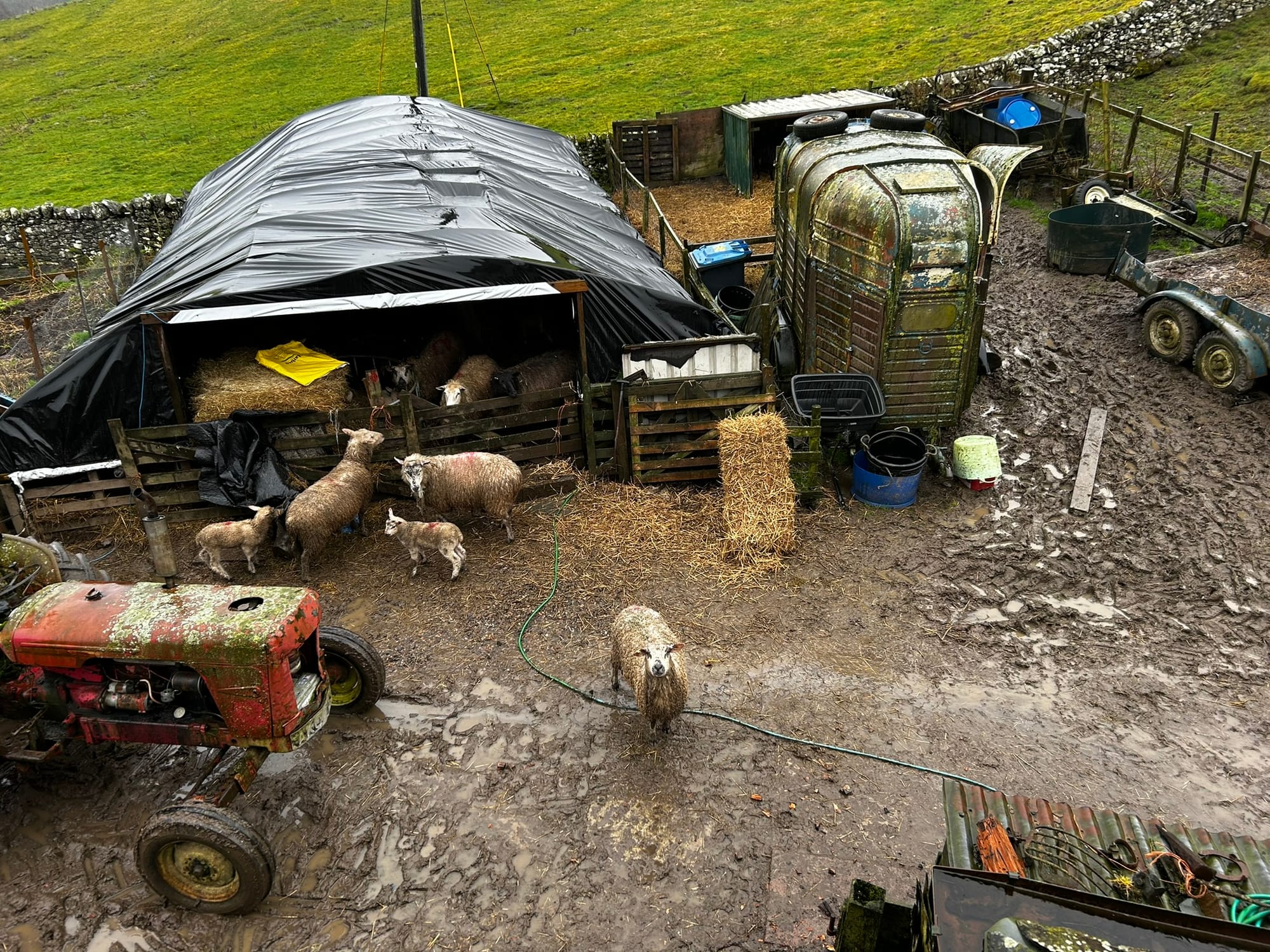It rained heavily this morning, and it felt like it would never stop. Charlie brought three mother ewes and their lambs in from the paddock, and now they are back in the poly tunnel for shelter. The Herdwick also came in from the paddock and is now in the calf creep pen with a few ewes that still need to lamb.