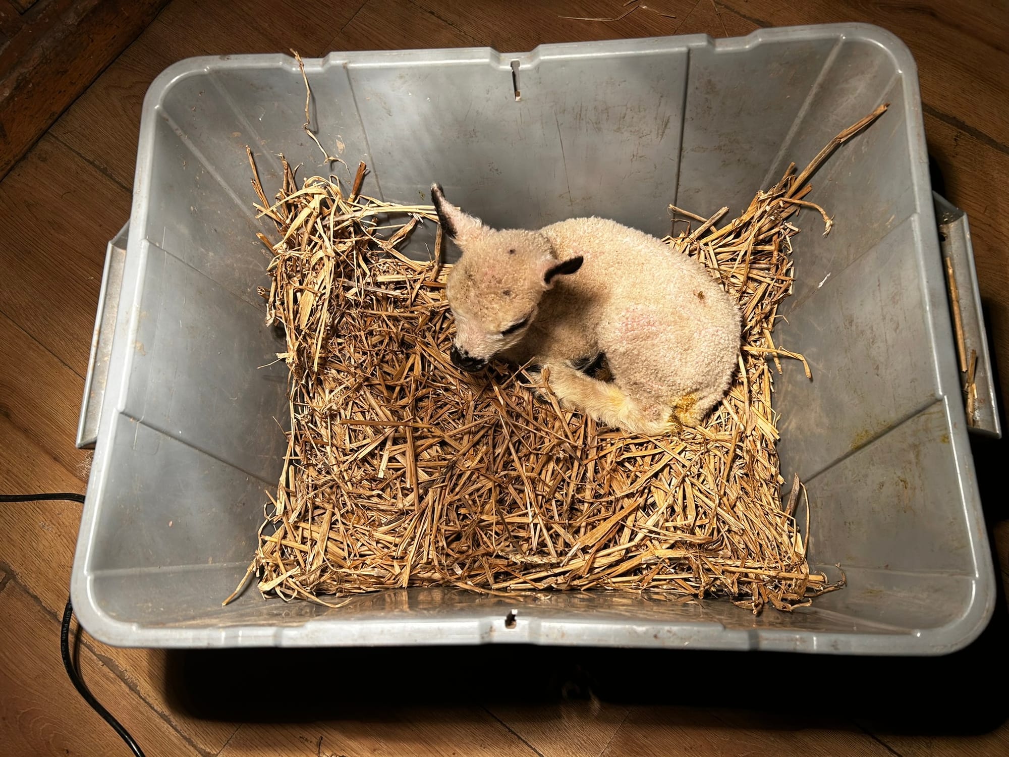 A cade lamb arrived with her legs so stiff she couldn’t stand to nurse from her mother. Charlie took her in, hopeful that she would walk with time. He gave her a 0.4 ml injection of selenium, and since then, we’ve noticed some progress. The lamb now pushes herself up with her front legs, backs up to the wall, and tries to move forward. This is better than when she could only wiggle on the floor. She’s had a tough start in life, and I really feel for her.
