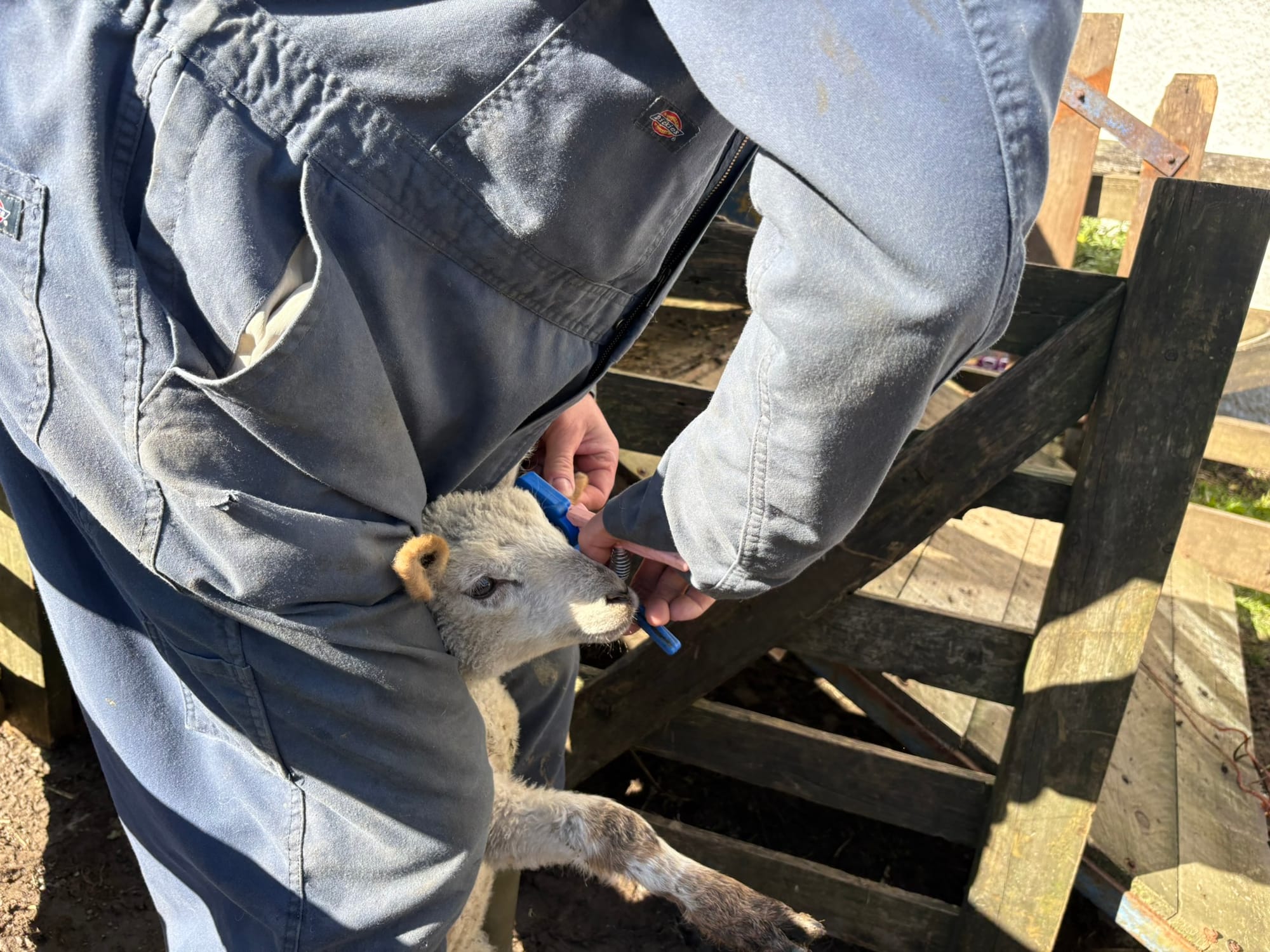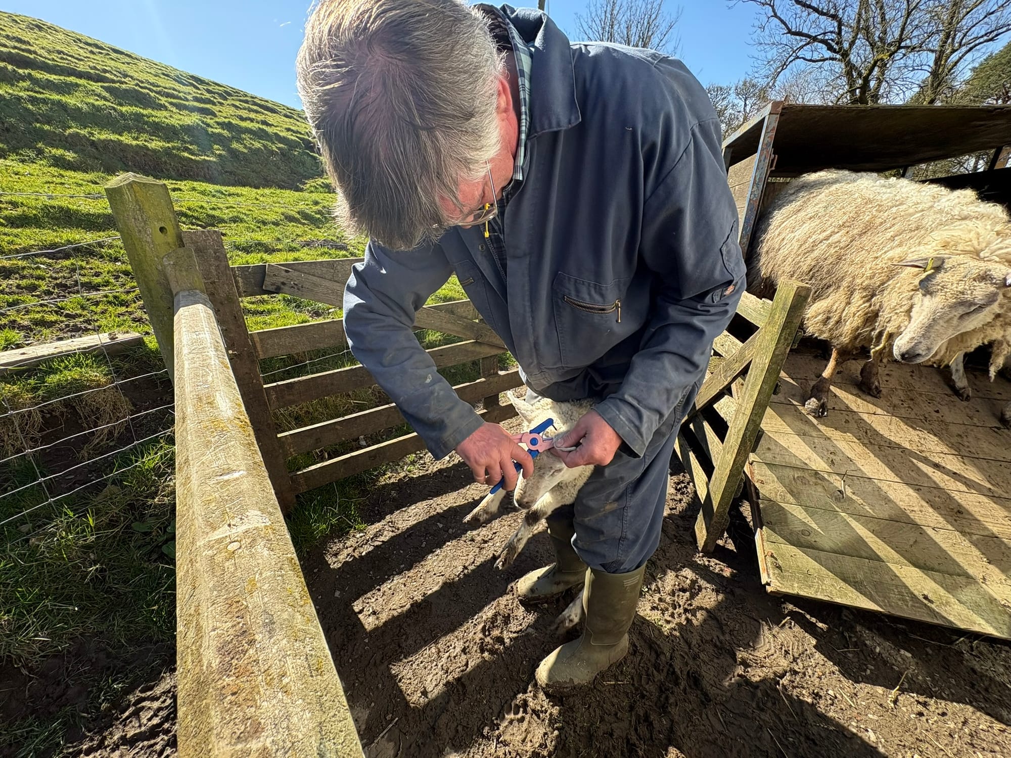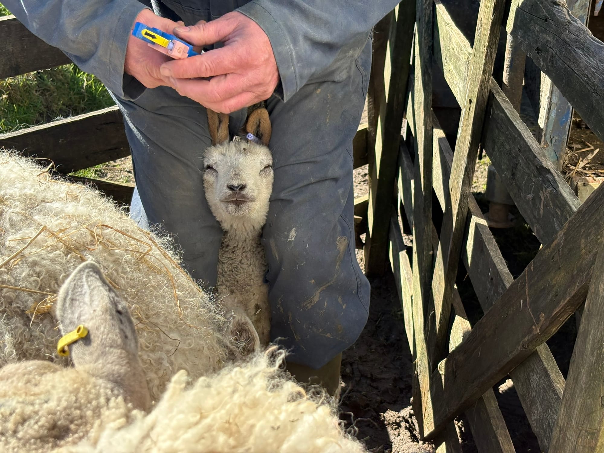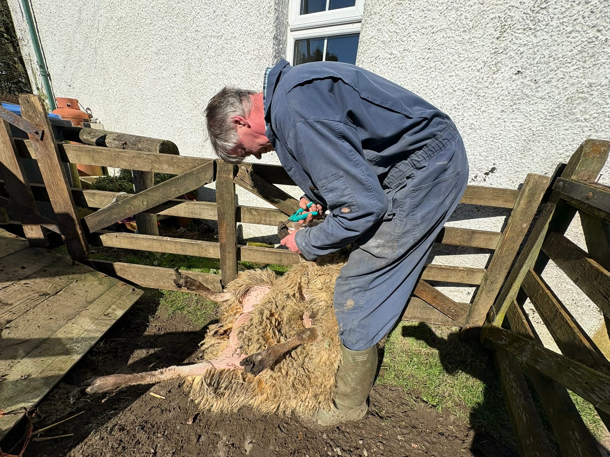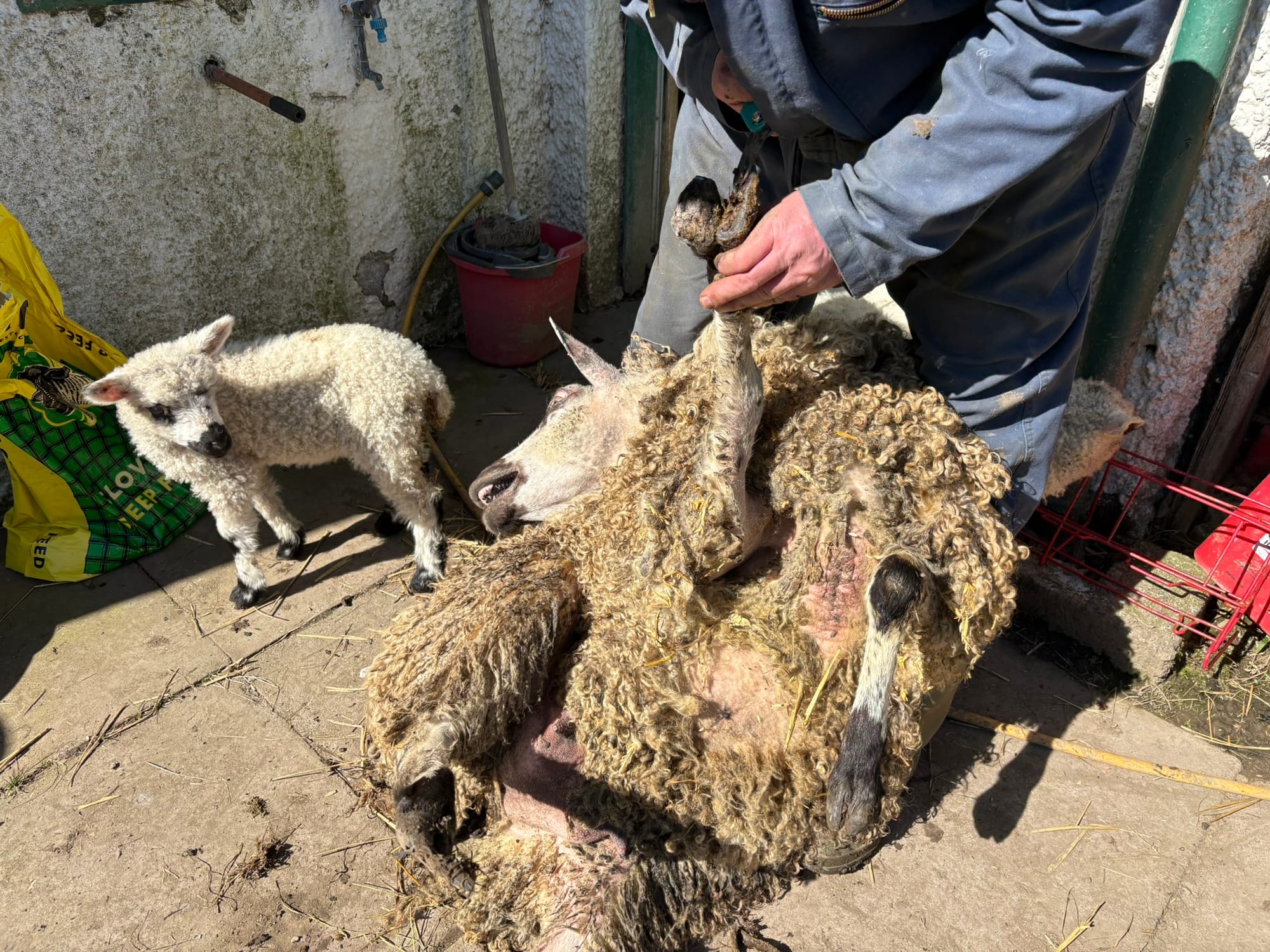 Lucy the ewe is clipped, Violet hoof sprayed, and then released with her lambs to graze in the paddock.