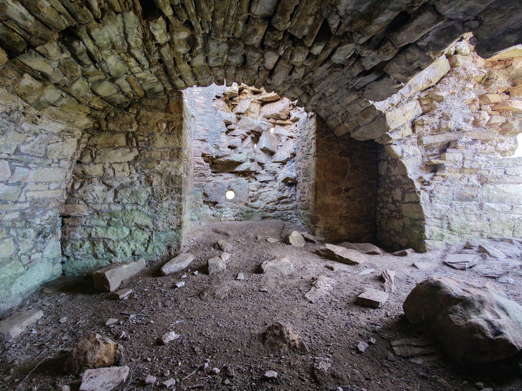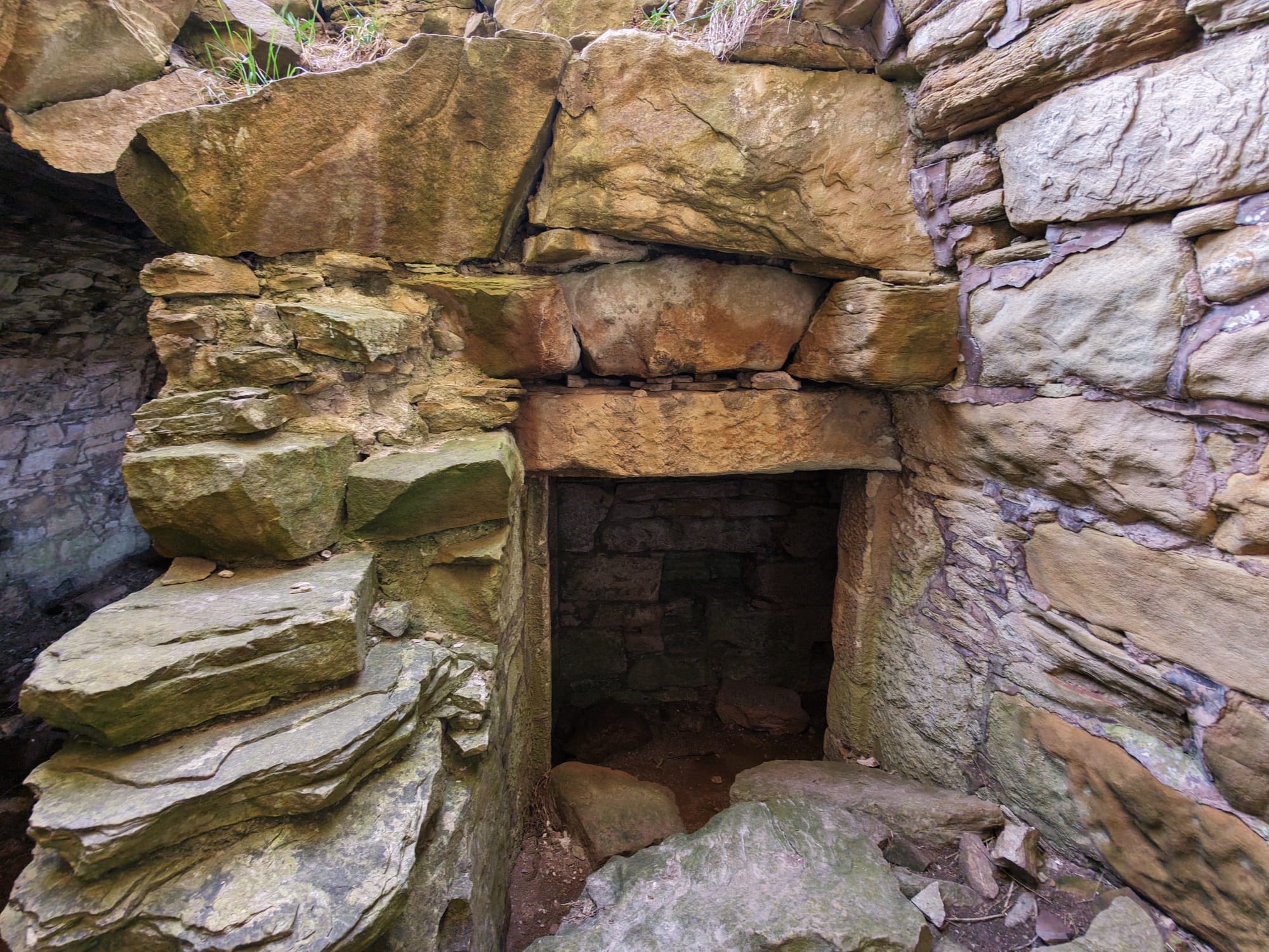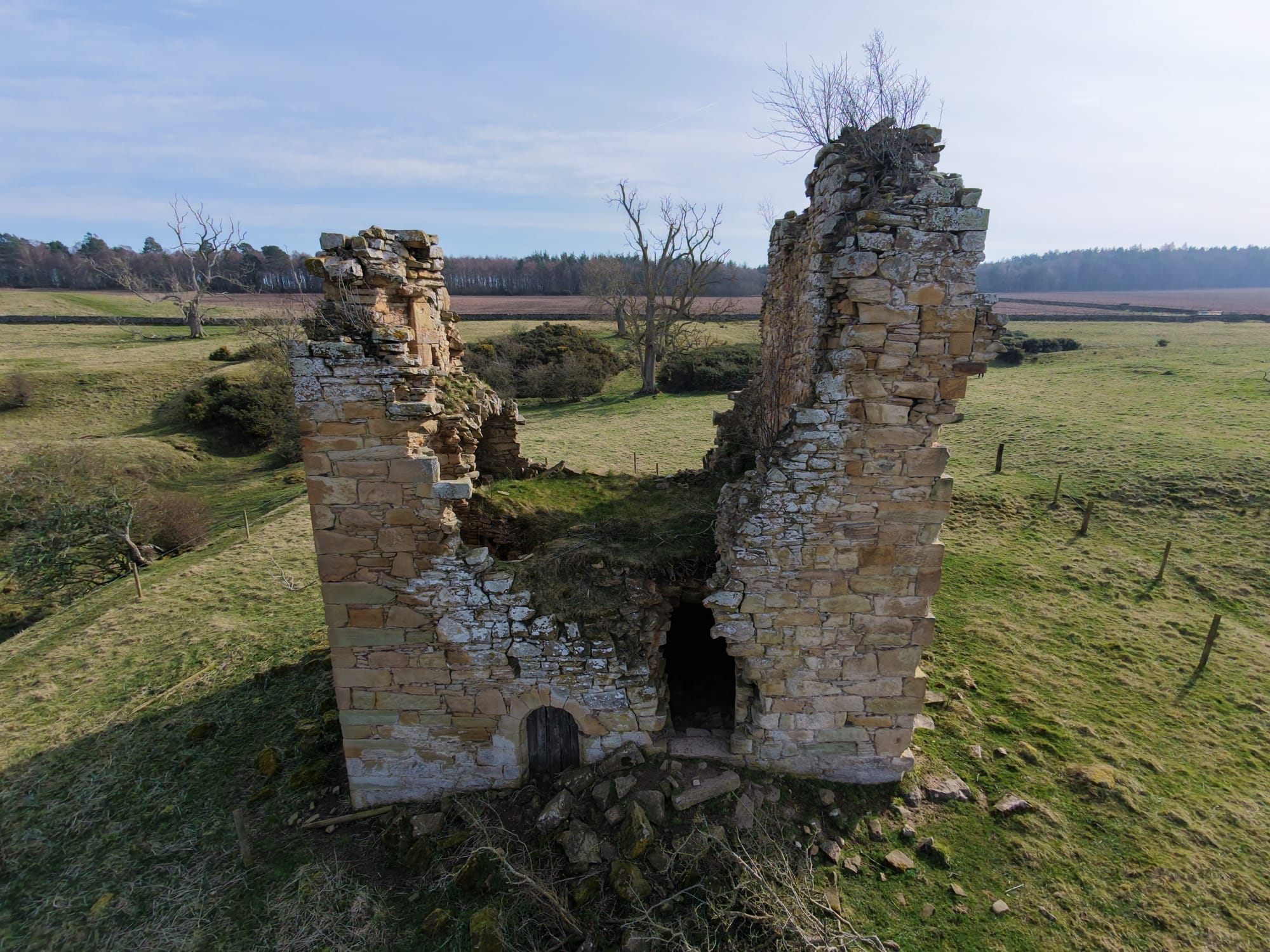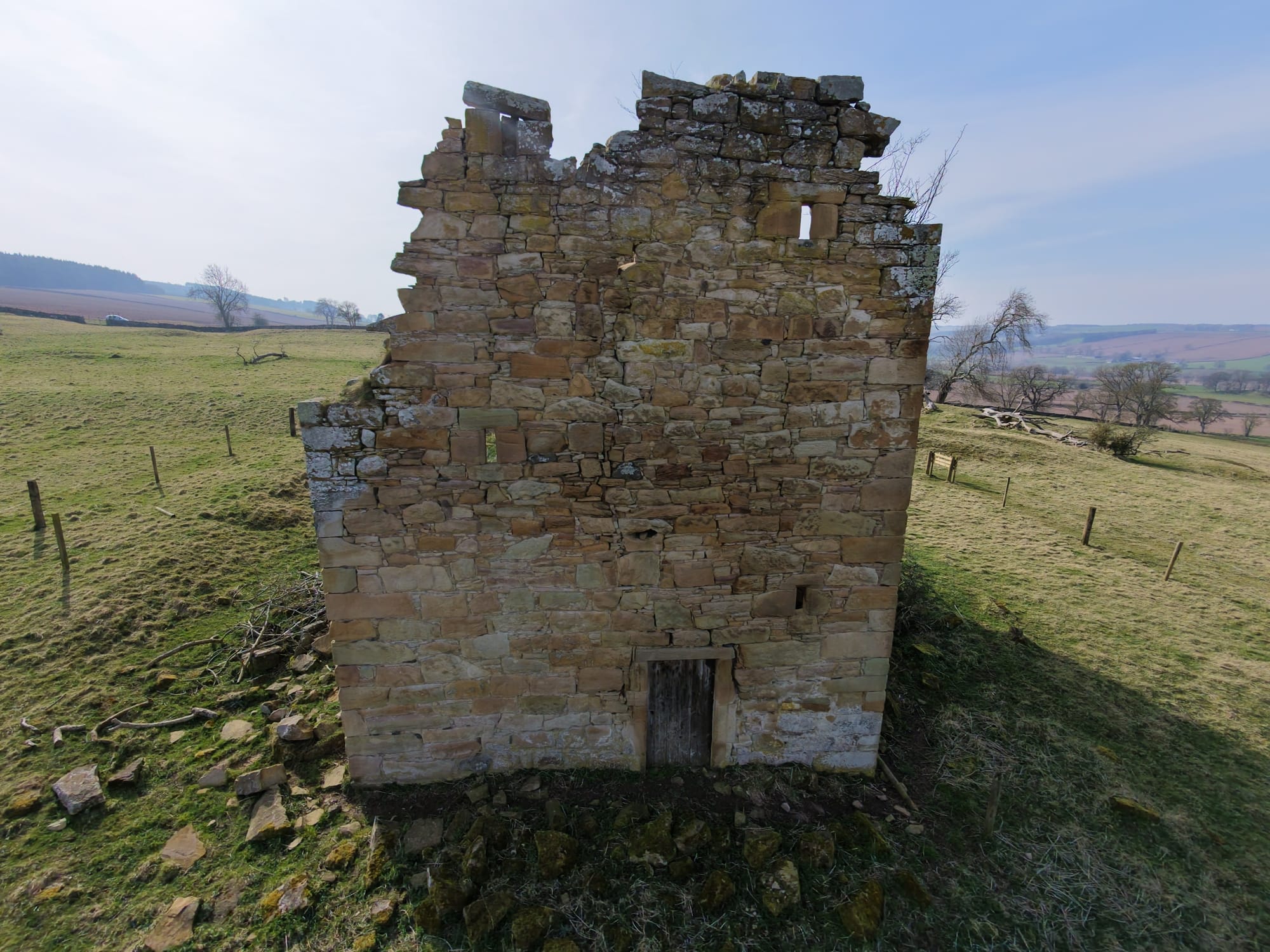 The tower stands among much older earthworks and once had three floors and a vaulted cellar. Projecting bond stones on two walls suggest there was once an addition, but it is now gone. The east door and basement fireplace were added after the original house was built.