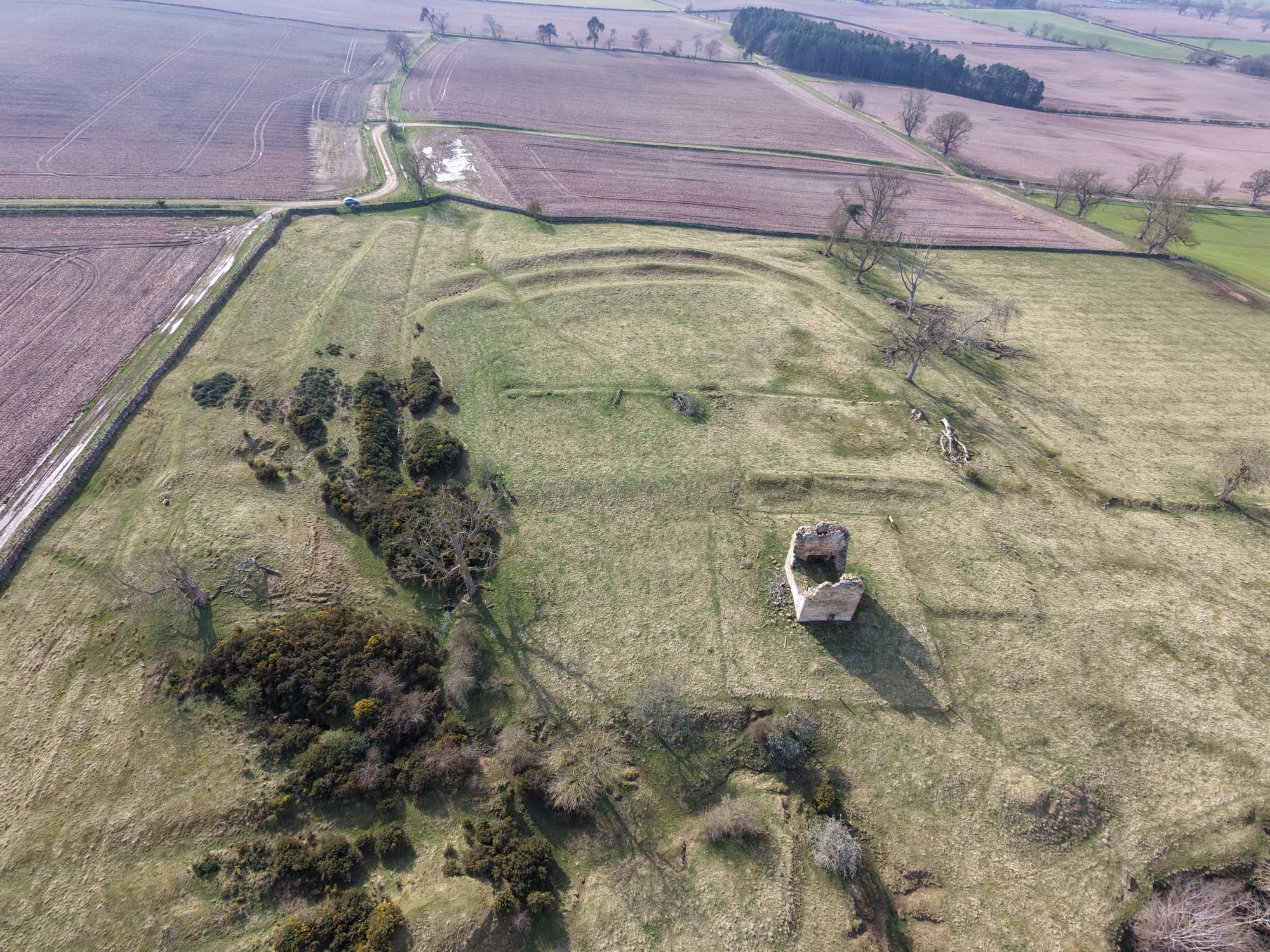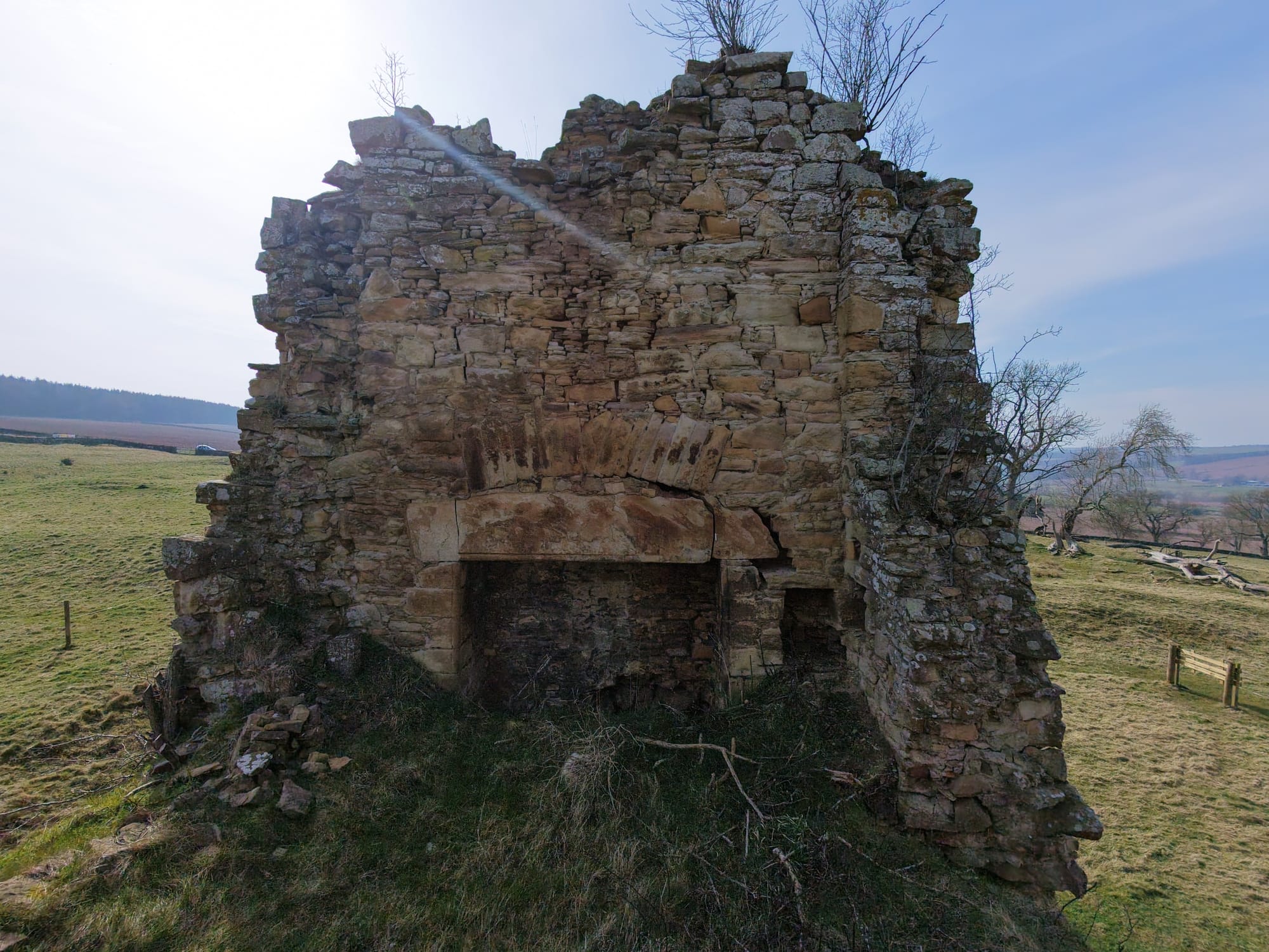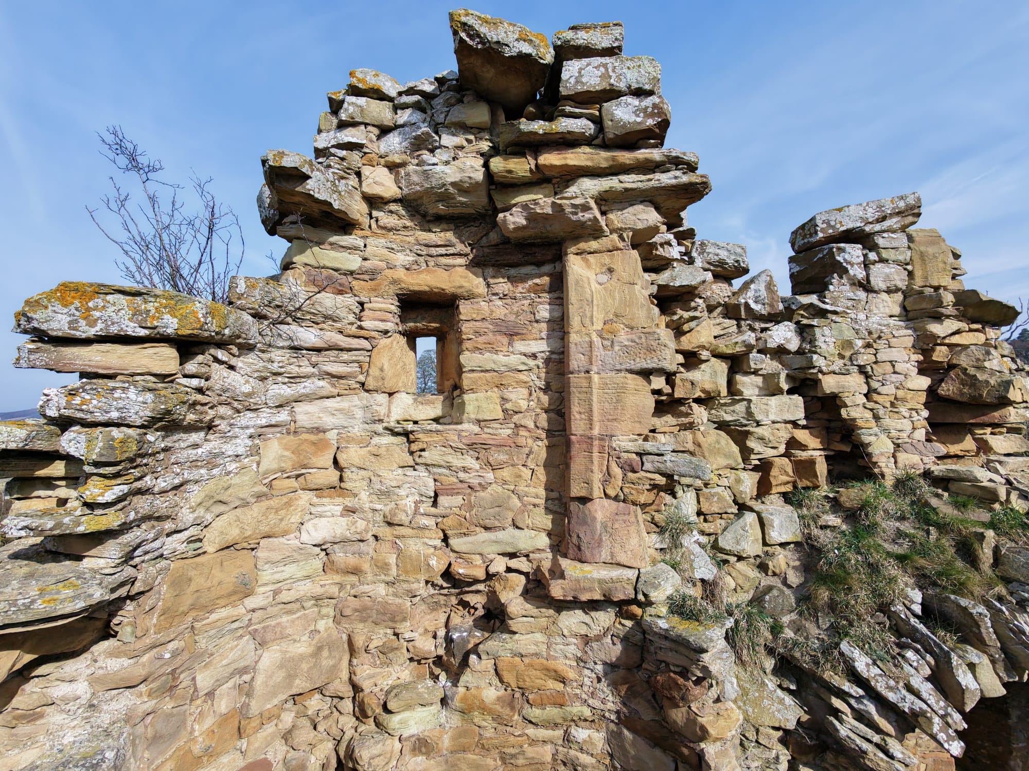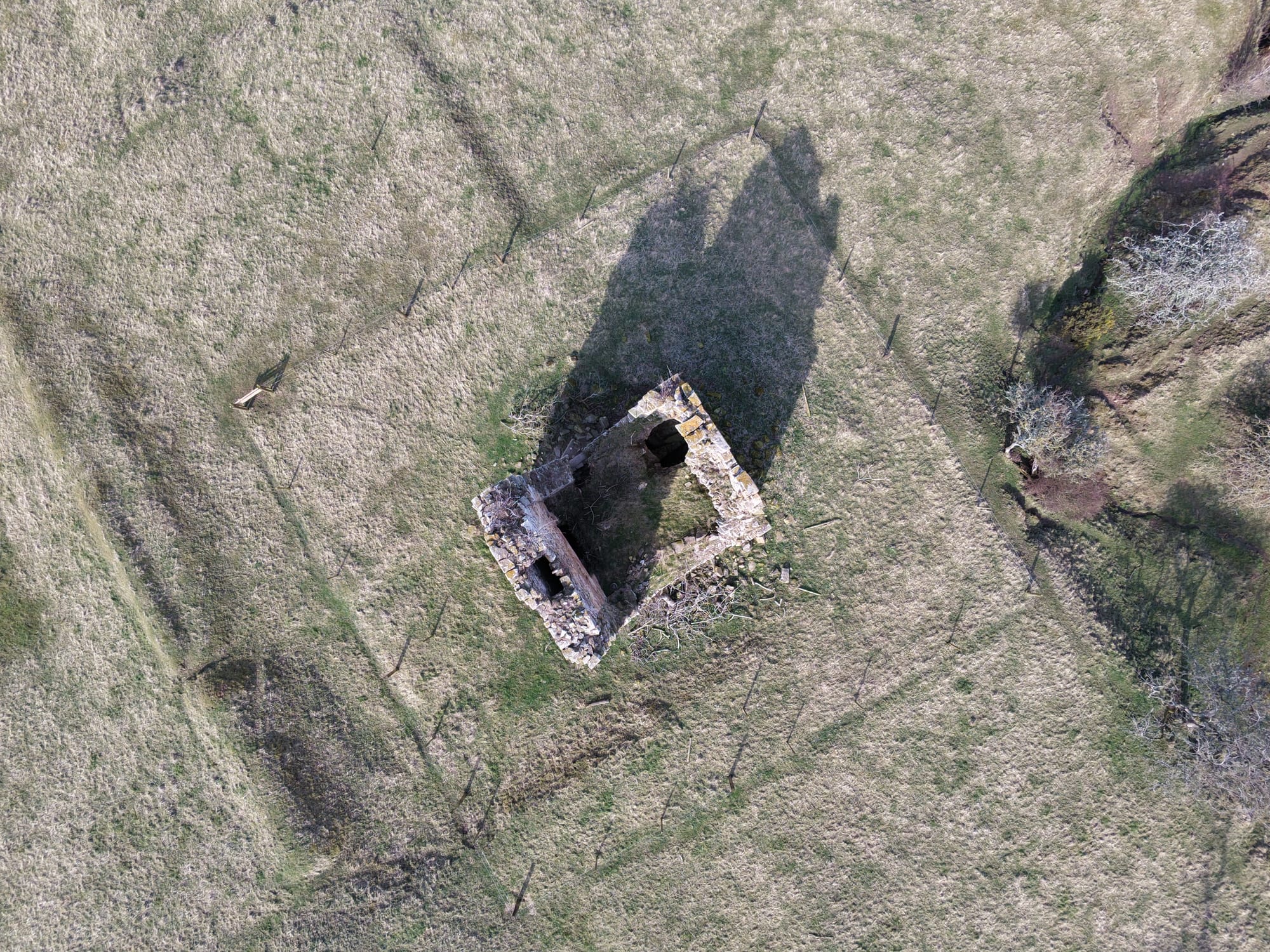 The tower stands among much older earthworks and once had three floors and a vaulted cellar. Projecting bond stones on two walls suggest there was once an addition, but it is now gone. The east door and basement fireplace were added after the original house was built.