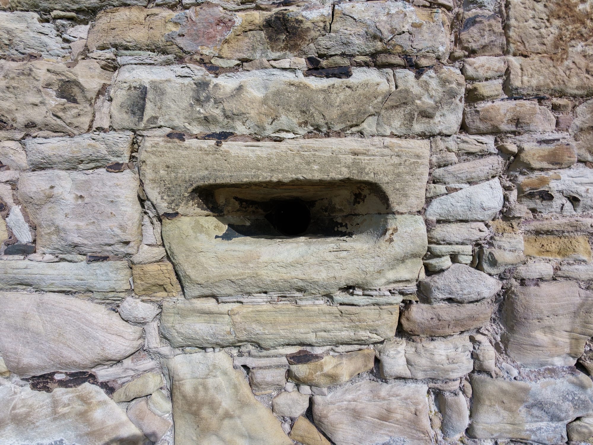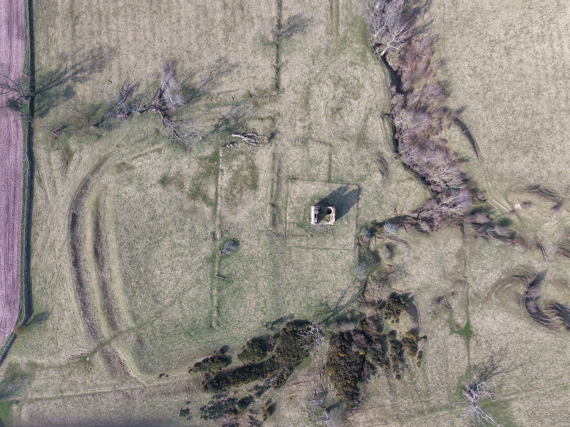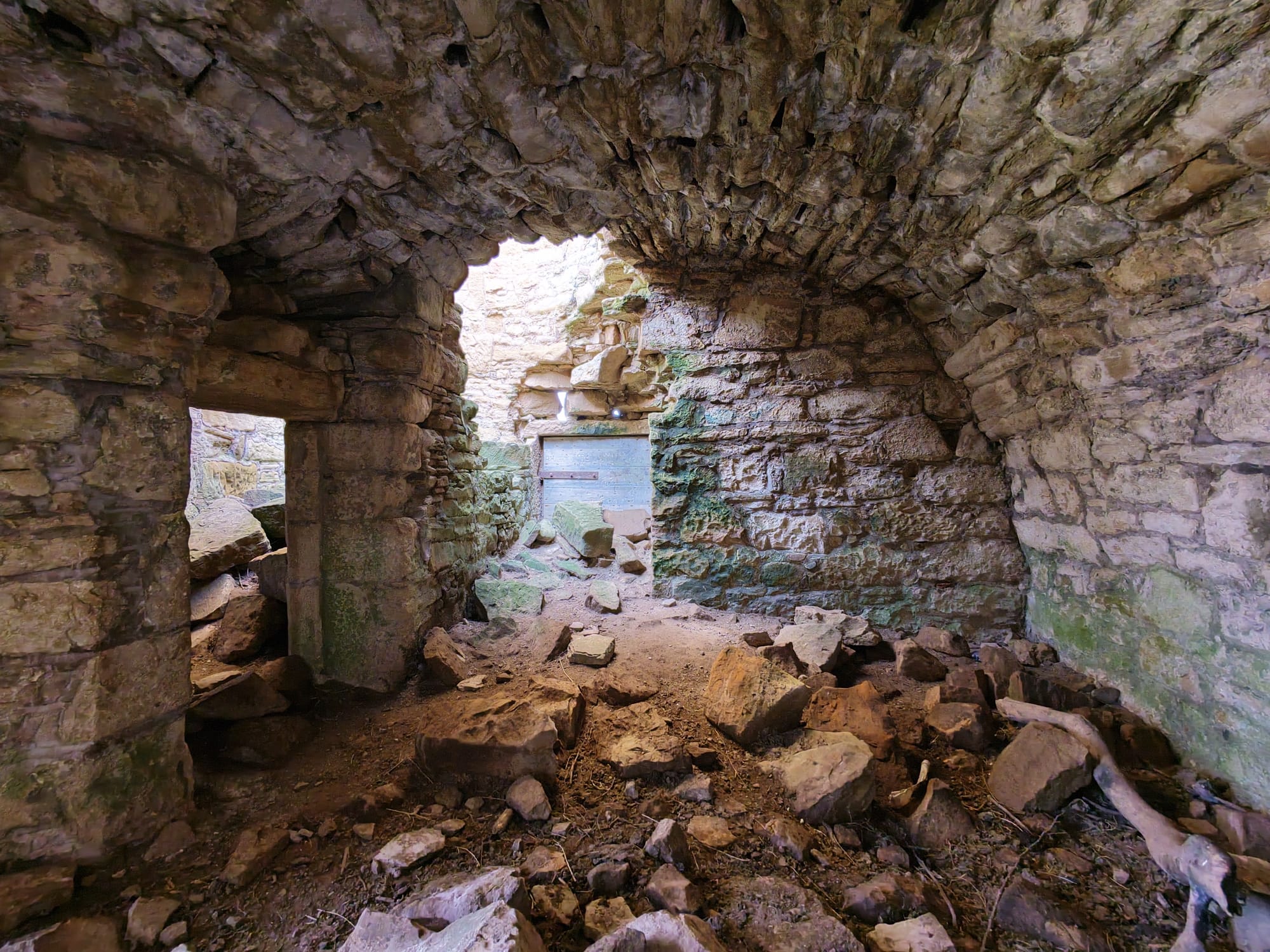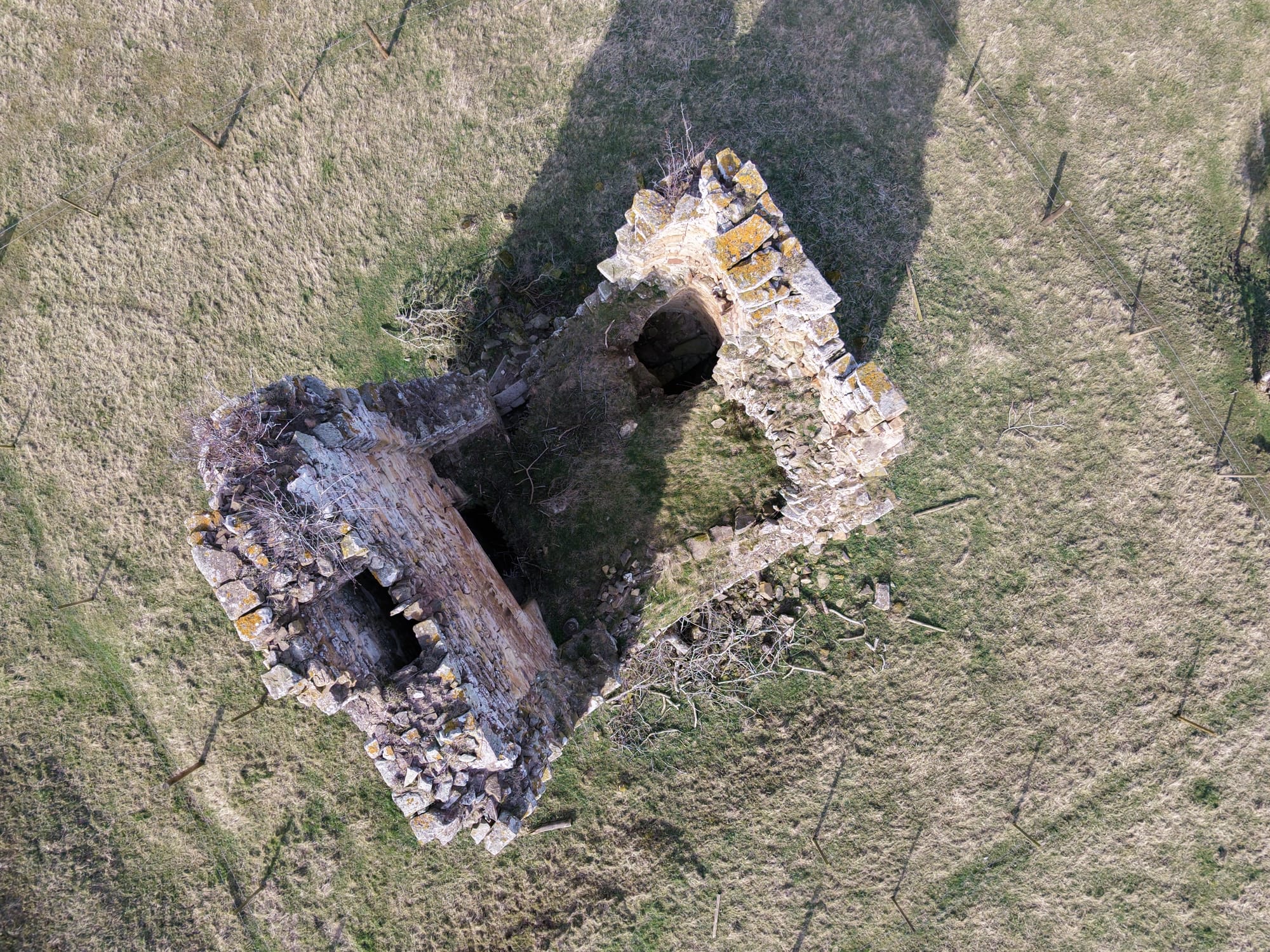 The tower stands among much older earthworks and once had three floors and a vaulted cellar. Projecting bond stones on two walls suggest there was once an addition, but it is now gone. The east door and basement fireplace were added after the original house was built.