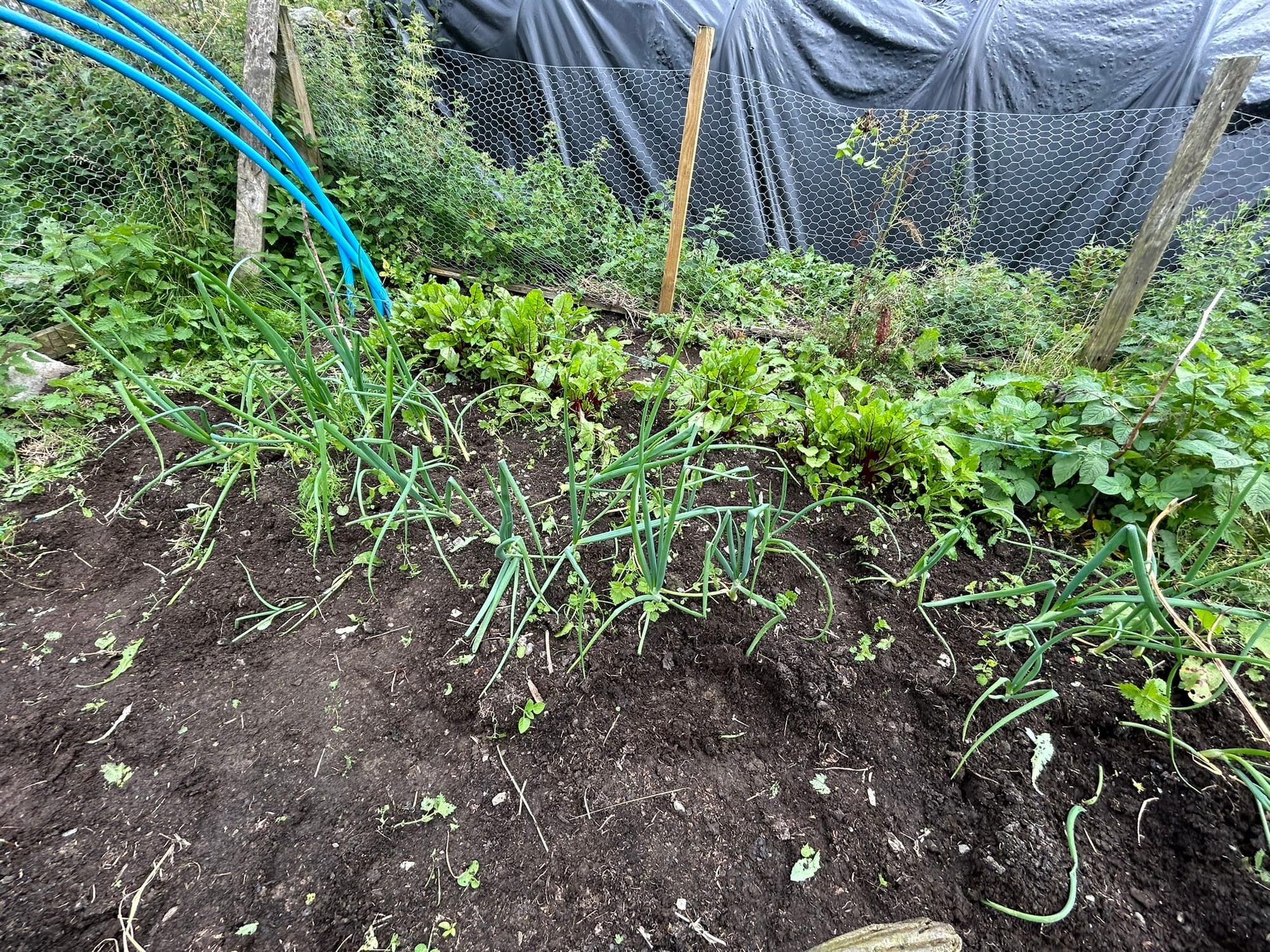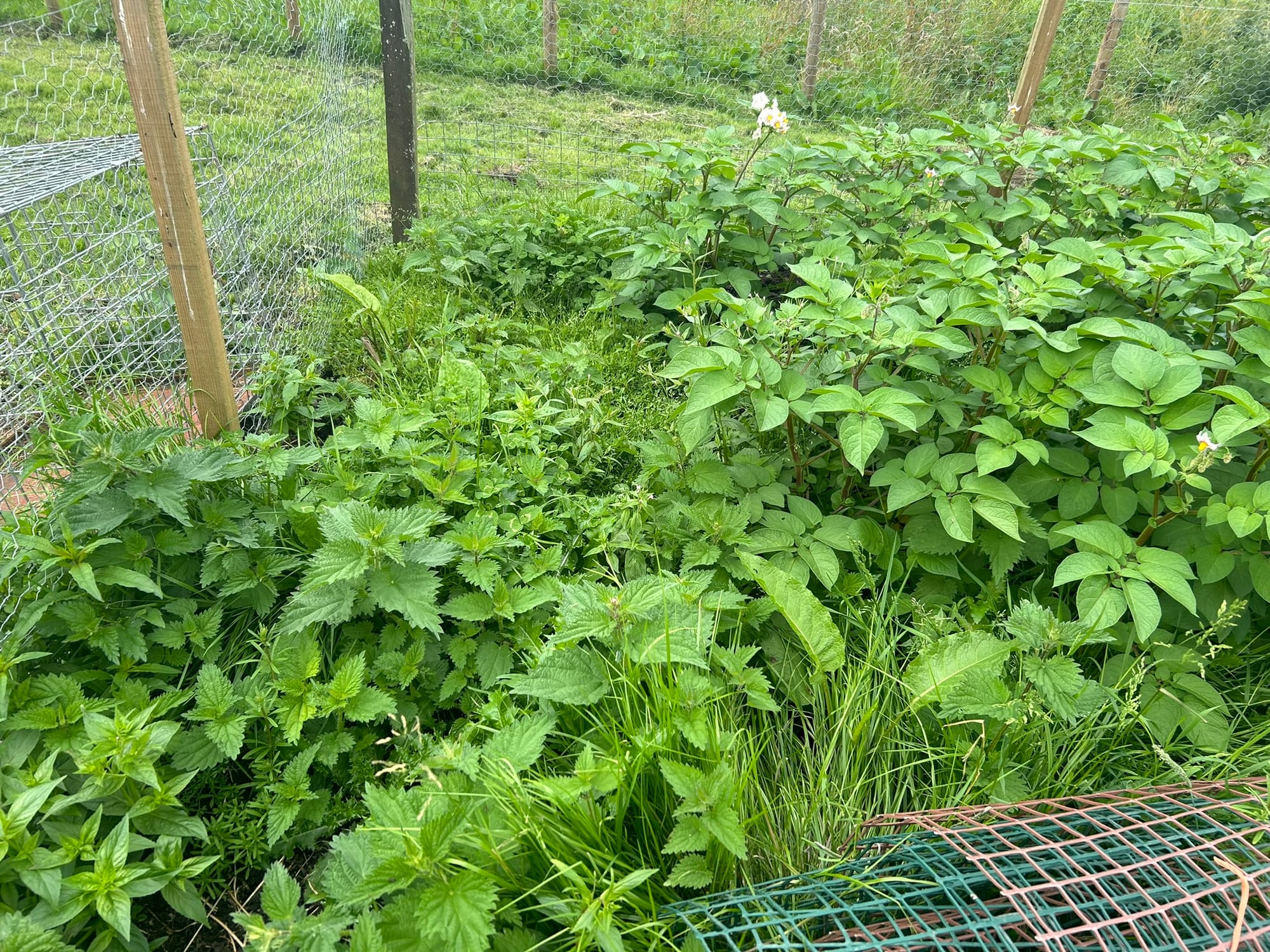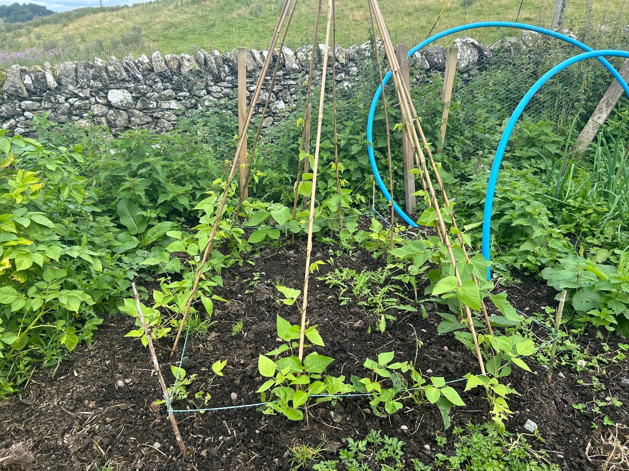 Beans, potatoes, onions, and beetroot are coming along well, but weeds have also popped up, like nettles, docks, and a pink flower weed I haven't been able to identify in the Farmhouse Kitchen.