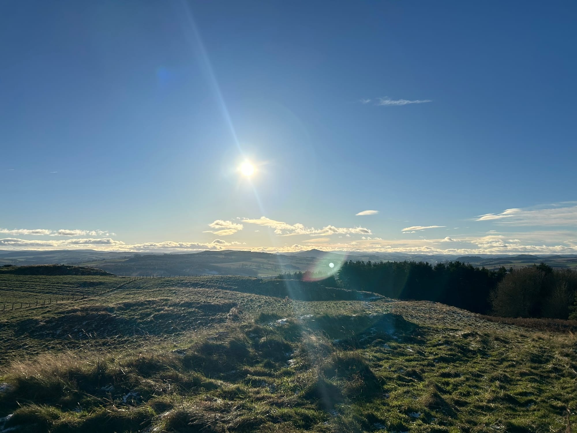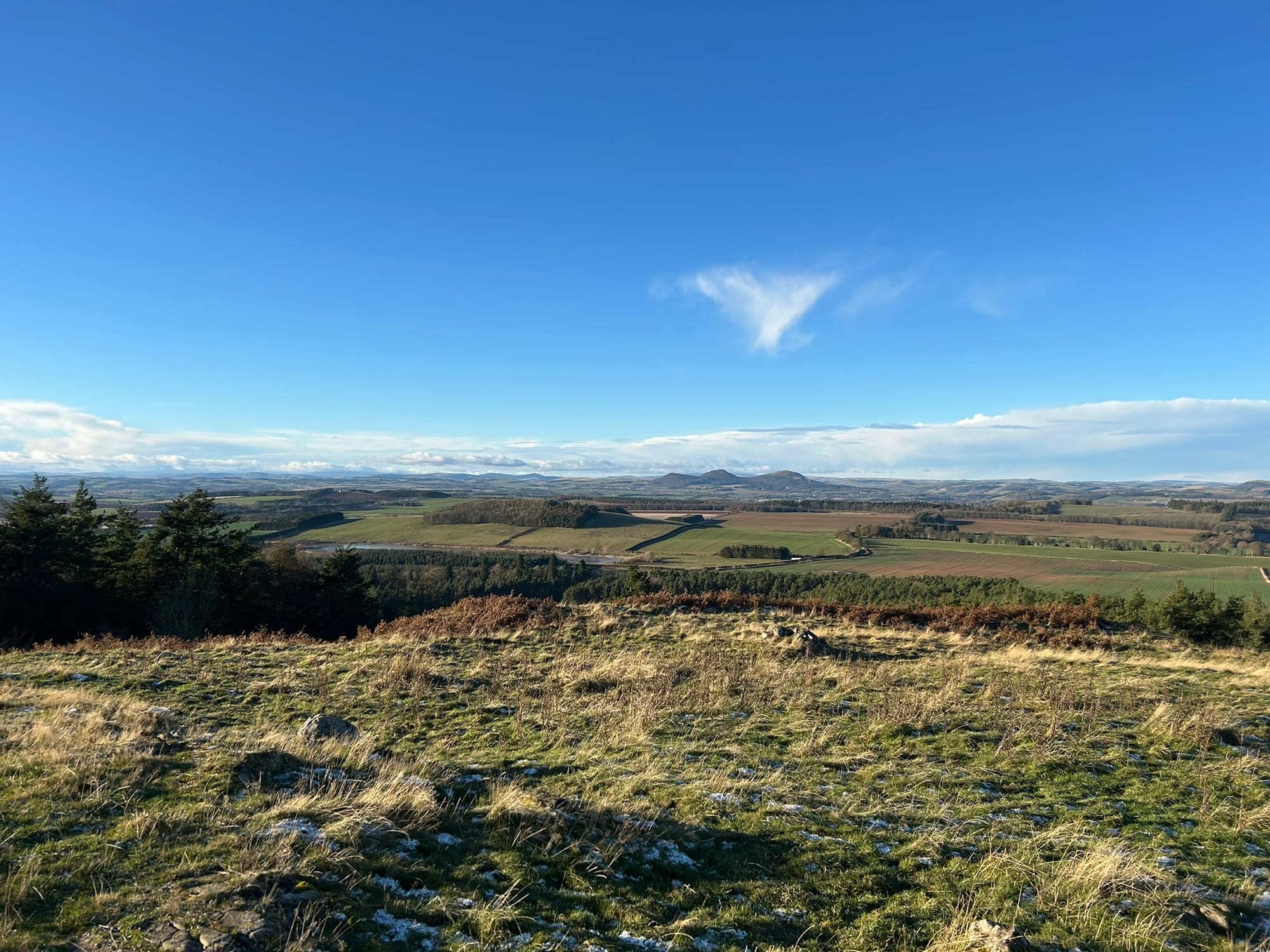 From the summit, the Cheviot Hills, Rubis Law Hill, Elidon Hills, and Monteath Mausoleum are visible. Although we did not specifically look for Minto and Smailholm towers, they are likely visible as well. The surrounding landscape resembles a hillfort.