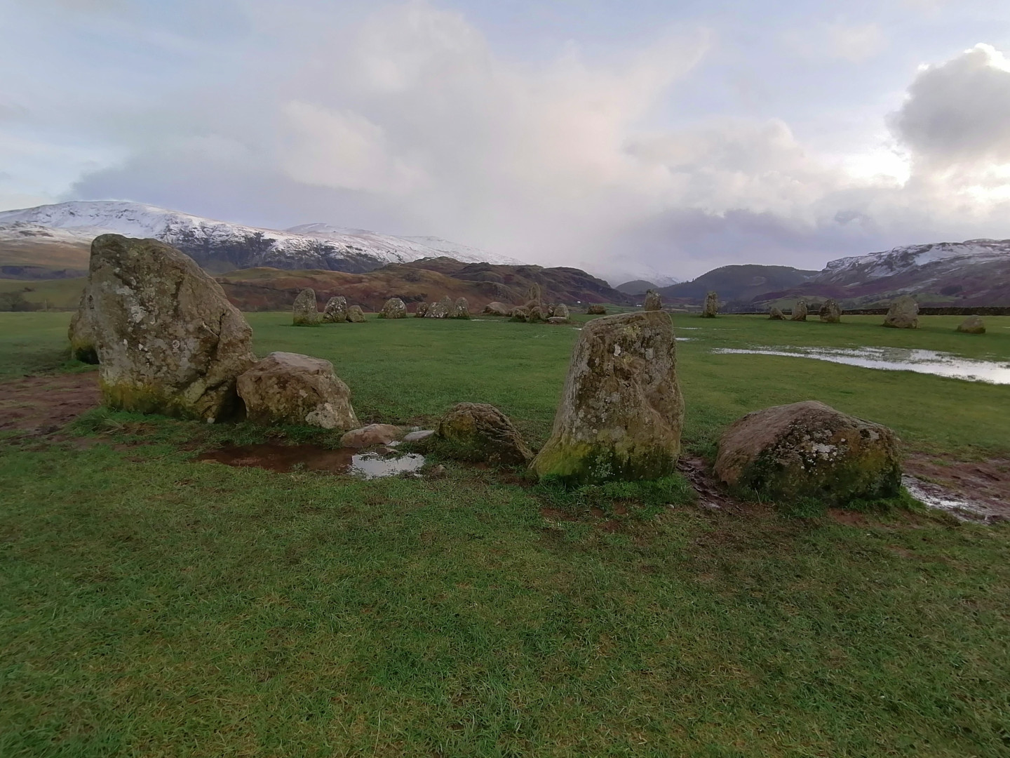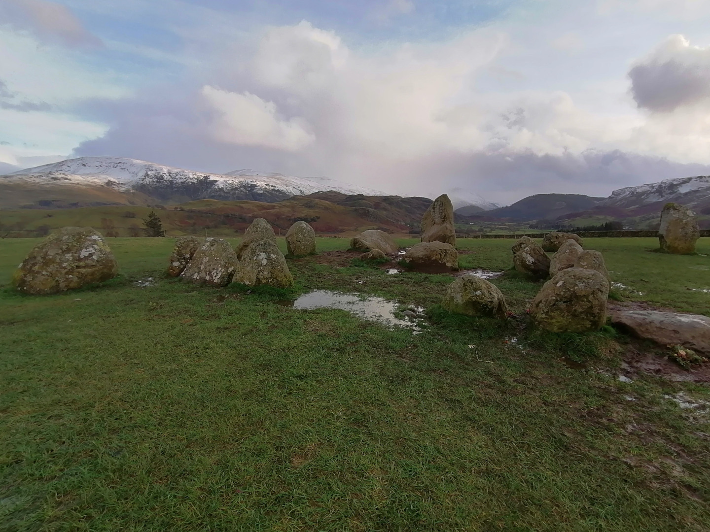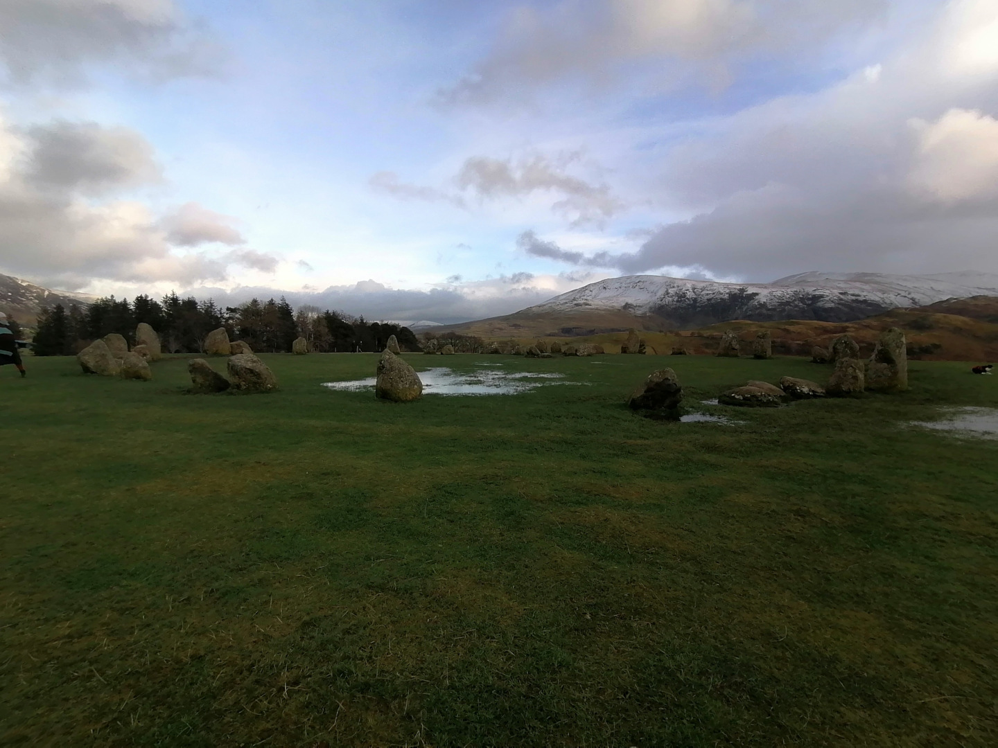 I anticipated a roadblock with number plate recognition as we briefly passed through Scotland, a border that was supposed to be secured with Tier 4. However, windblown plastic wheelie bins obstructed the road after the border had already been crossed. We returned to Bonnie and then continued on to Blighty. Upon crossing the border again on the A7, I arrived at the Castle Rigg Circle stones to fulfil our three-year appointment. Since there wasn't much to do and not many tourists around, I used my phone to take some pictures to remember the day.