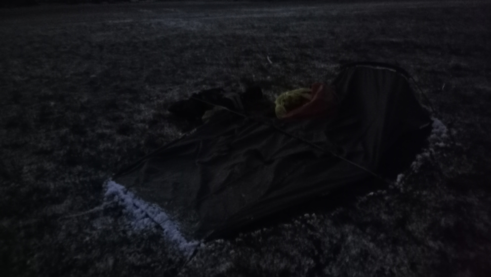 My tent was not photographed this morning; I recall taking them, but I am unsure as to why they are not on my phone. Nevertheless, I pitched my tent in an open field adjacent to a bustling main road. The frequent passing of loud vehicles kept me awake for the majority of the night. While being observed by a neighbor from their front window, I organized my possessions.