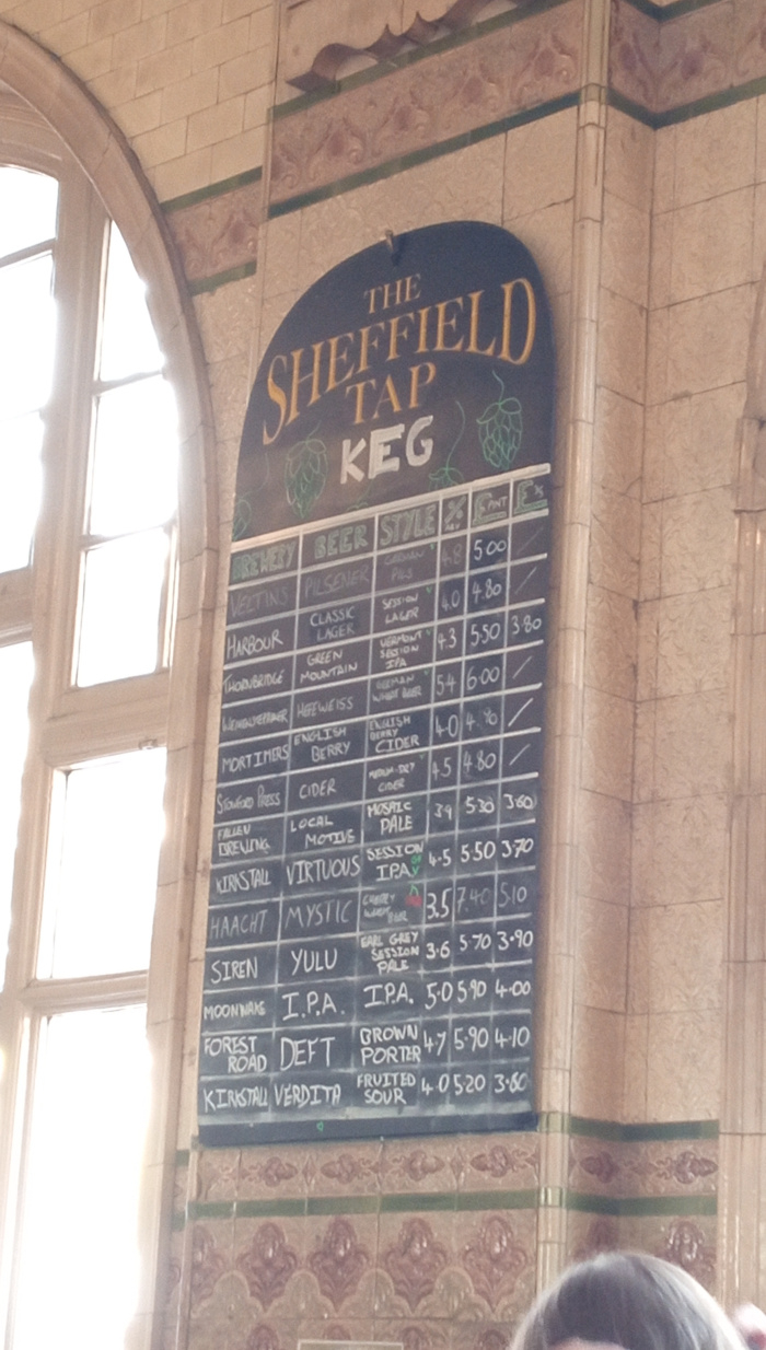 After arriving at Sheffield, I exited the station, only to return to the station to discover the Sheffield tap. The selection of real ales was truly exceptional. After each other, strange people came in. One guy had a teddy bear and a laptop with him, and another was a woman I knew from a Facebook friend request that I wrote about in a blog post not long ago.