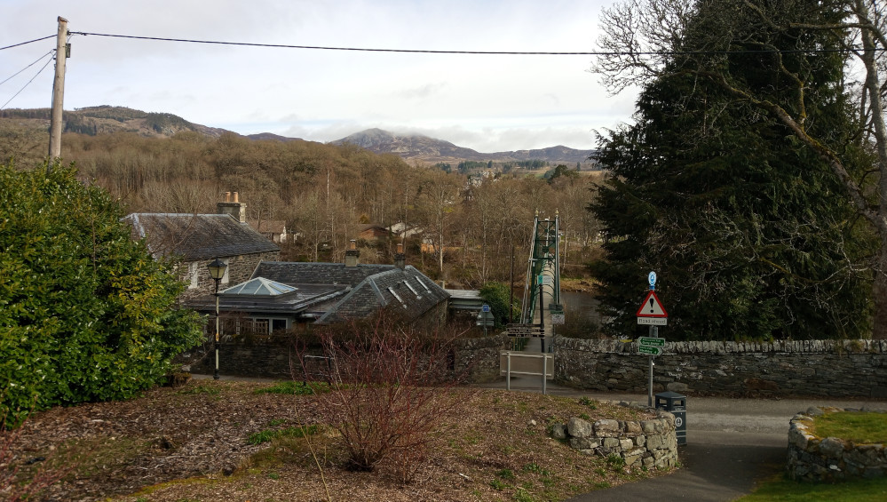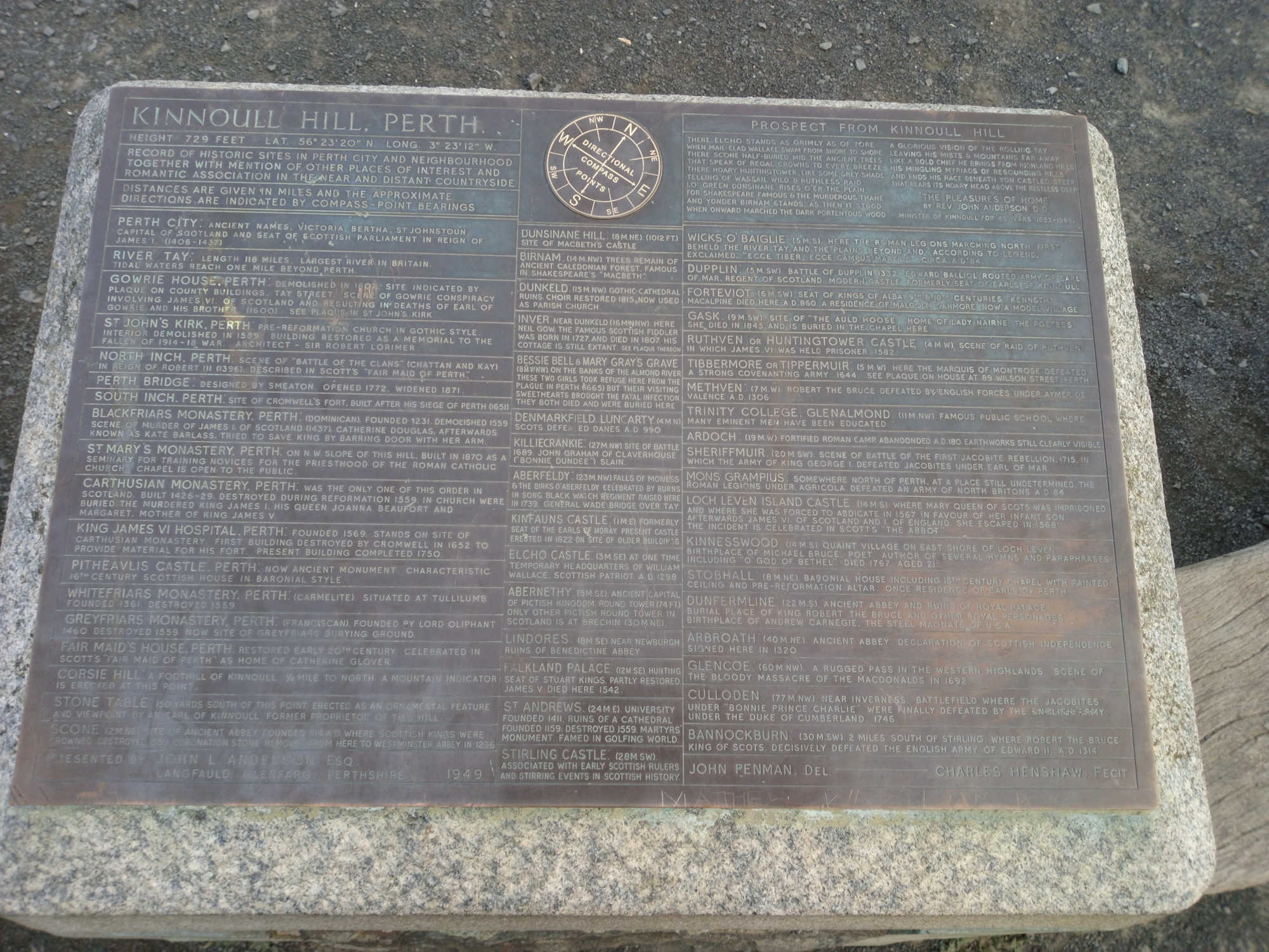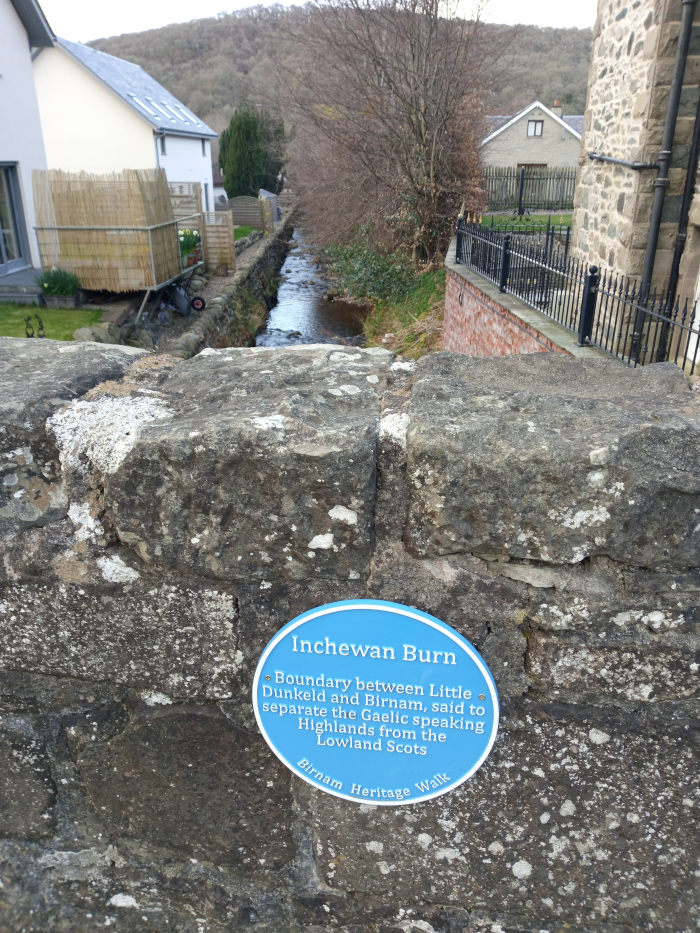 We walked to Pitcairngreen. I sat on the village green and cooked, then left via a road north of the village. Half an hour later I was picked up by a man in a mini, he took me to the outskirts of Birnam. I walked over Inchewan burn via a small bridge and noticed a plaque.