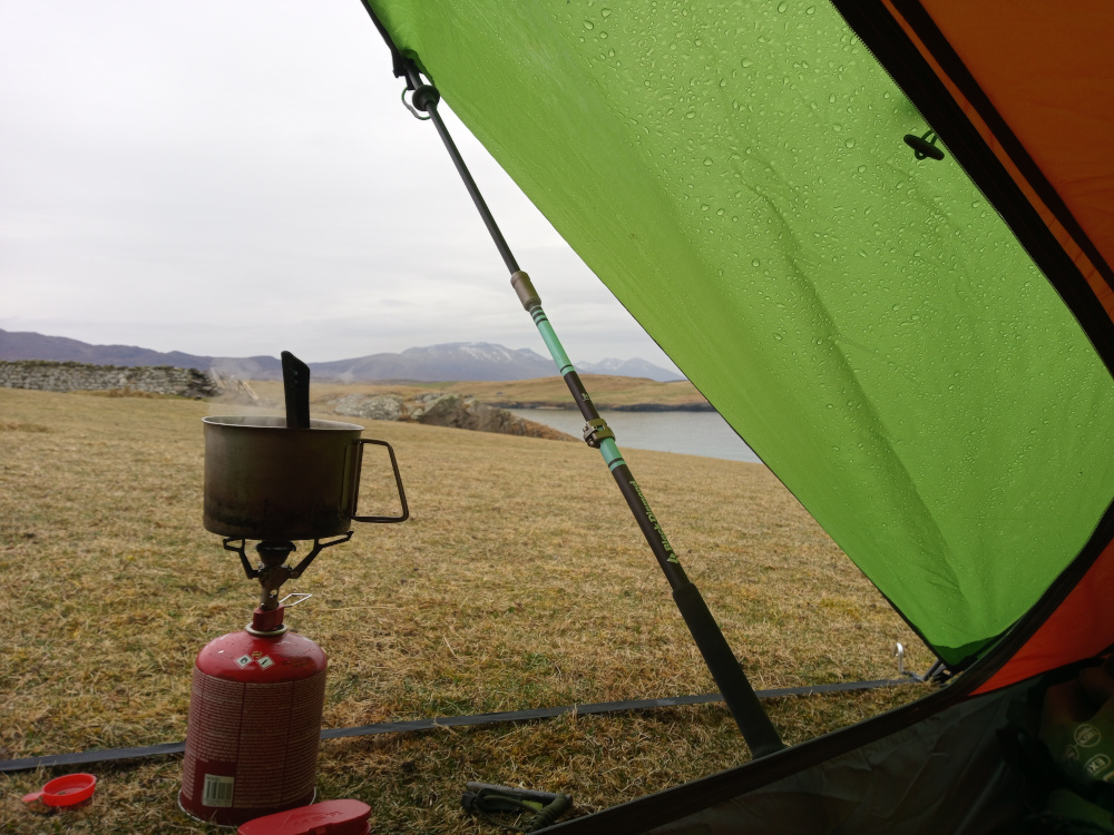 Located approximately two miles east of Durness, between the Dunes, the locals asserted that I was on MOD land; however, there were civilian residences in the vicinity. There were only sporadic showers, and the weather was generally pleasant for Durness. This morning, breakfast was lentil soup, which happens to smell more pungent than French onion soup! Enjoyed before leaving the shelter of my tent.
