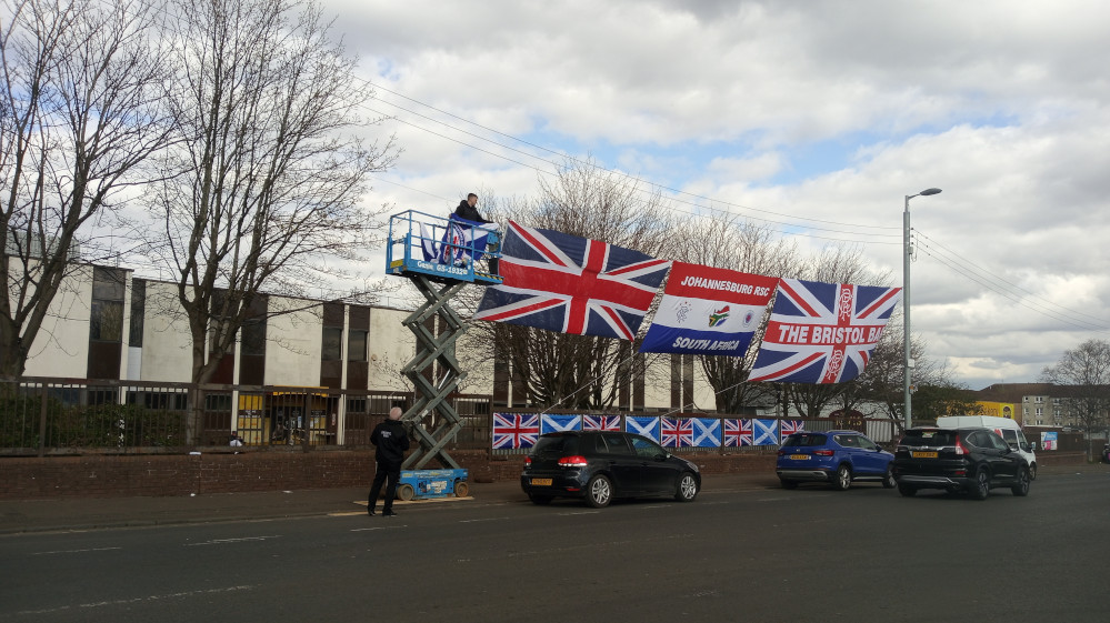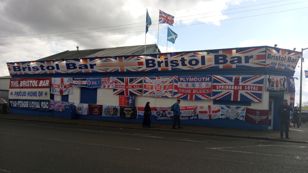 While walking north out of Glasgow, I passed by the Bristol Bar, which is the most popular hangout for Rangers supporters. Members were distributing a variety of Union Jack flags, including the red hand of Ulster, and posing with an elderly man who was wearing an abundance of war medals. I decided against crossing the threshold and entering the boisterous atmosphere after taking a look inside the bar that day.