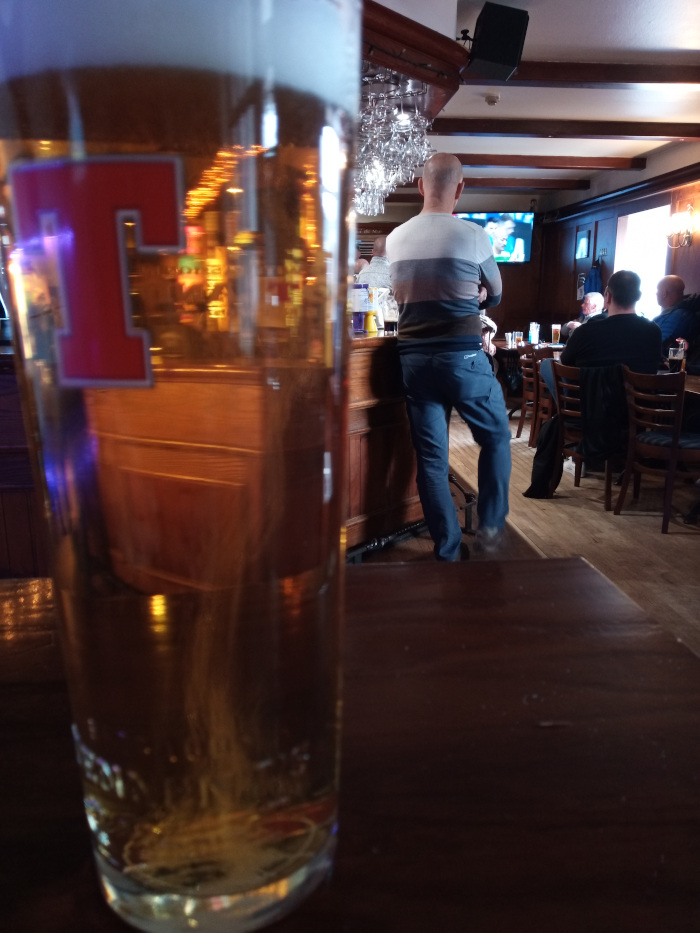 I departed the area and proceeded north, passing through an industrial estate and a park. A man greeting me from outside a bar up the road then invited me to join his friends for a drink. He claimed that the bar was his local after purchasing me a Guinness (not on draft, but in a can). I conversed with his friends before they departed. An elderly man and woman, both of whom claimed to have been drinking in the bar for years, claimed that they had never seen the man who had invited me in before.