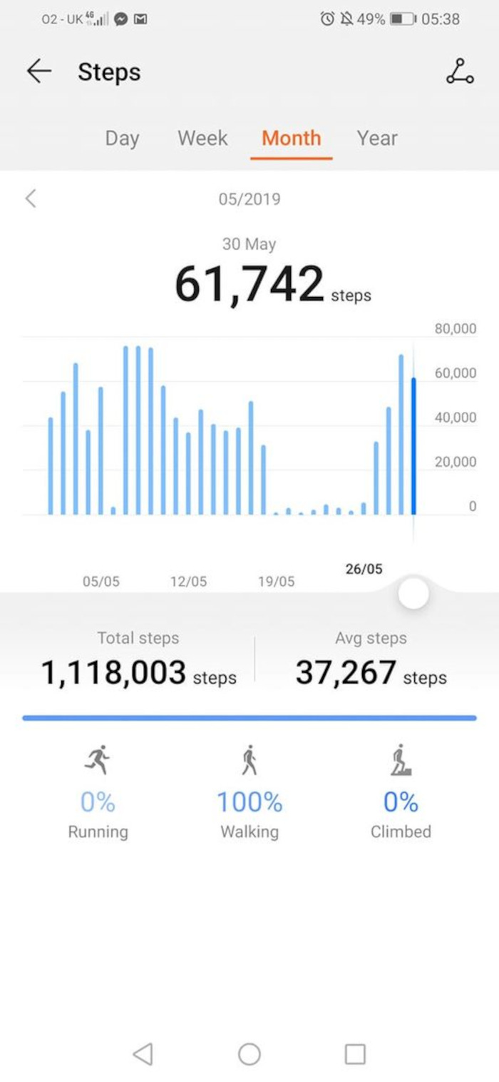 I 2019 gikk jeg i gjennomsnitt 37 000 skritt, totalt mer enn 1 100 000 skritt i måneden, og streifet rundt i hele Storbritannia i årevis, på jakt etter et hjem å være blant folket mitt. Dagen jeg tok dette skjermbildet på Galaxy Note 5, hadde jeg gått 61 742 skritt.