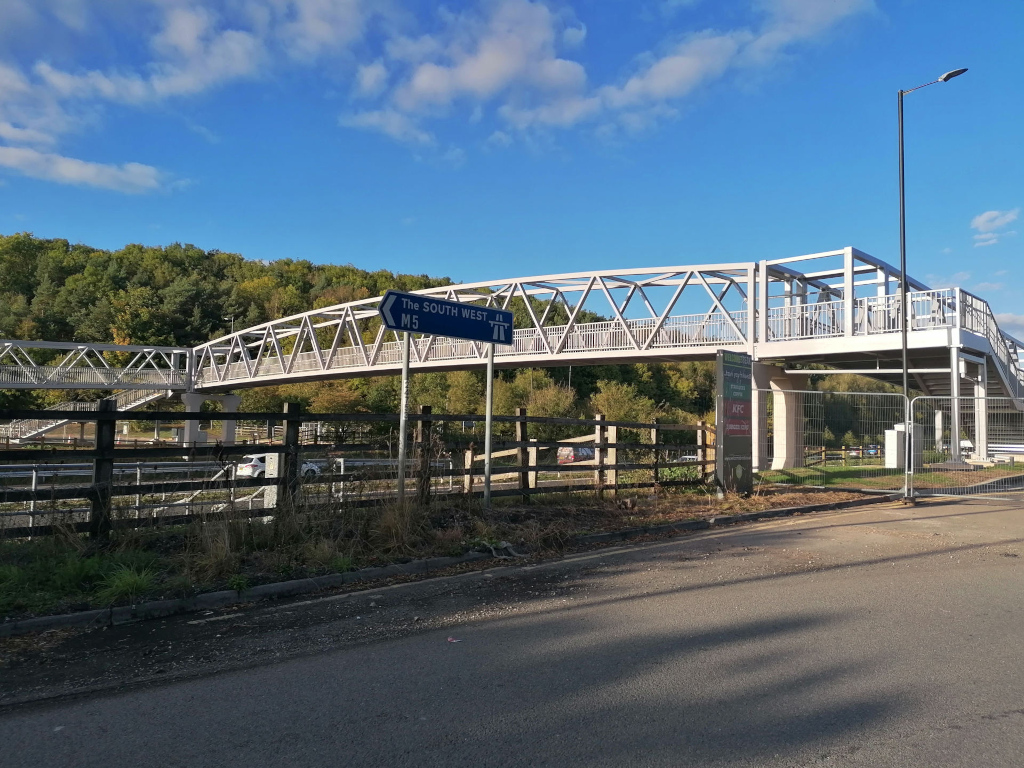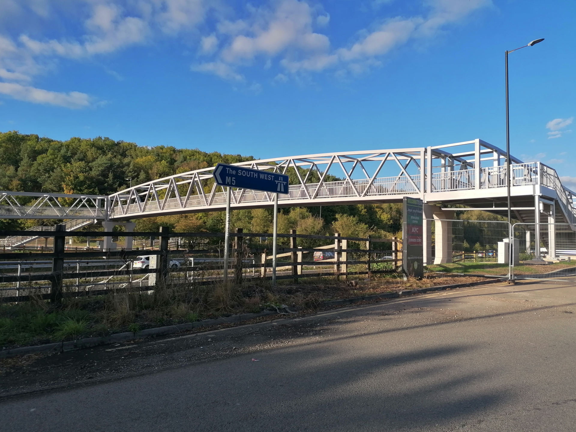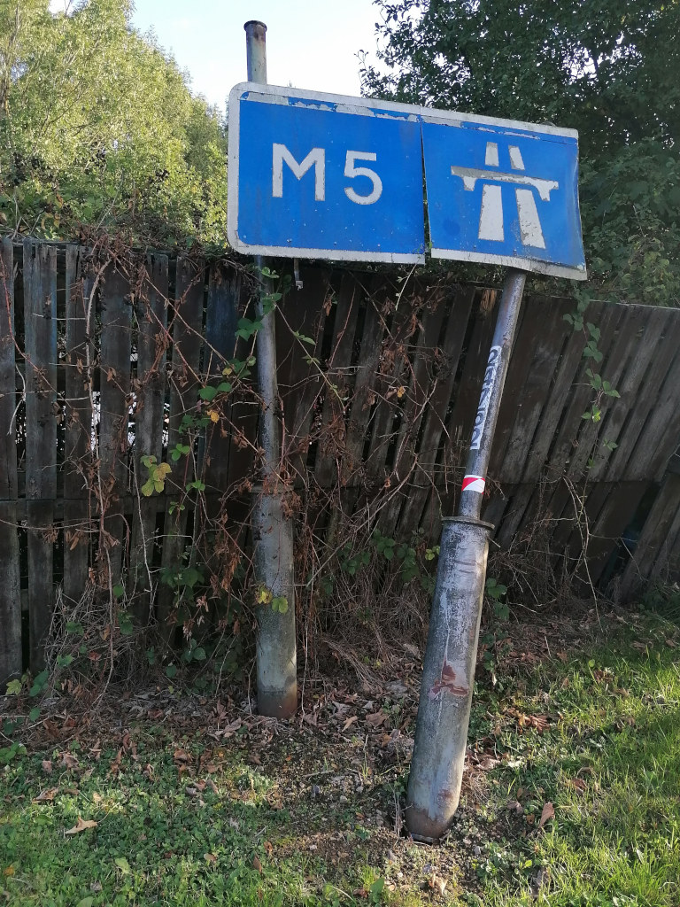 On the way back to the M5 we filled water bottles at Selsley common spring. I waited only a few minutes for a lift that came from a man travelling from Wales in a VW camper van. He took me to Michaelwood M5 services. The place had a new bridge but the motorway signpost had been mashed.
