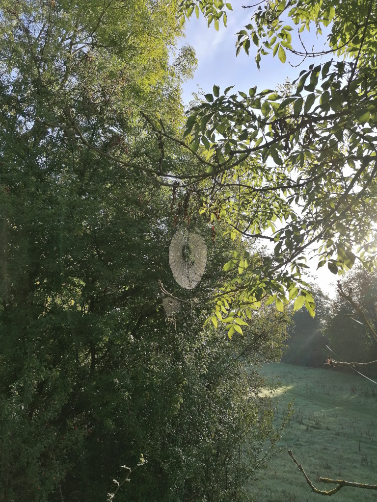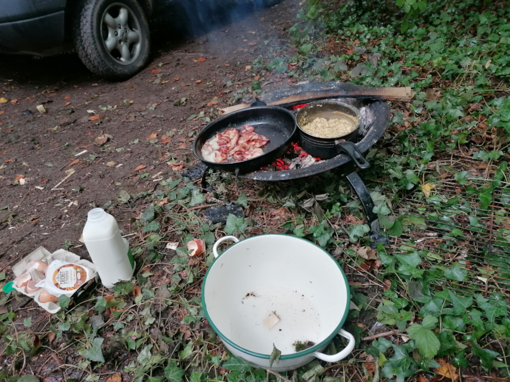 The area surrounding the trailer was bumpy hardcore gravel, there was nowhere to pitch my tent so after some talk over a hot drink, I went over the busy road to pitch my tent in some neighbouring woodland. After erecting my tent I lit a fire and chanted.
