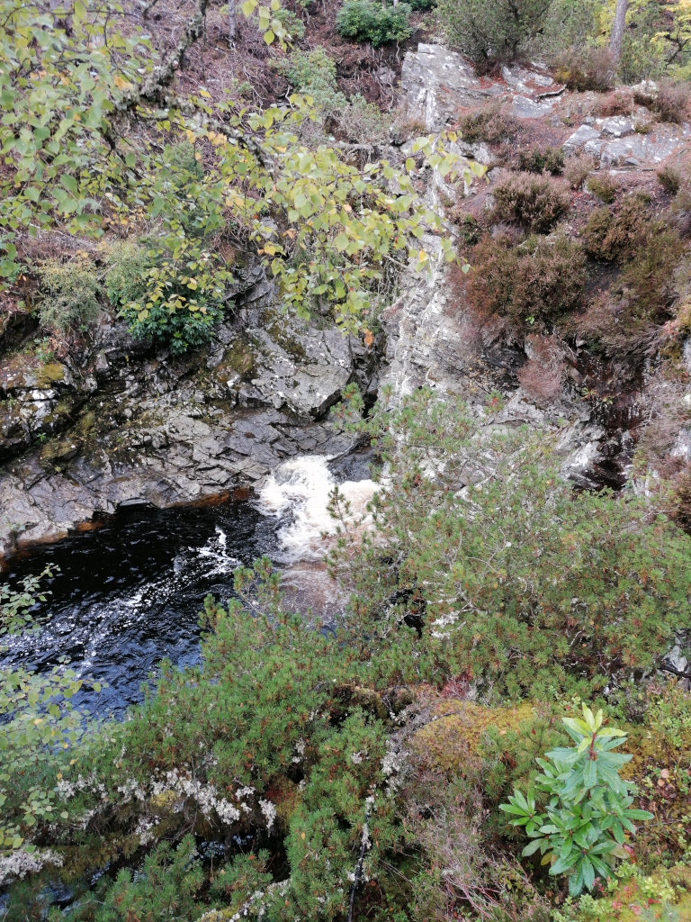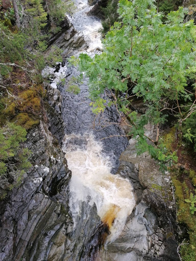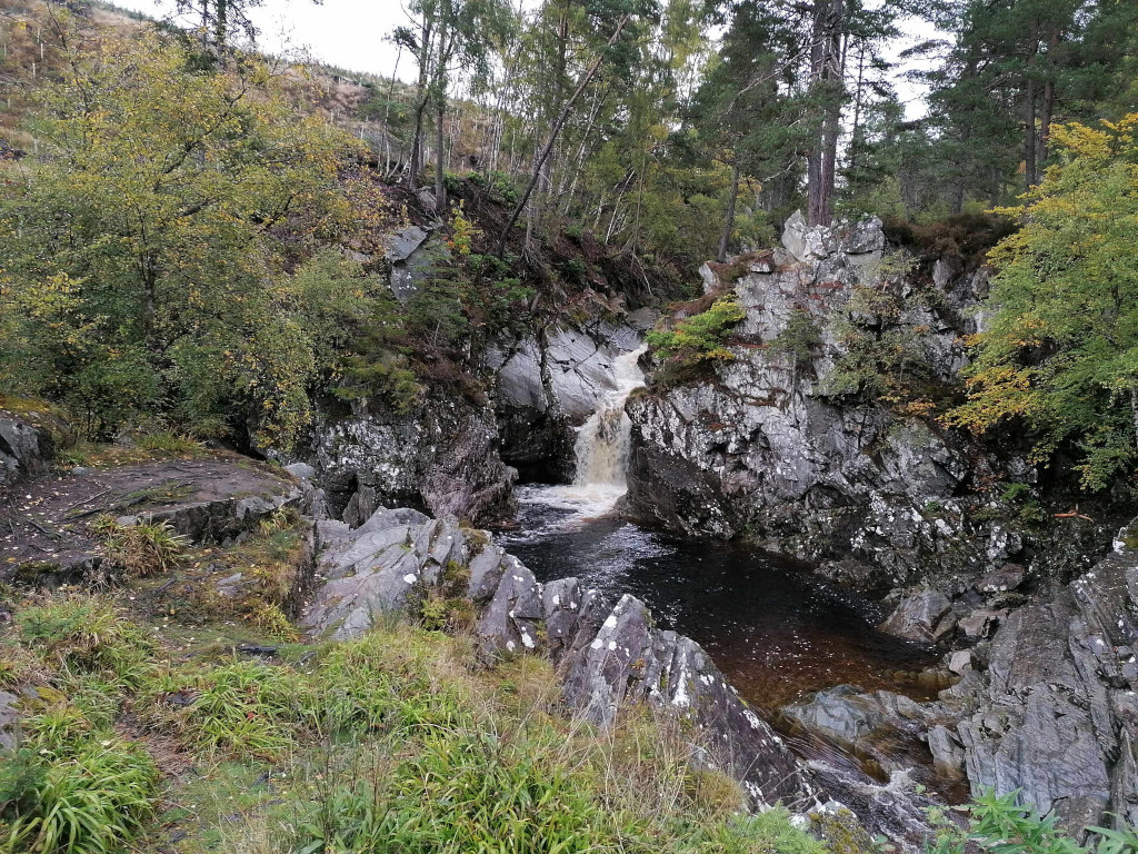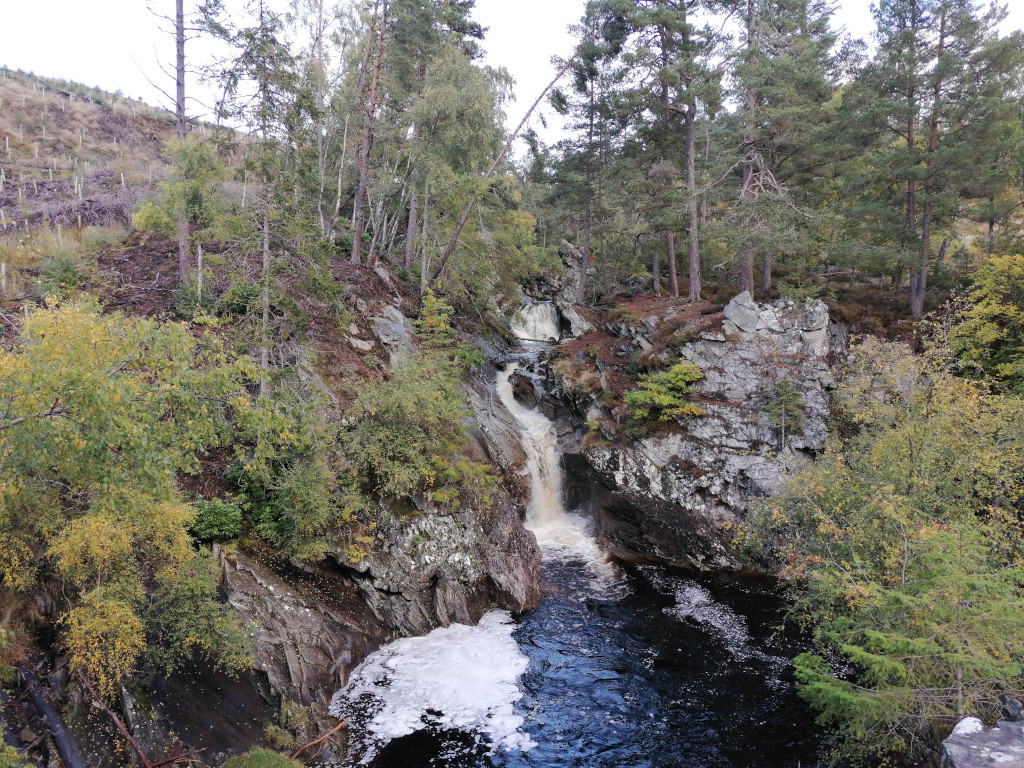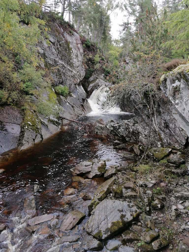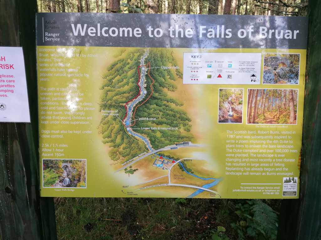 As I walked back to the A9 I noticed a car that had been parked for hours watching me, when I approached the driver and got out with his dog, I thought that strange. My first lift of the day was from a man going into Pitlochry, he was suffering from Lupus disease, and had a sweet dog that pushed its wee head into my lap. He gave me some coins and tobacco before dropping me at a war memorial in Pitlochry. Walking along the street I came across a dodgy Italian man, he had a cornelian ring up his finger, and more or less waved me over to talk to him. I purchased some food in the local supermarket, then made my way out westwards out of town. The next lift was from an amateur photographer, he was going to Killiecrankie but took me to Bruar falls. After visiting the ladieswear department, and the clan museum I walked up the hill to the Falls.