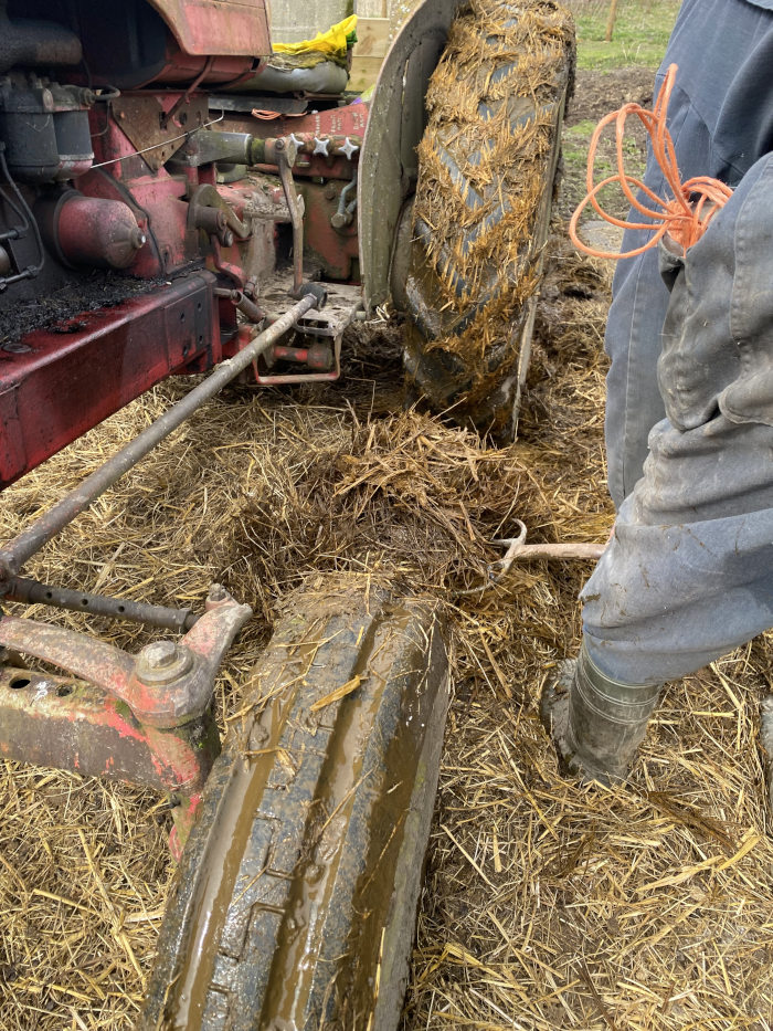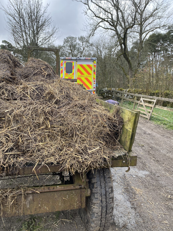 We began to muck out after struggling to get the tractor with the tipping trailer over the poly tunnel bedding. The smell is nauseating, not unlike rotting brussel sprouts. To lift the muck out the fork has to be plunged in at a diagnal line, to lift the muck out in layers, to steep a plunge will make the muck to heavy to lift into the trailer.