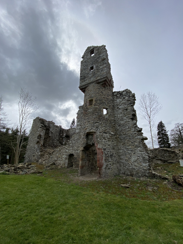 It's a sunny bright morning outside, Charlie is in the Kitchen today, making breakfast as I am doing his routine farmyard chores due to his hop along bad ankle. Now that I finished the jobs the sky has become overcast grey, Charlies ankle is better, so we're doing some errands today. This morning, Charlie purchased me some pink crocs slippers, so my feet are not freezing on the bone chilling cold farmhouse floor. I've continued writing these paragraphs, whilst he is preparing himself to go out; he takes a long time to do his to do, adding more to-do's one after another; leaving me waiting around for anything between thirty and sixty minutes. In the afternoon we fetched a replacement hydraulic pipe for the tipping trailer, then checked on the sheep at our two grass keeps. We stopped at Galashiels, where I found a back clip to fasten my earring, then we journeyed towards Clovenfield. I took some pictures of a tower I visited last year, which I's mistook for a Peel tower, but was in fact a border home of the Pringle clan. According to history, they just locked the building up, then left it to fall down.