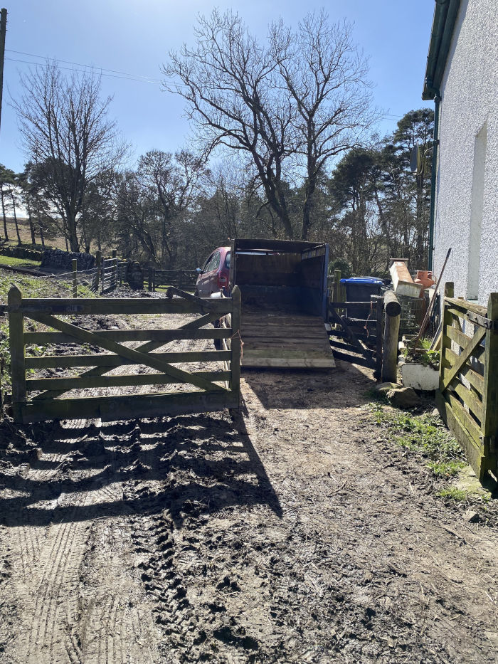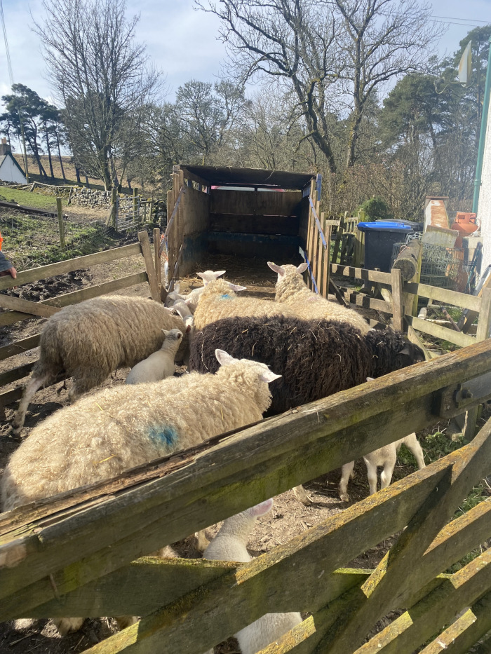 Today I woke late, about 10am, I was awake till 3am, updating my account on Twitter. This afternoon, Charlie took me to the farmhouse, he has fixed his trailer to taxi sheep to the new grass keep near Selkirk. Four ewes, each with two lambs were the first to be loaded.