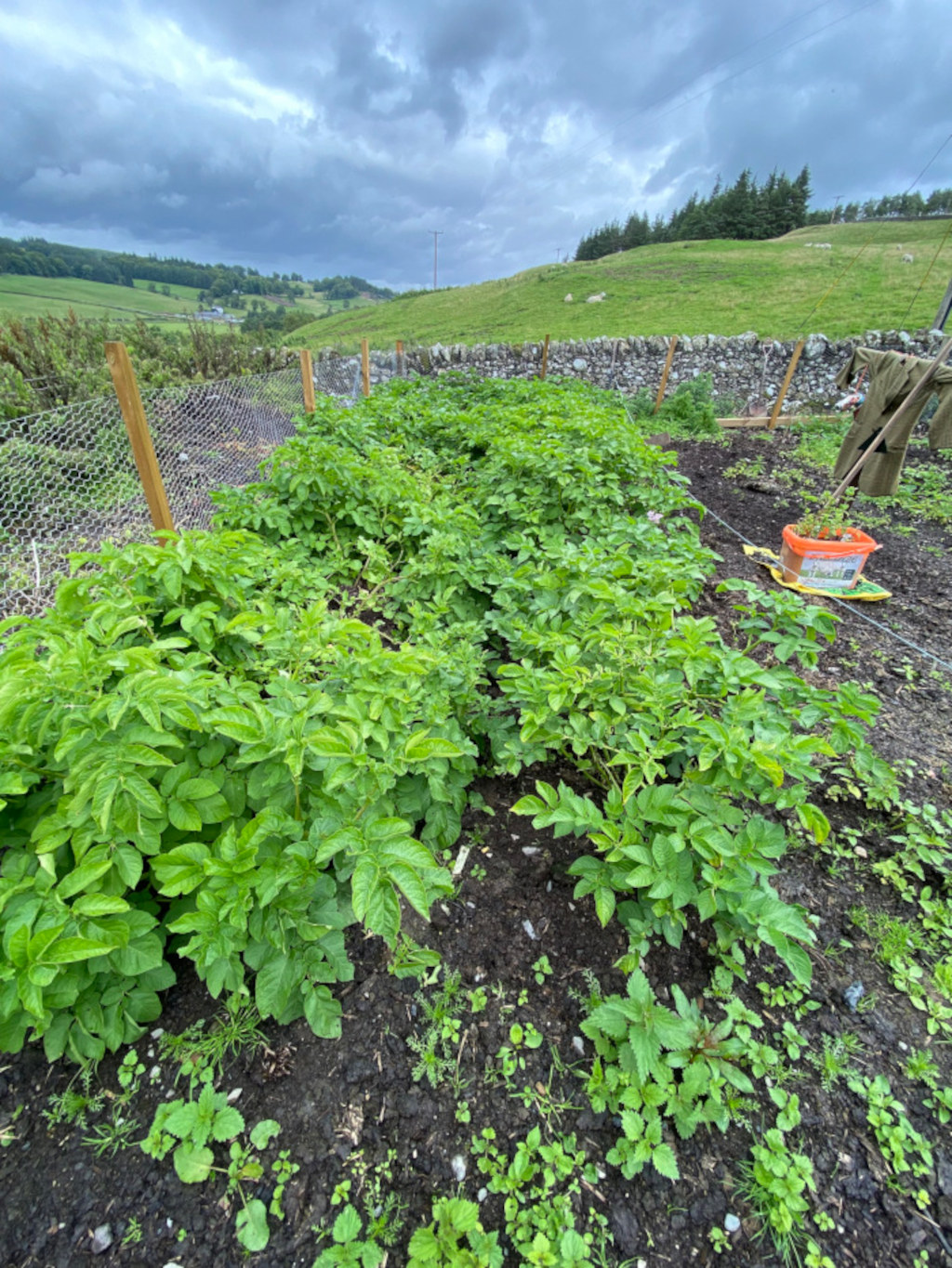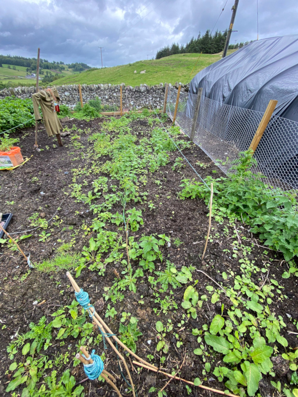 Rabbits and birds consumed almost half of our kitchen garden. We sealed the perimeter with posts and wire, but were too busy to continue the work. We anticipate a good crop of potatoes this year, but the French dwarf beans, swede, carrots, and onions have all been devoured by weeds.