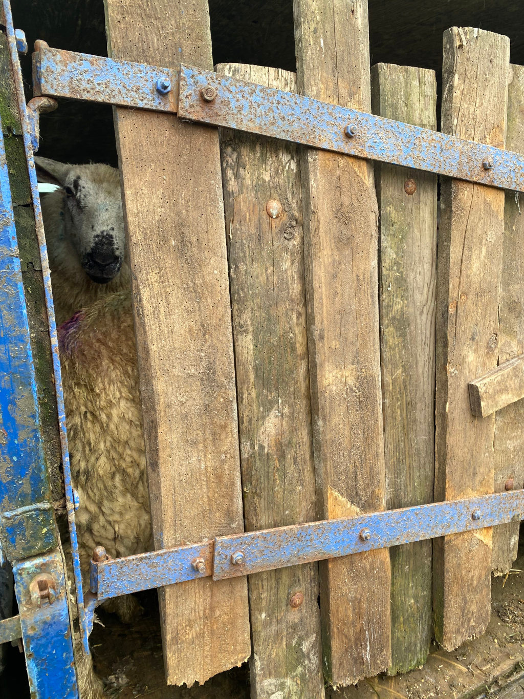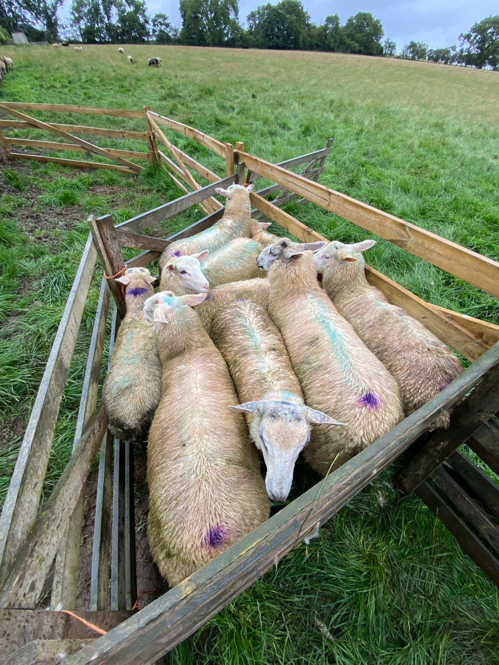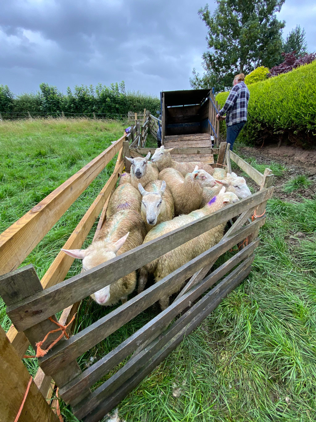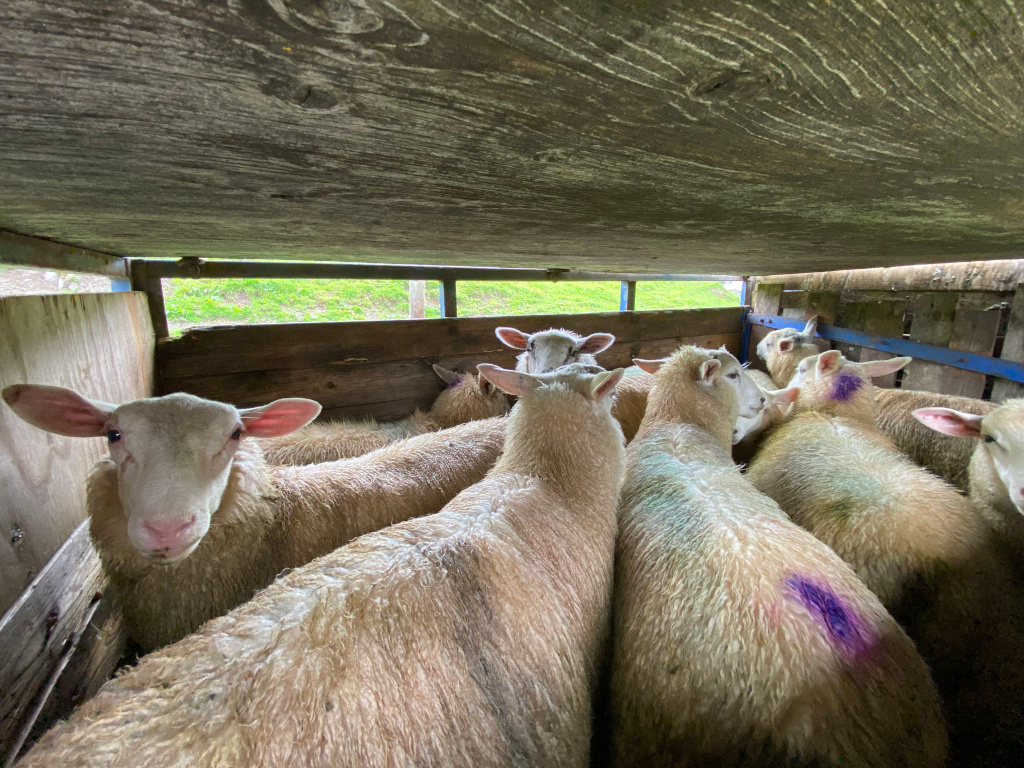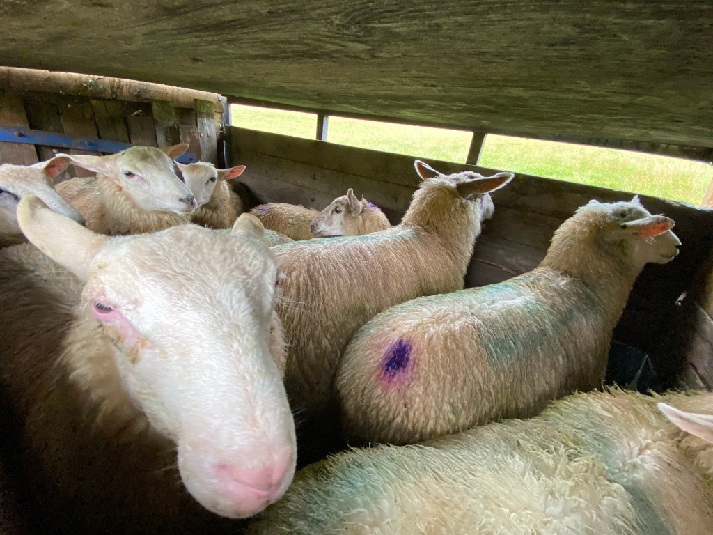After spraying the mother ewes, we released them, leaving us with three ewe lambs and six tups lambs. When they were put into the trailer, they seemed calm and excited about where they were going. The violet paint on them should be on their hooves, but Charlie marks them with it sometimes.