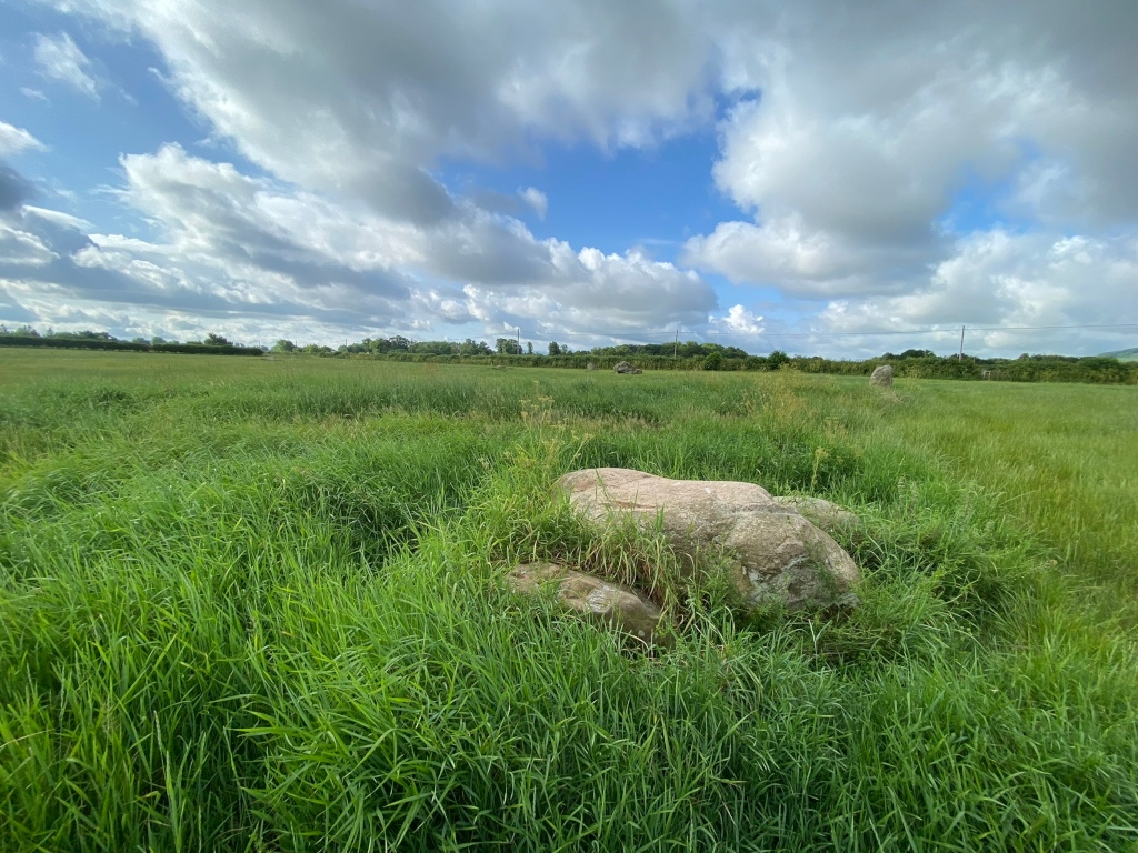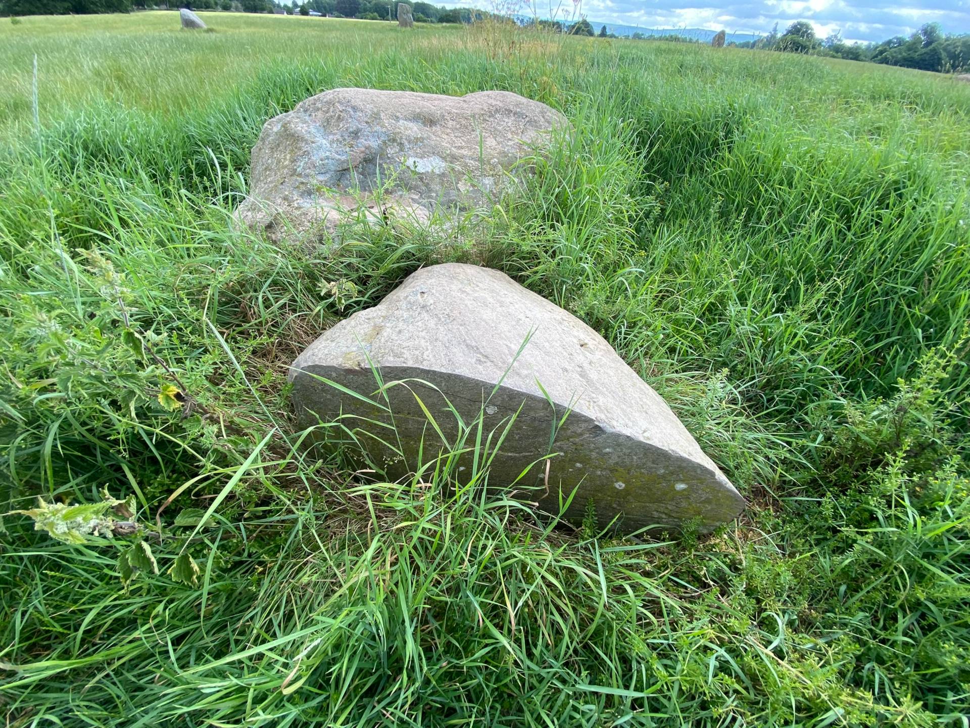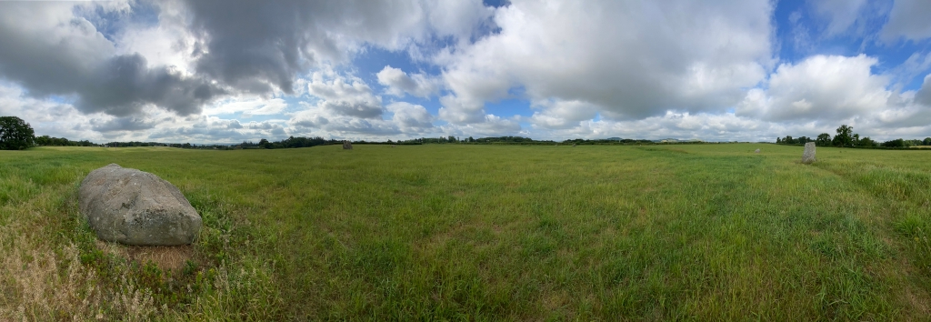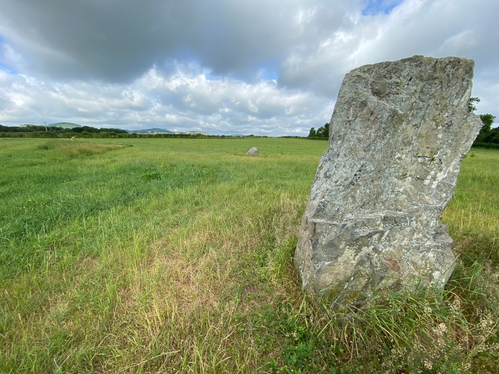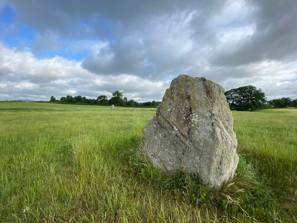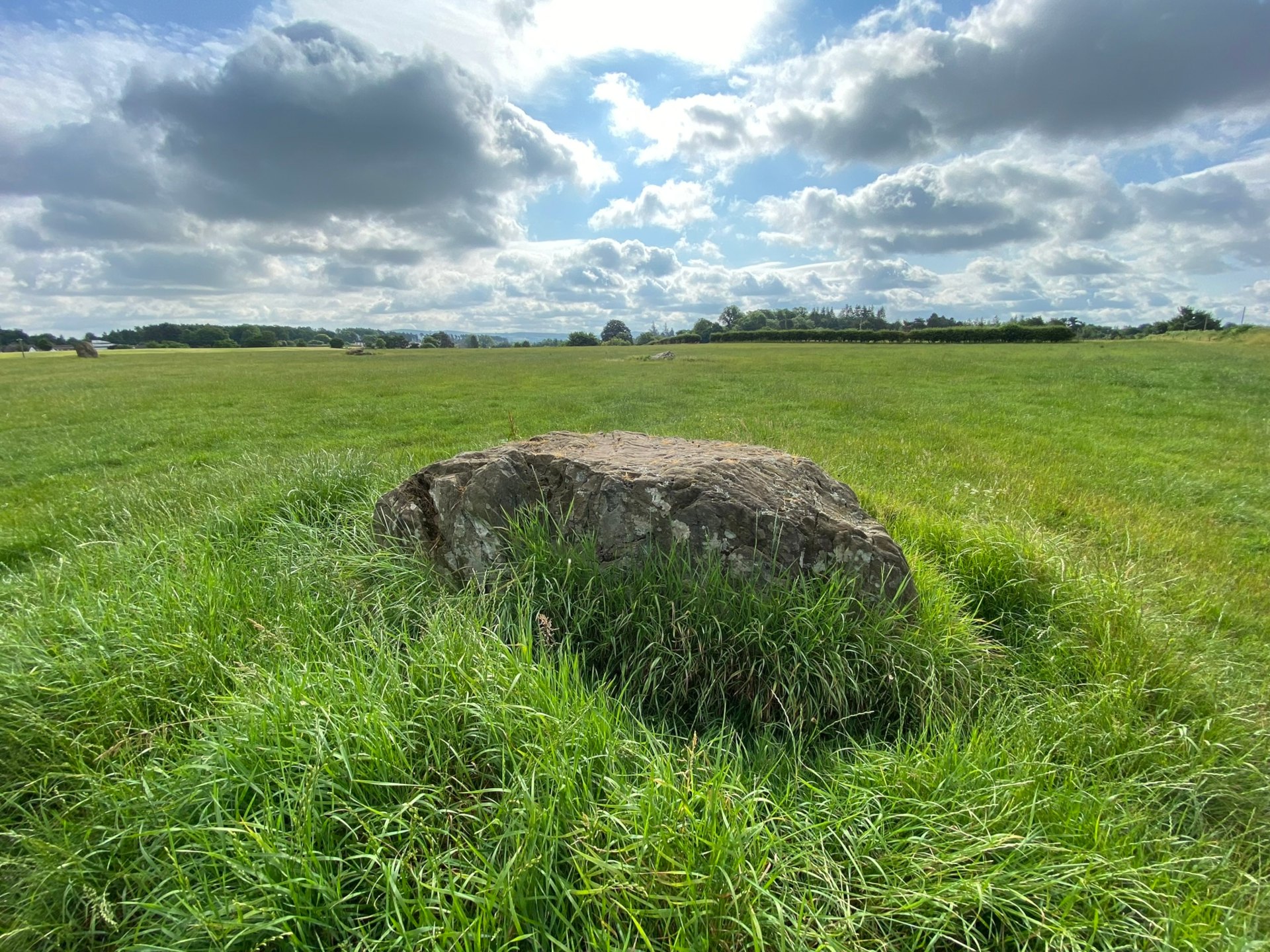 The stone circle was reputed to be the largest in Scotland. We parked in a small lay by north, from an information plaque walked five hundred yards though a grass field into the centre of the circle. We arrive five hours after sunrise, other than deflated blue and gold balloons tied to a gate post there were no other indication of people having been here.
