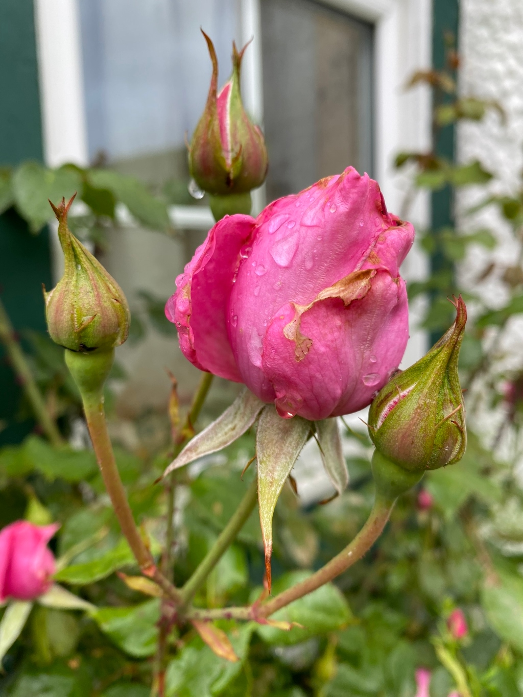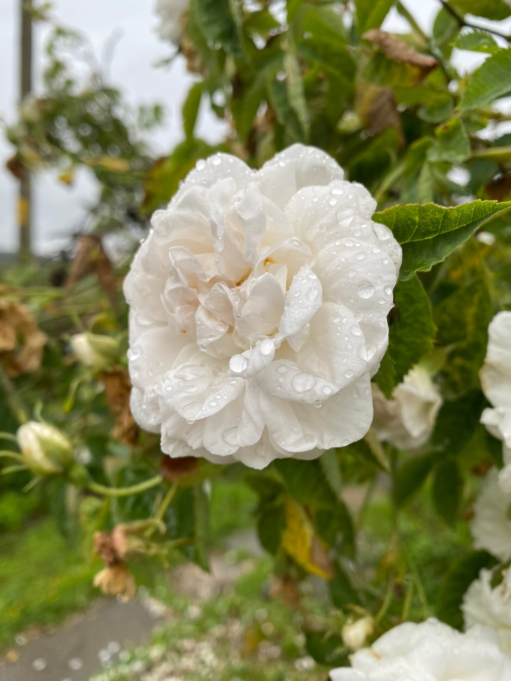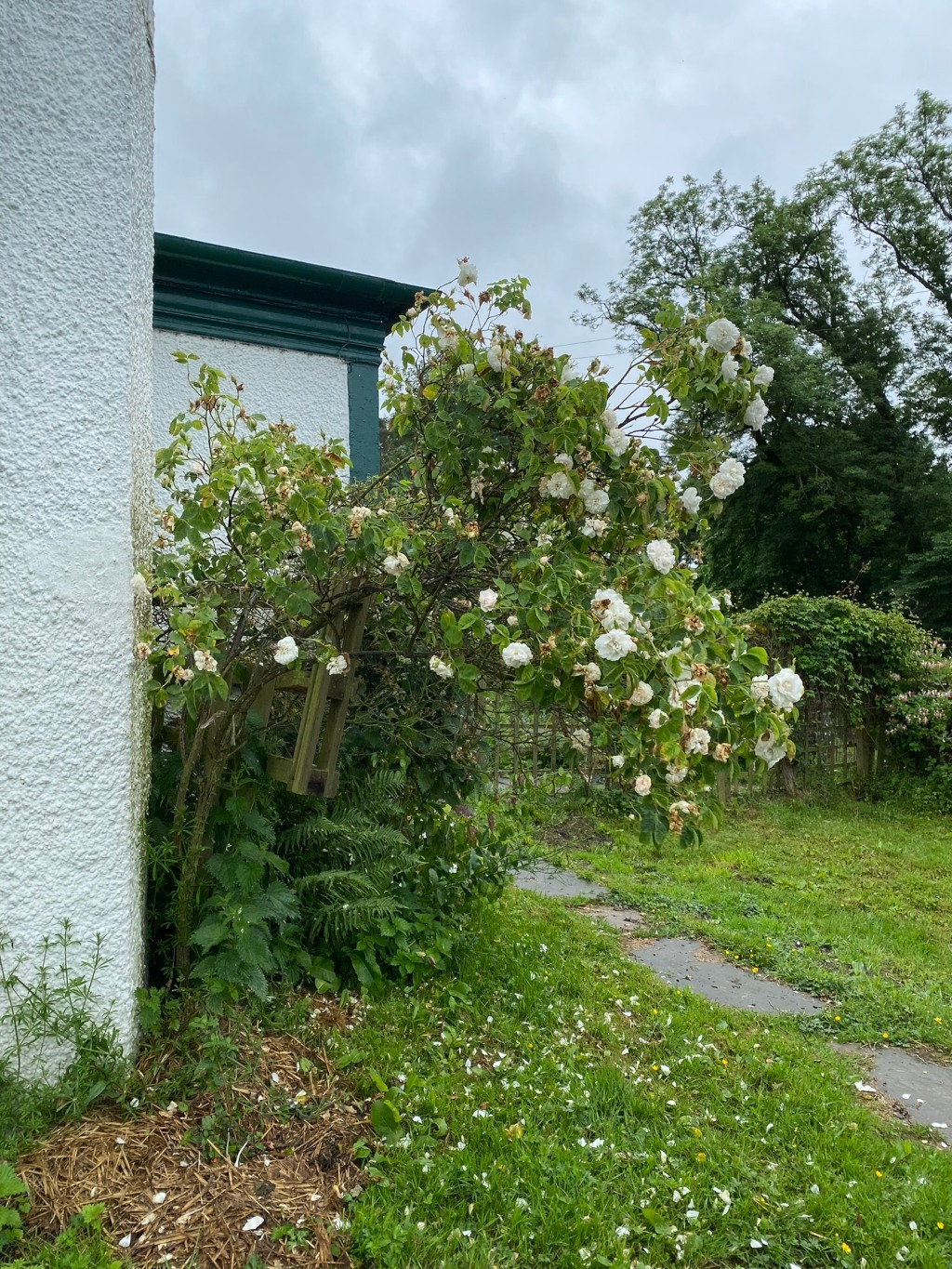 I have a terrible headache, the sheep are avoiding the pouring rain, but the kitchen garden is bursting with colour. The hillside has been saturated, and the stark contrast between green and brown has intensified, highlighting the pale whiteness of the roses that extend from the northwest corner of the farmhouse. It appears that the fungicide I sprayed has eliminated rust from the rose bush. I'm happy that we discovered and removed the bright orange mould in time for the bush to bloom this summer; it really complements the farmhouse's aesthetic.