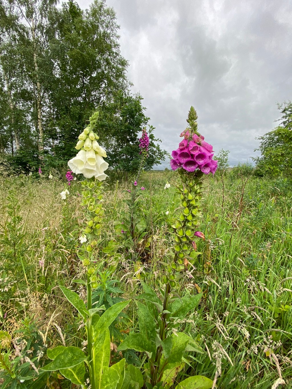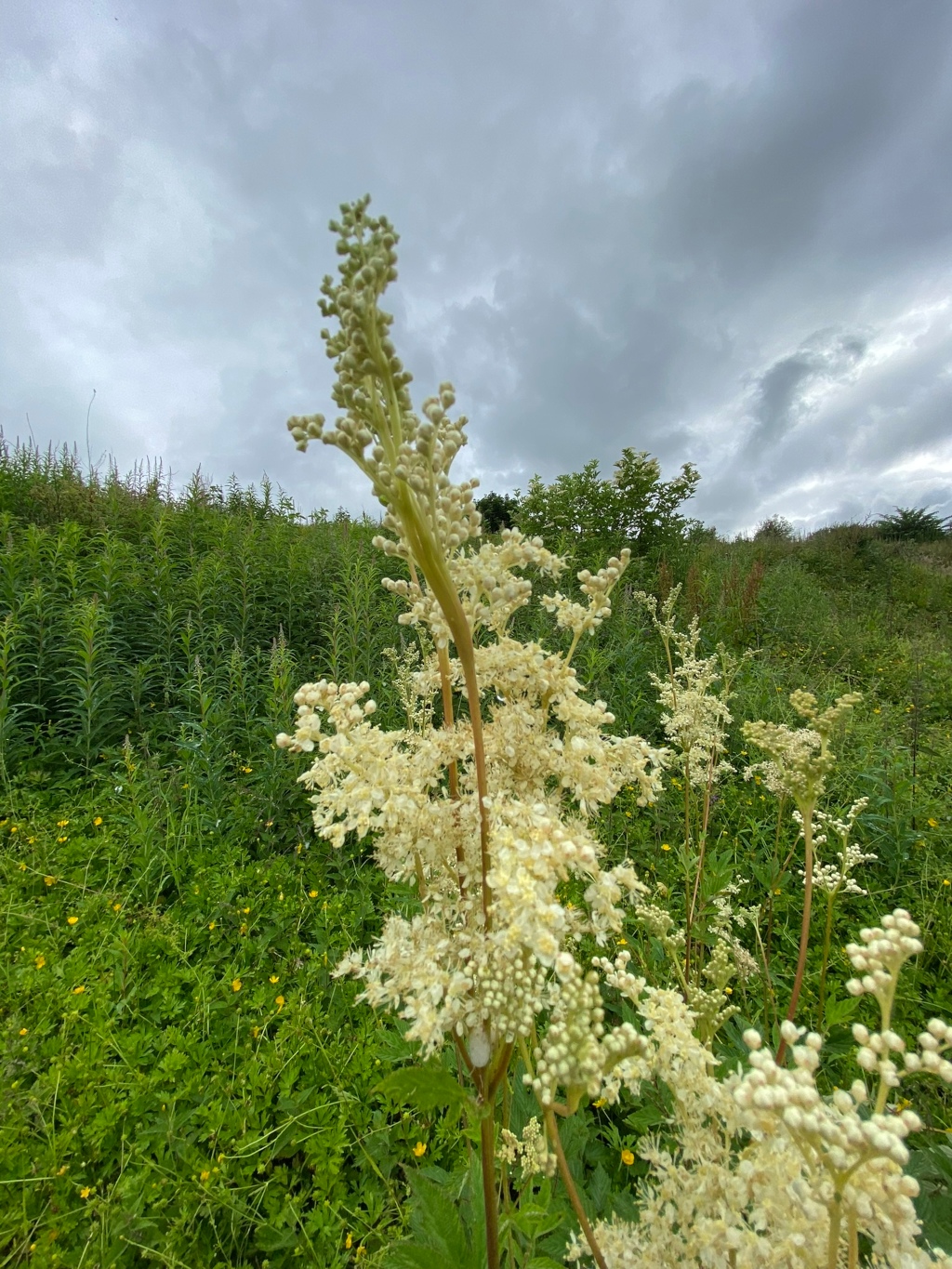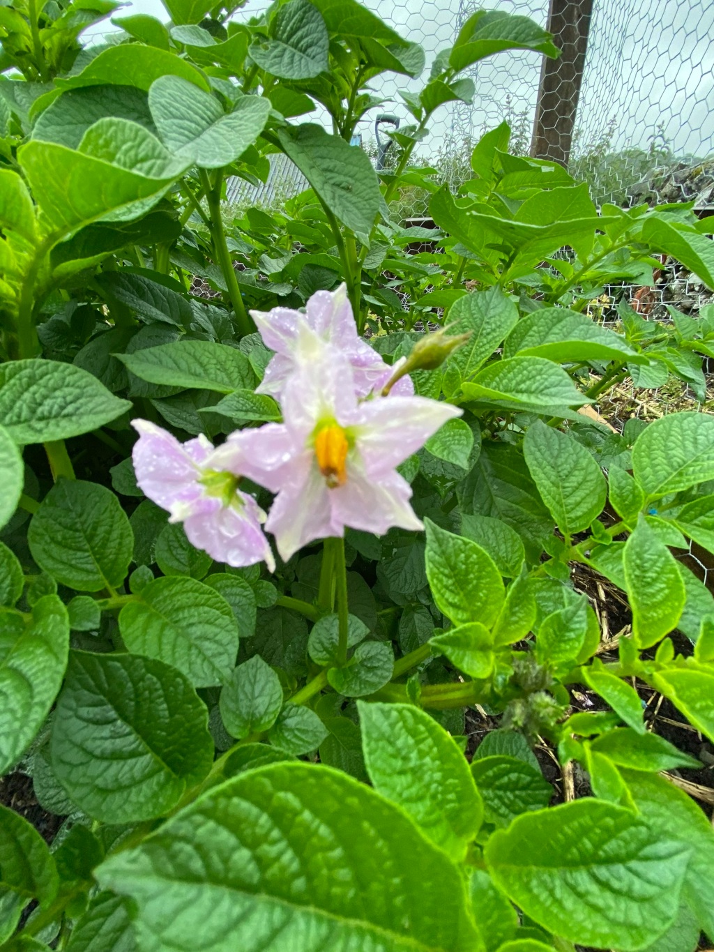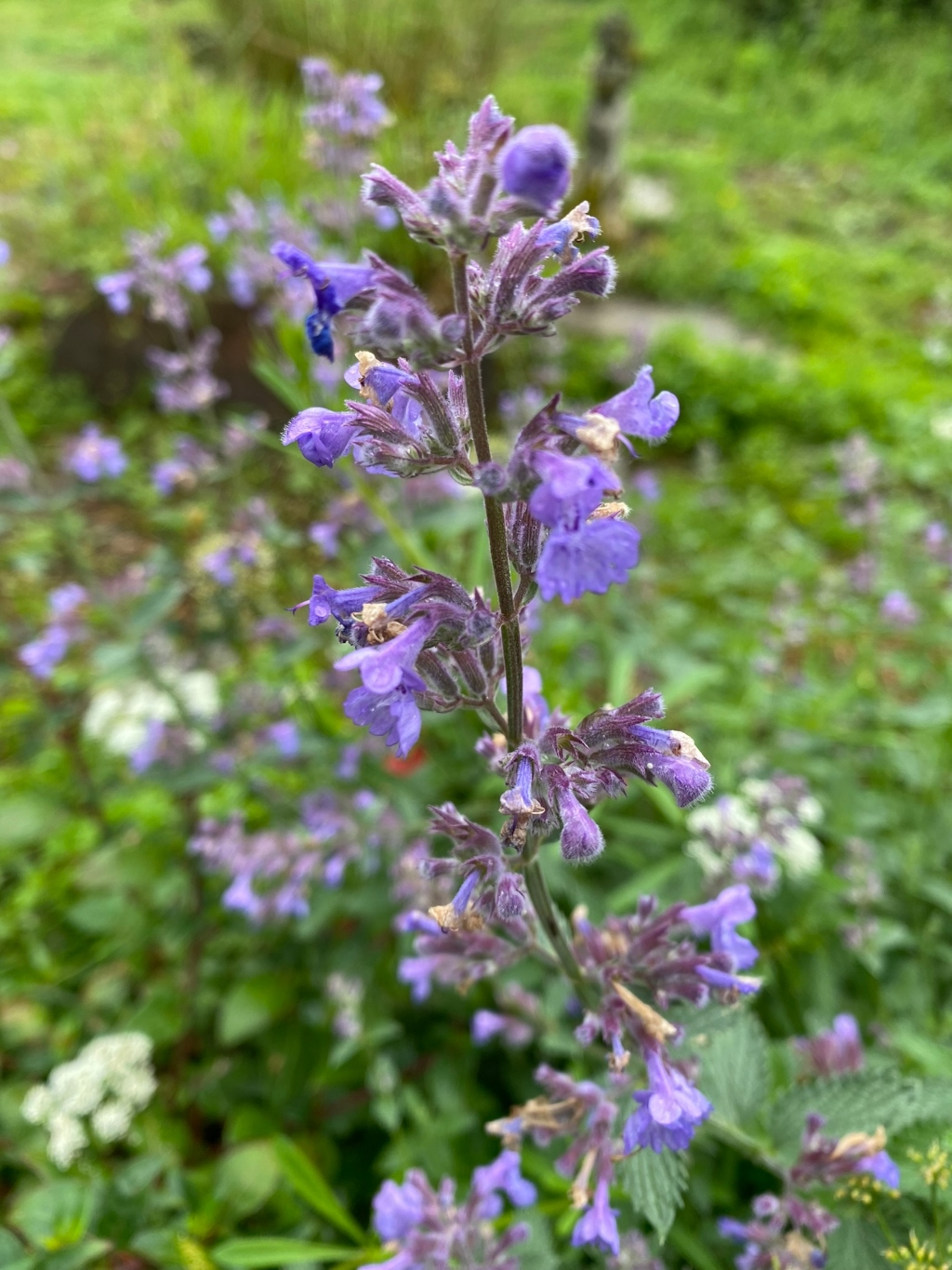 I have a terrible headache, the sheep are avoiding the pouring rain, but the kitchen garden is bursting with colour. The hillside has been saturated, and the stark contrast between green and brown has intensified, highlighting the pale whiteness of the roses that extend from the northwest corner of the farmhouse. It appears that the fungicide I sprayed has eliminated rust from the rose bush. I'm happy that we discovered and removed the bright orange mould in time for the bush to bloom this summer; it really complements the farmhouse's aesthetic.