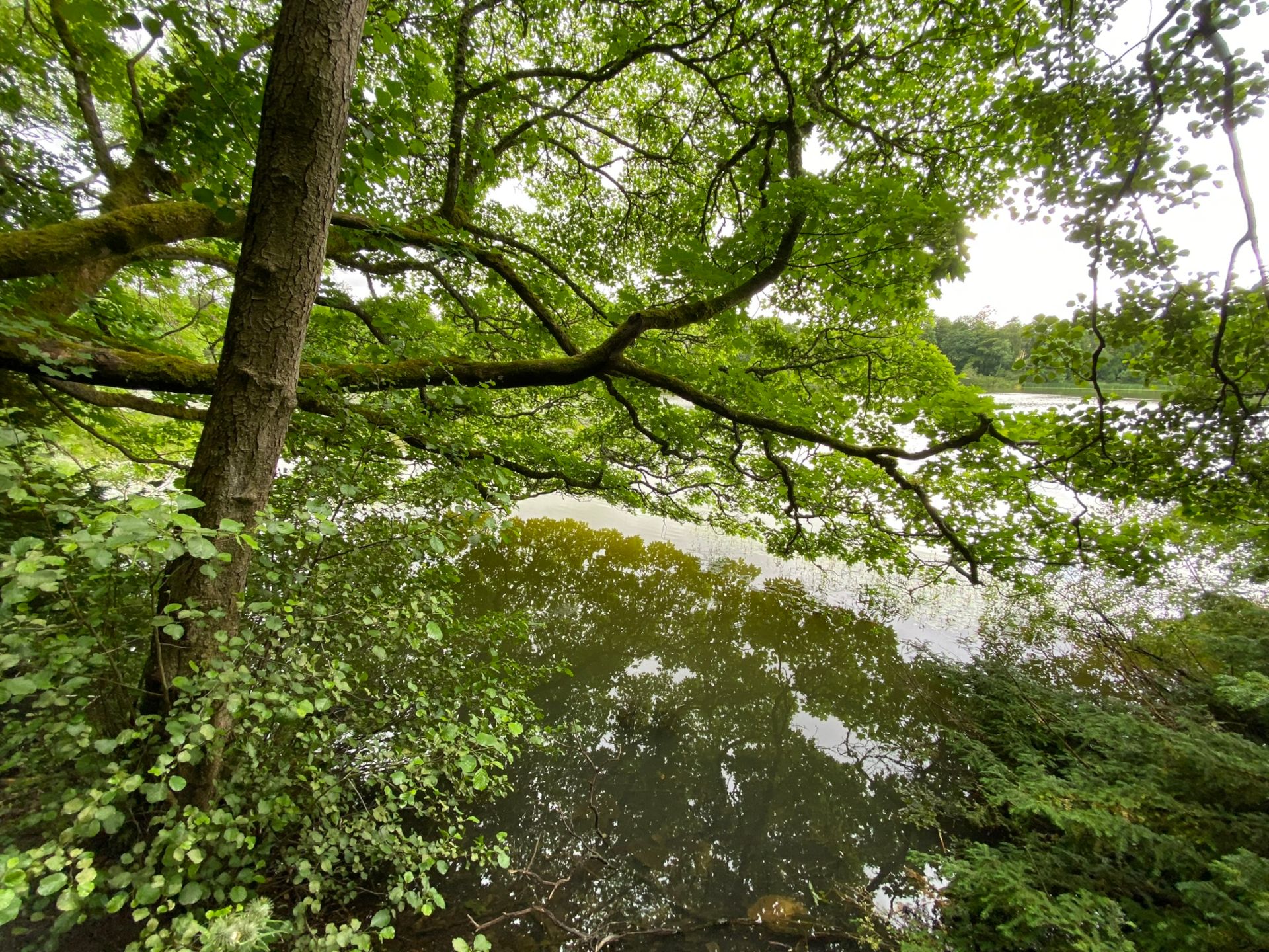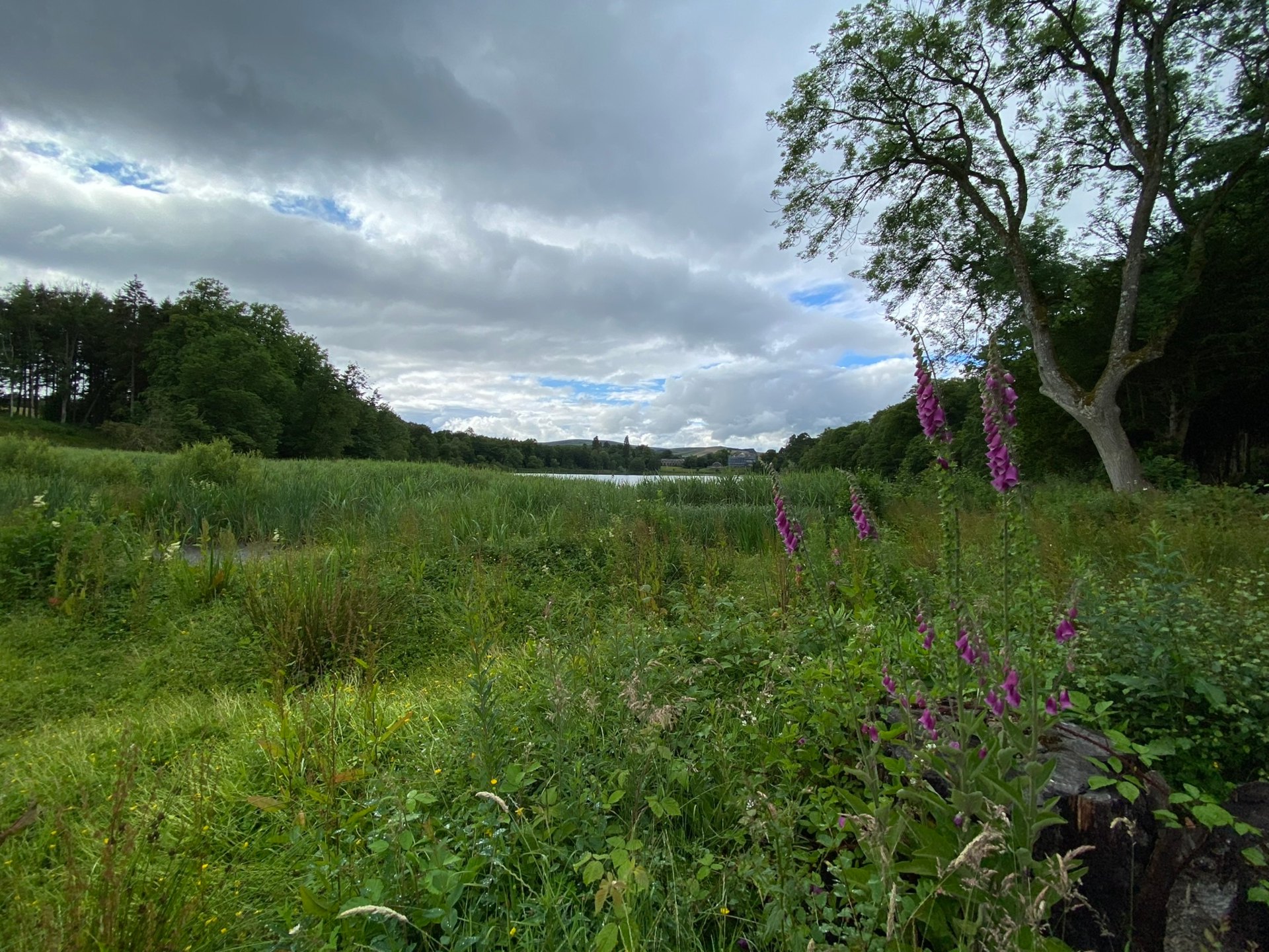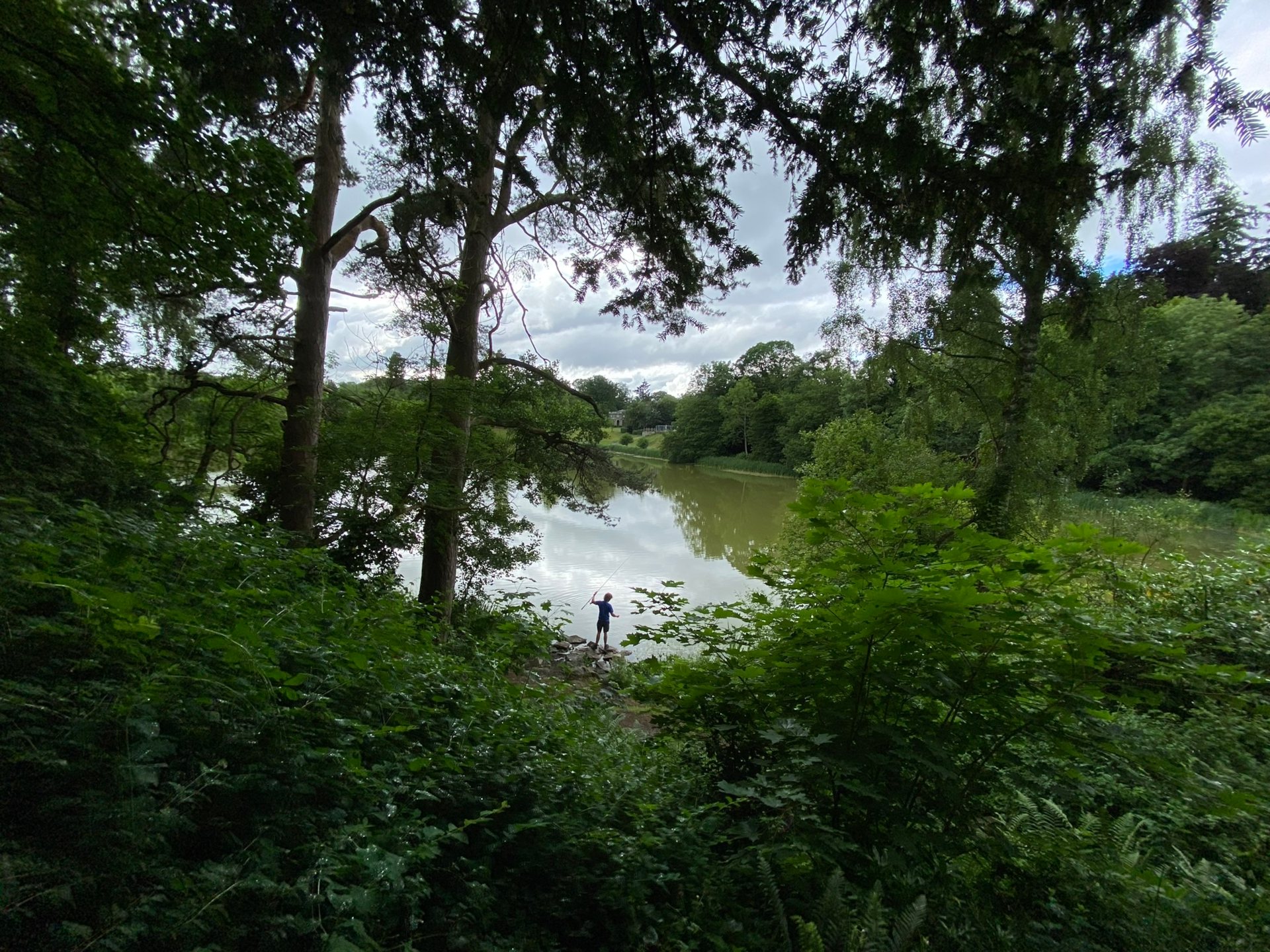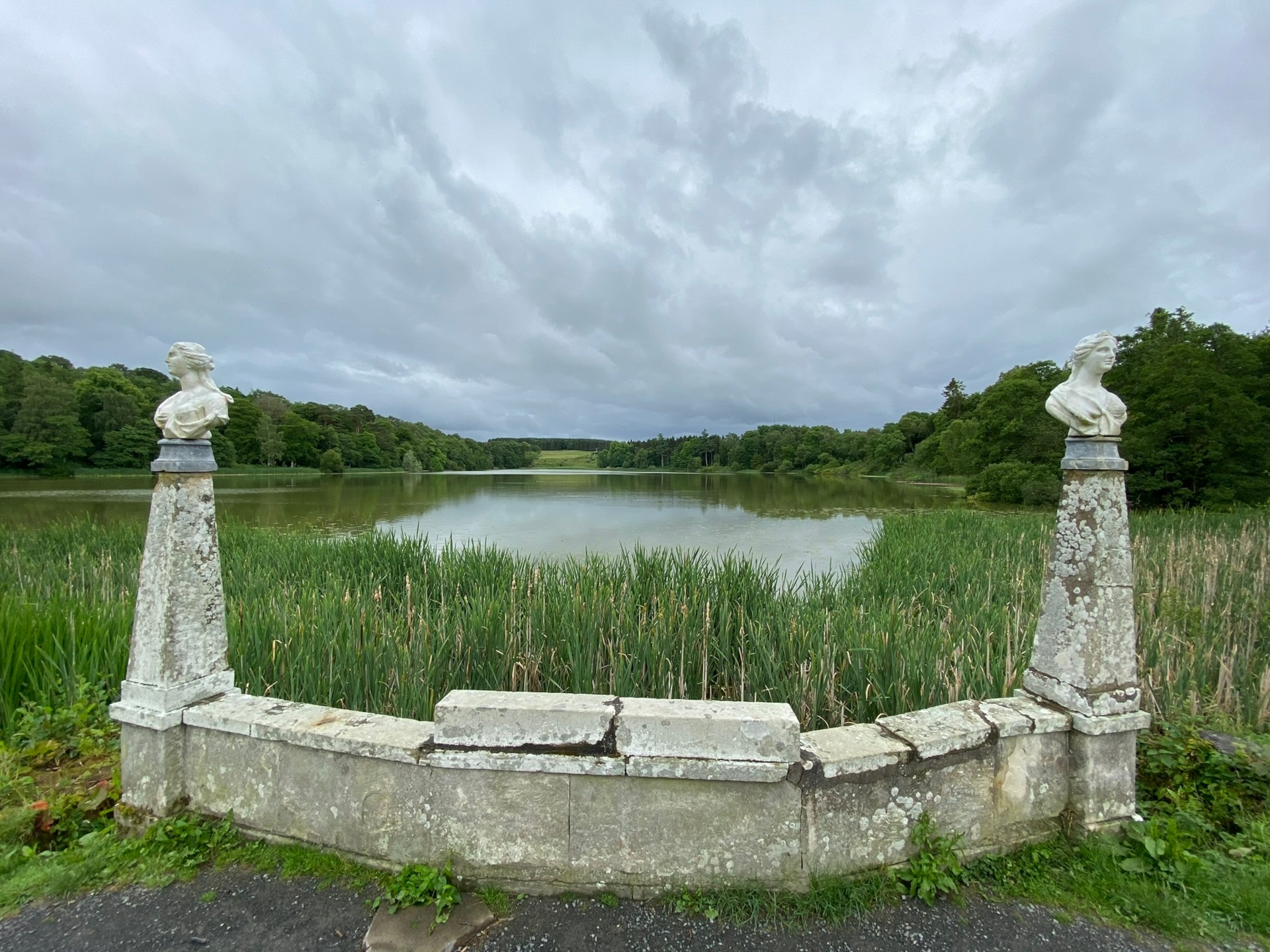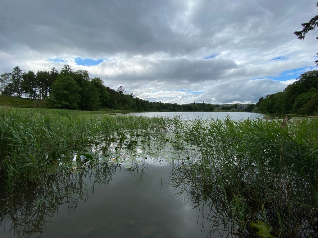 On the way back to Borthwick Water, we went to Hanning, Selkirk, and discovered the small loch to be peaceful and pretty. Last October, when it was colder, I had been here before, but this time the manor house was surrounded by scaffolding and roped off. The owner of this estate, according to Charlie, kept many cats. He left the estate to the people of Selkirk after his death, and they came and helped themselves to the statues, leaving only a dozen now.