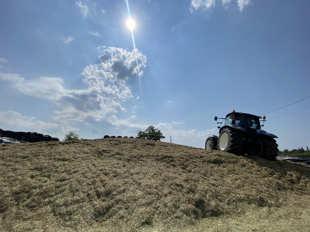 The silage hill has to be flattened to squeeze out air from potentially ruining this livestock food.