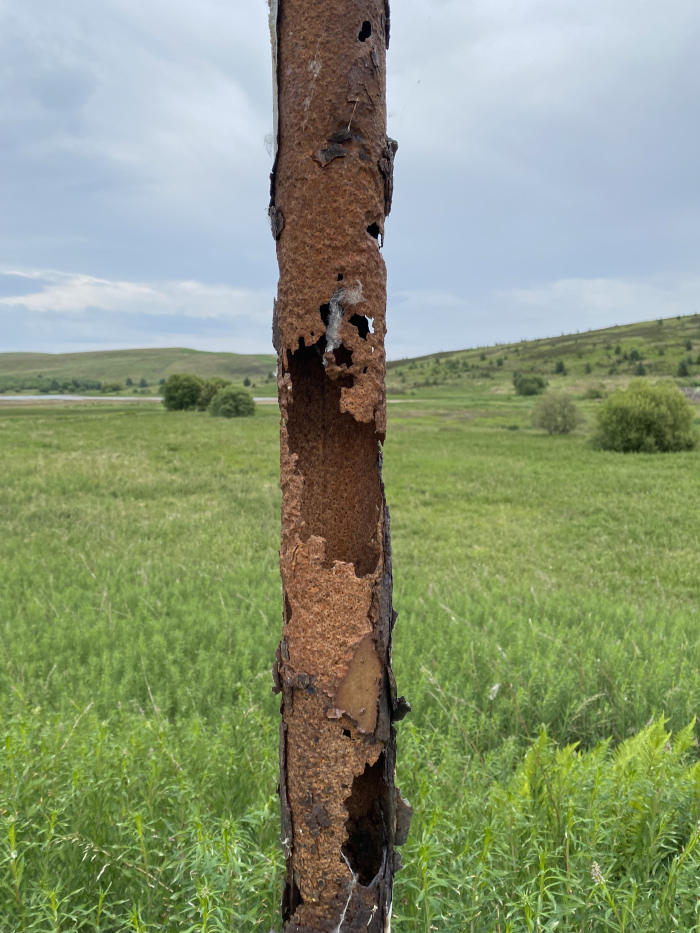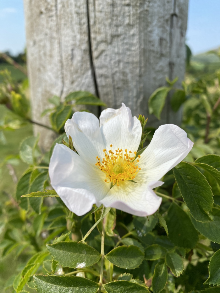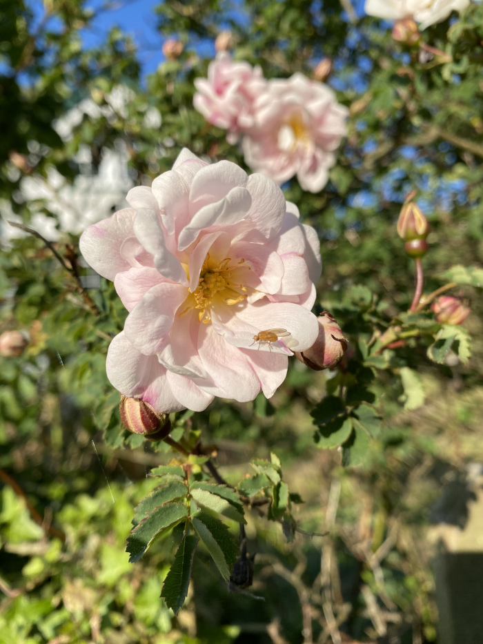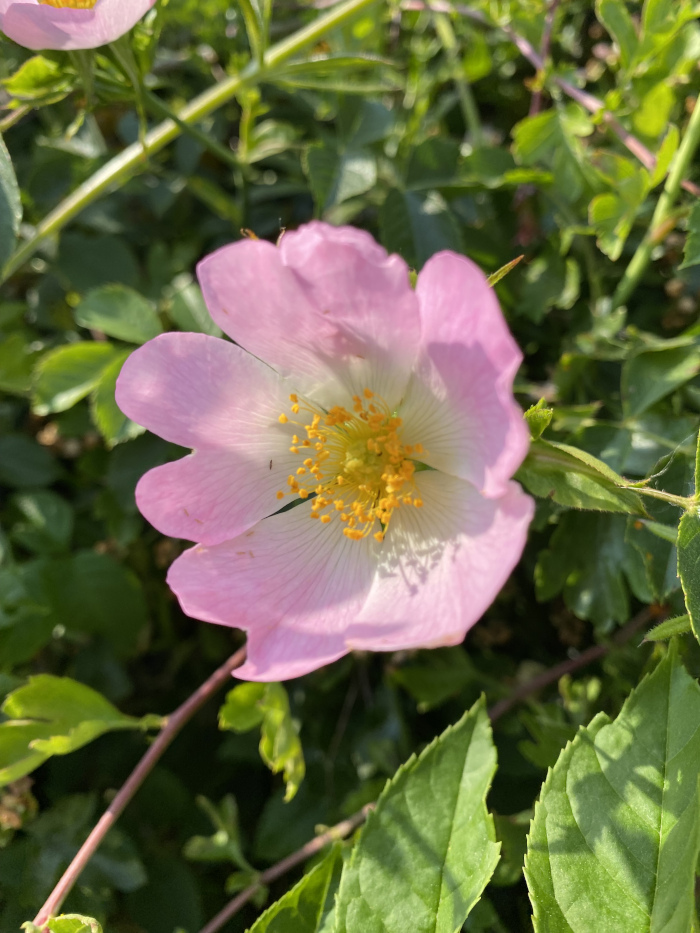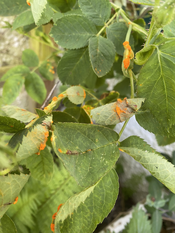 I noticed a bright orange powdery substance on a rose bush, I researched then suspected this to be a fungal infection known as rose rust. This rose bush is located to the North West side of the farmhouse, which led me to believe this to be fungal (shady area of poor sunlight).
