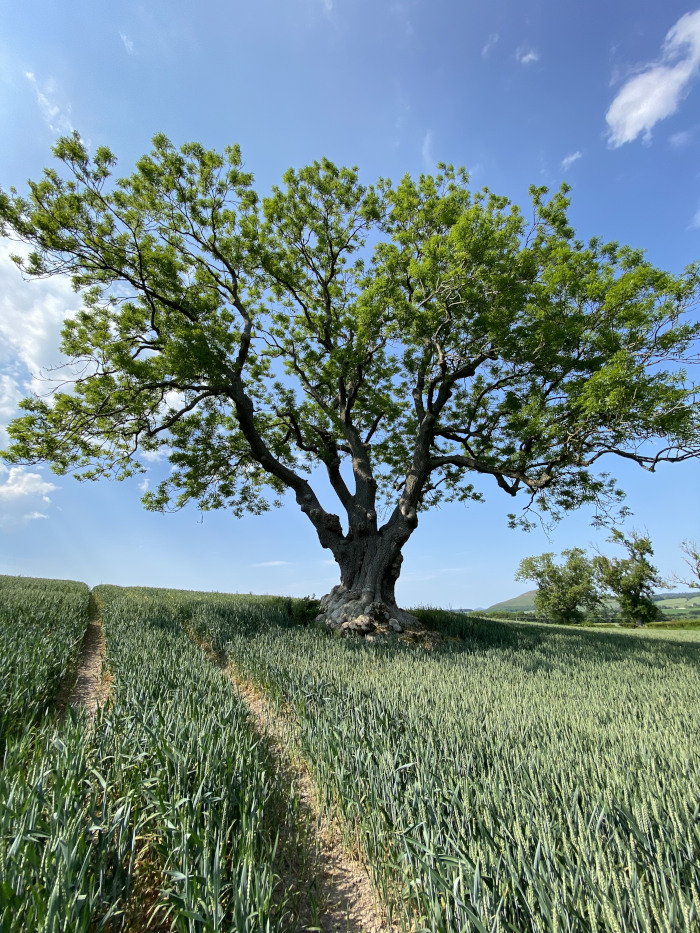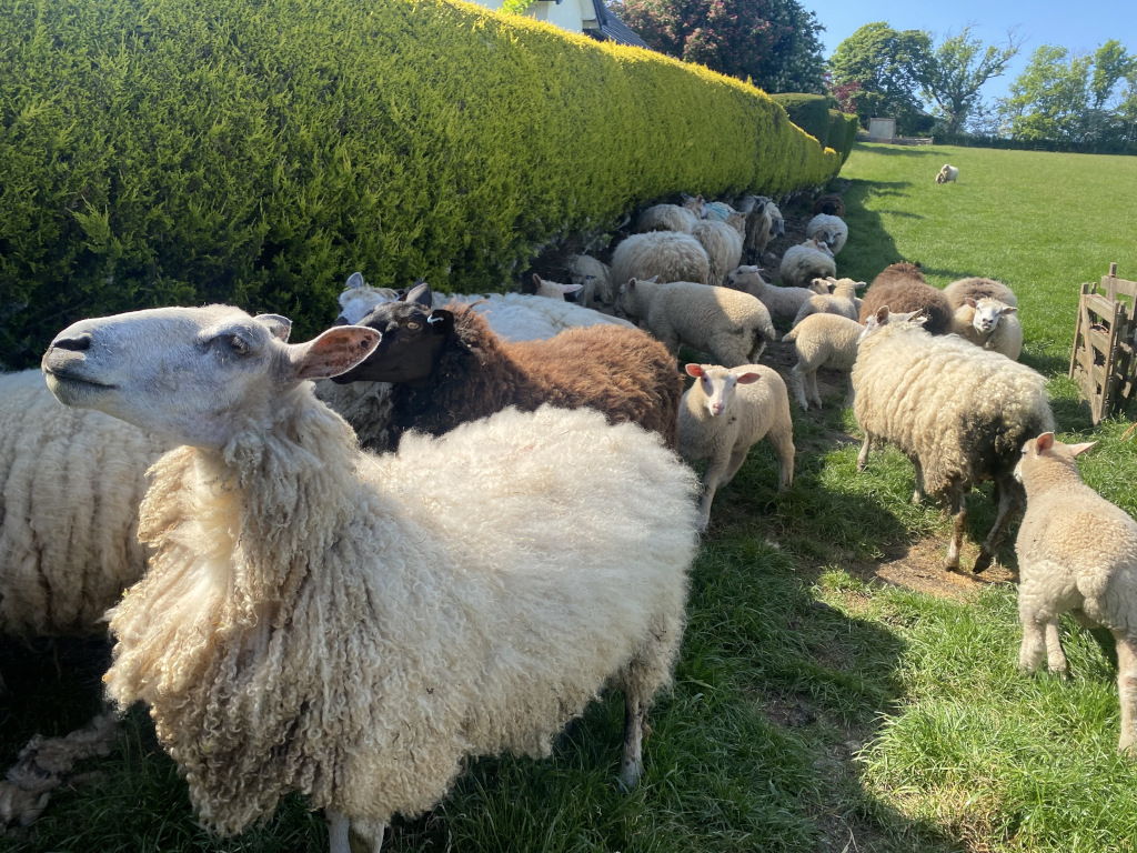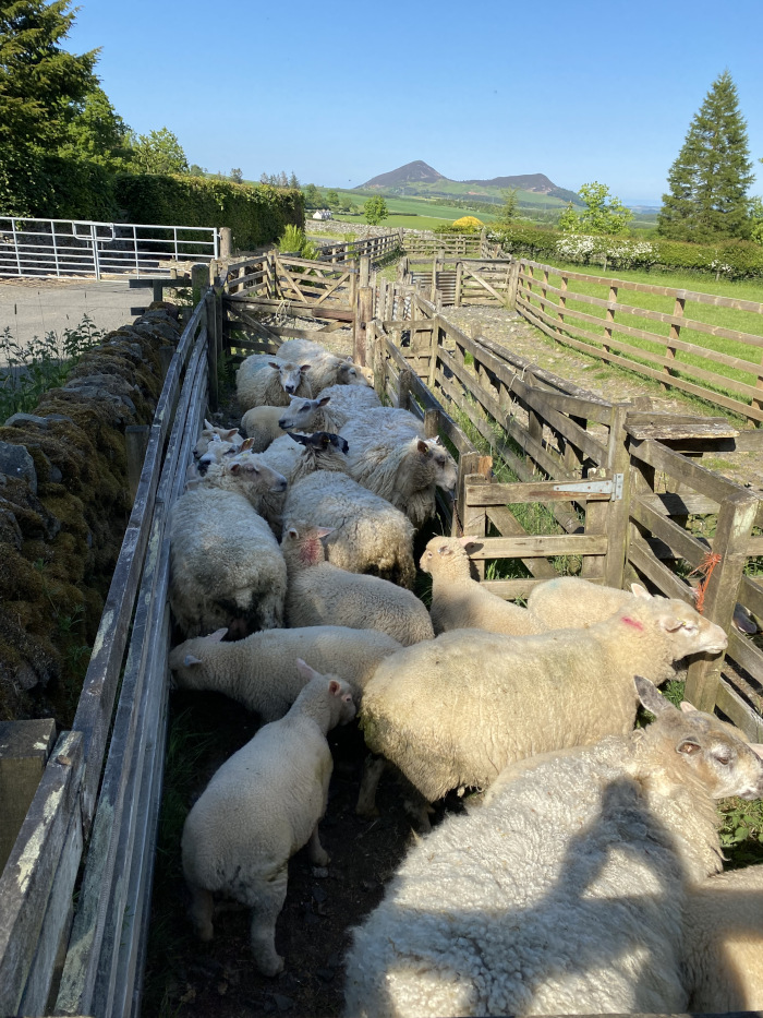 Later we went to the 3rd grass keep to find the ewes and lambs had eaten all the grass! We returned this small flock to the regrown original field after they had been sheared. They were rounded up at the far end of the field, but a tree.