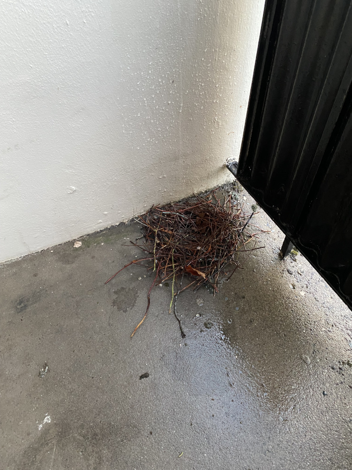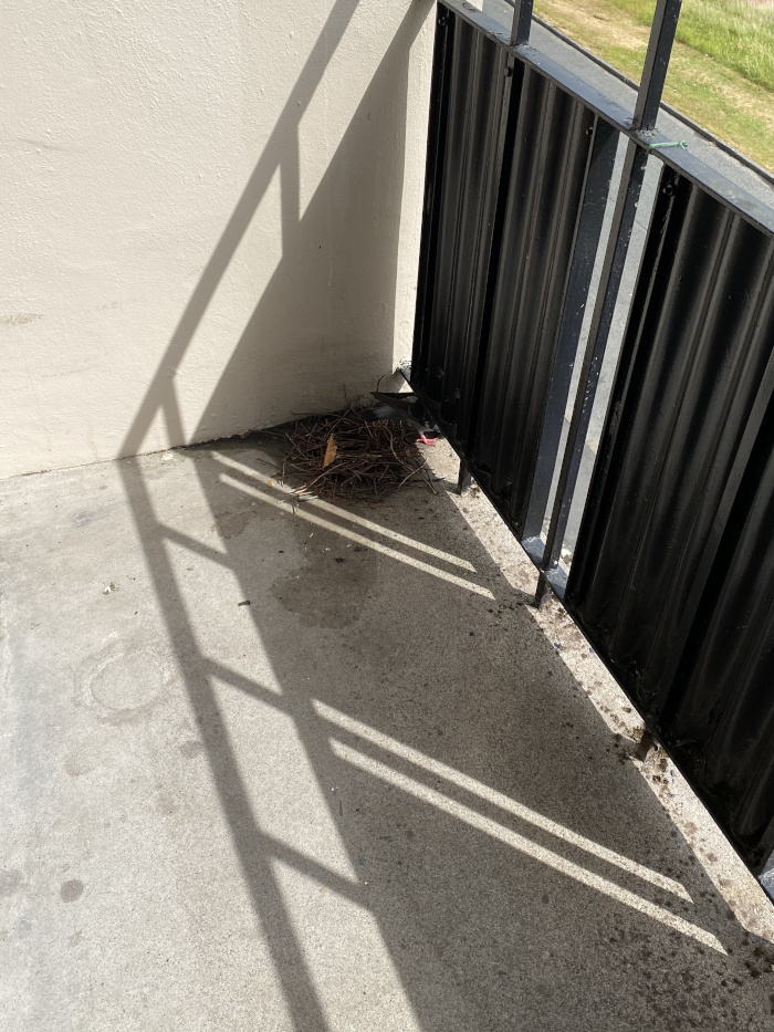 Overheard pigeons on my balcony, opened the door and two pigeons flew away from their nest. The nest, built recently (no eggs) was swept away, hours six hours later another nest appeared.