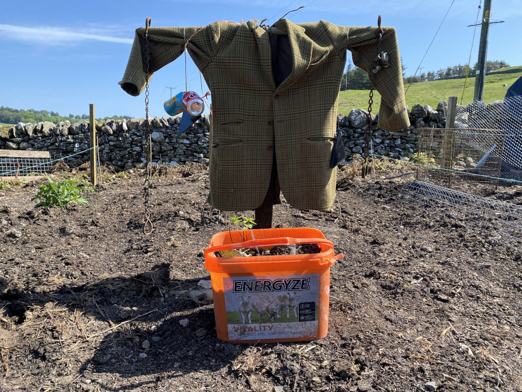 Our common rider scarecrow appears to be scarring off birds that are eating the leaves from our cabbage plants. We took so much effort to keep the wild rabbits out we forgot all about the birds!