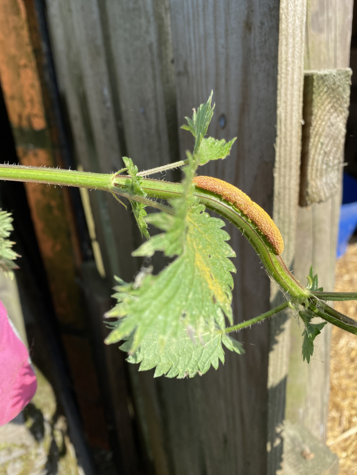 I was eager to cut down as many dock leaves with the new strimmer, two fully charged batteries ahead. Charlie started the tractor and cleared the paddock and surrounding areas with the topper. I ripped out many patches of nettles, mostly around two rhubarb patches, that have grown huge! I found wild life and then a strange oddity on the stem of one nettle.