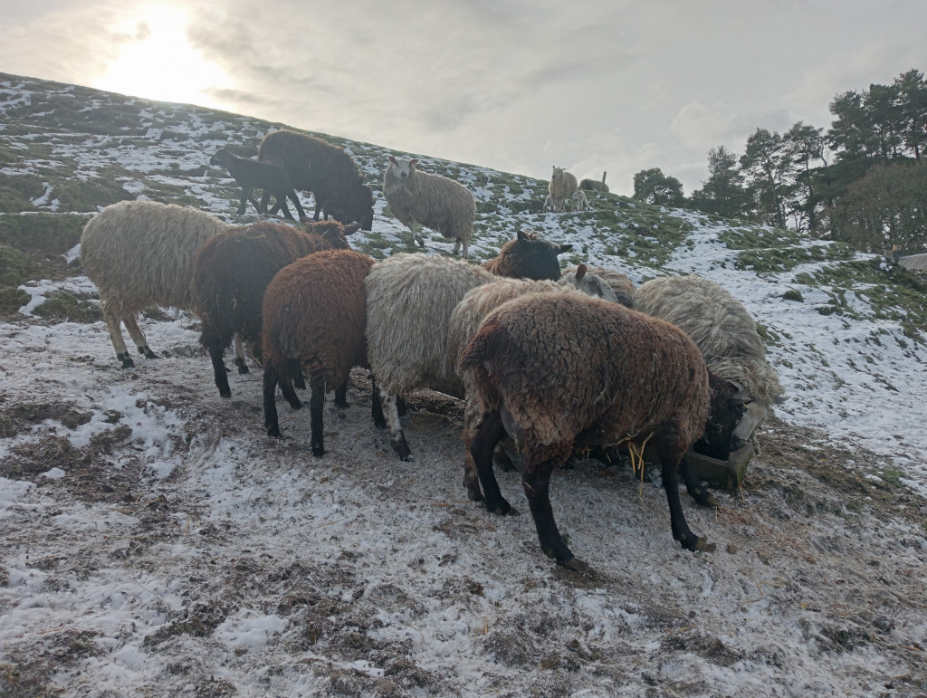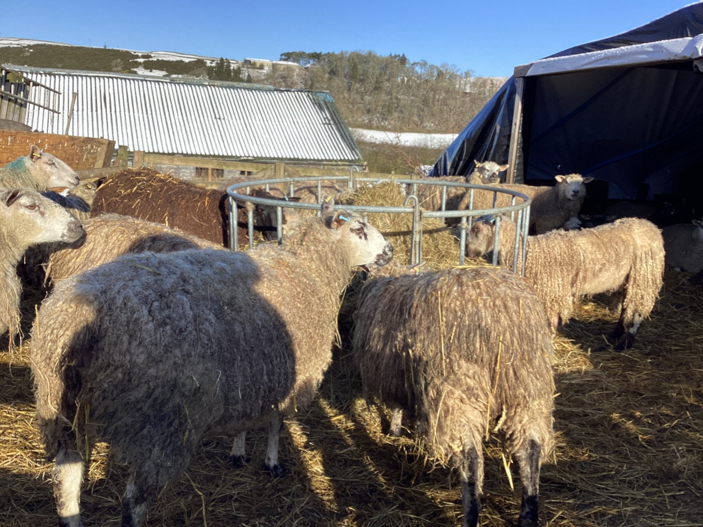Wow, what can I type, it snowed heavily last night, the Scottish Borders are looking so, so white, a white Scotland is truly, truly beautiful. Charlie bought the sheep down from the field, into shelter because of the sudden drop in temperature. The poly tunnel is crowded, so the ewes, although being fed plenty of silage have had to go without chaff this morning, for fear of a stampede trampling over the lambs.
