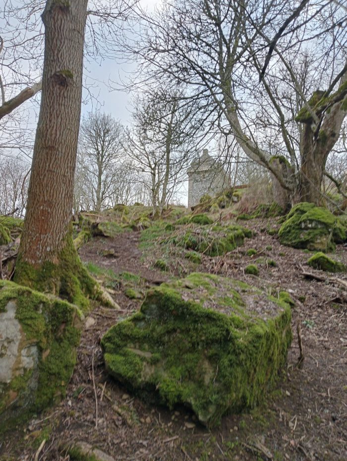Charlie has quit smoking for about a fortnight, I am enamoured by his effort, he's smoked for a long time, but I can see his health beginning to return from abstinence; noticeable on our ascent up this hillside. After several hundred yards a curtailed view of Minto's "Fat lips" tower became apparent.