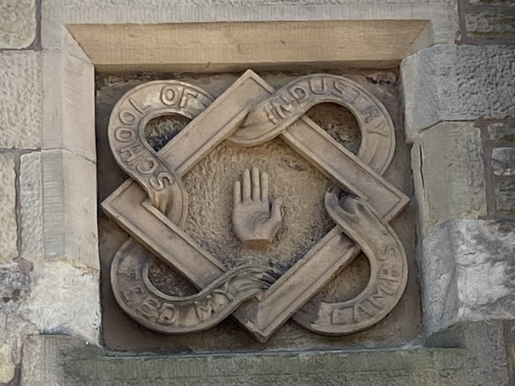 On our return to Hawick, we traversed previous towns, including Duns. During this journey, I observed a stone carving that featured the Red Hand and the word "Industry."