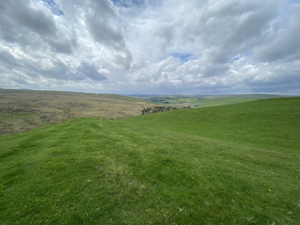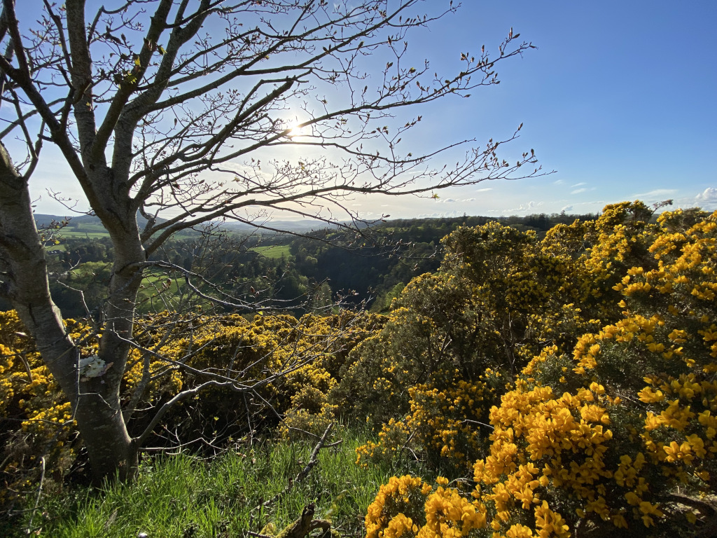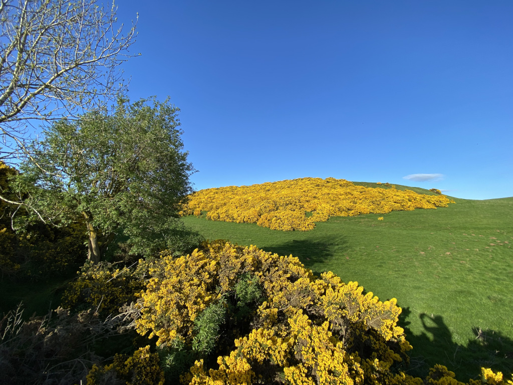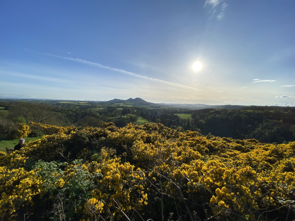 Charlie intended to take us to Scots viewpoint to view the Eildon hills after visiting the two grass keeps. The view was significantly more verdant, with bright yellow gorse announcing its presence, compared to my previous visit.